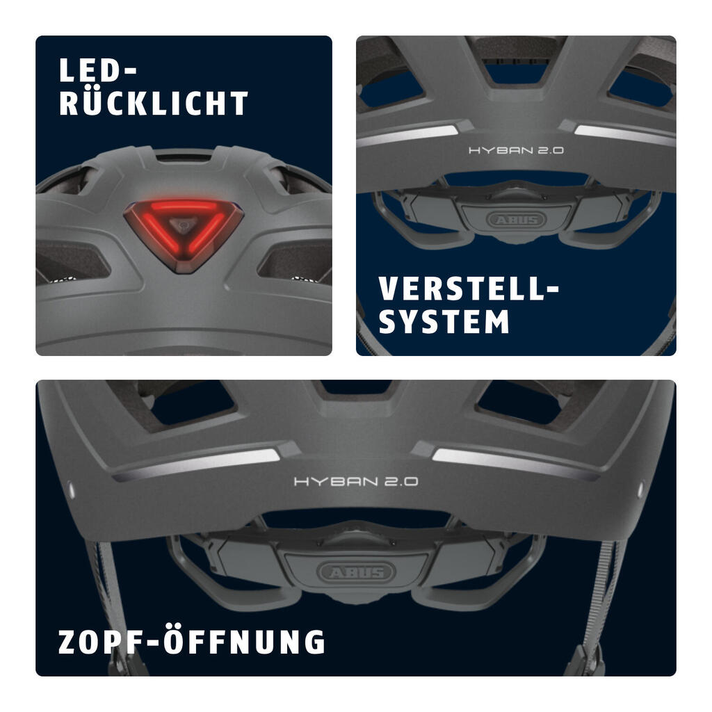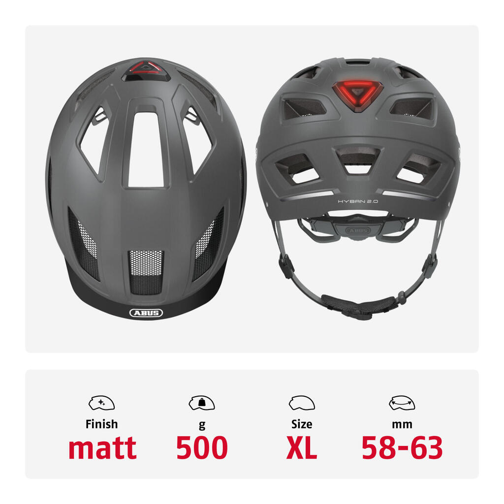 - Abus Helmet Hyban 2.0. Theabus hyban 2.0 is the perfect helmet for everyday use in the city. - The hyban 2.0 combines a particularly robust hard shell with huge air intakes: - In combination with the integrated, bright LED tail light, theHyban 2.0 is the perfect everyday helmet for the city. - Our bike helmets from the Urban series will appeal to people who use their bike every day, see their bike helmet as an accessory or prefer a simple elegance to go with their suit - if you want to get around town by bike, your requirements are different from those who take cycling seriously as a sport or who travel the world by bike. - With the Urbanaut bike helmet, we offer the growing number of cyclists optimal safety. Features : - Article group: 4 - Head size: 58 63 cm - Backlighting: yes - ABS hard shell: robust helmet made of EPS foam and injection molded outer shell - High visibility: high visibility thanks to reflectors - Anti-insect mesh: full protection against insects - Ponytail compatibility: perfect fit for people with long hair - Full ring: adjustable ring connected to the full head adjustment system - Excellent ventilation with 5 air inlets and 8 air outlets - Zoom Ace Urban: finely adjustable adjustment system with convenient adjustment wheel for a customizable fit - Large integrated LED tail light with 180° visibility