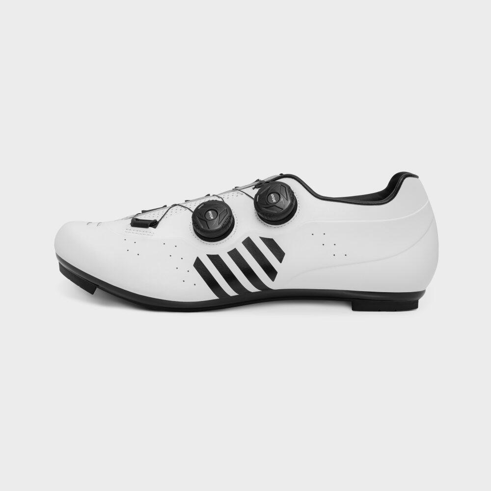 Lightweight microfiber leather cycling shoes with dual dial adjustment, breathable insoles, and stiff nylon sole for power transfer. Customization options available.