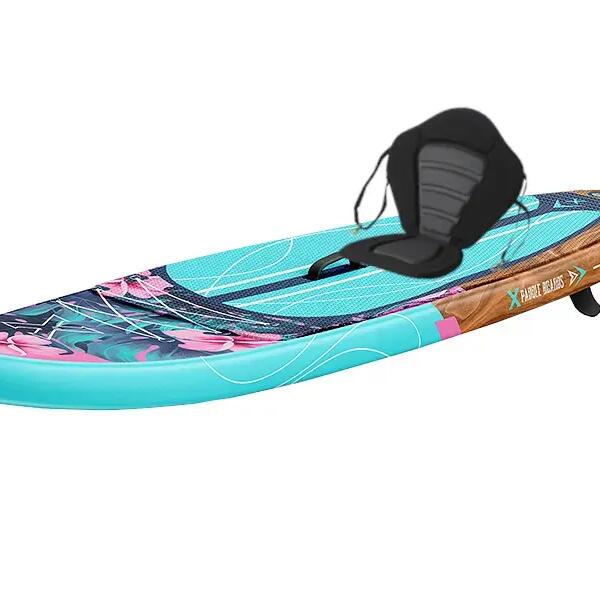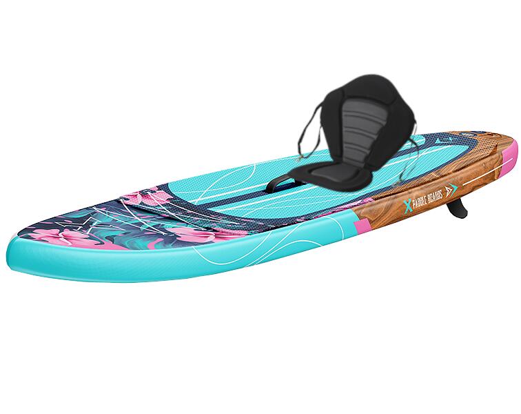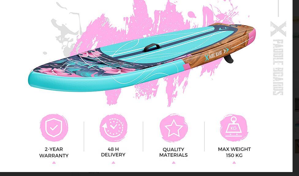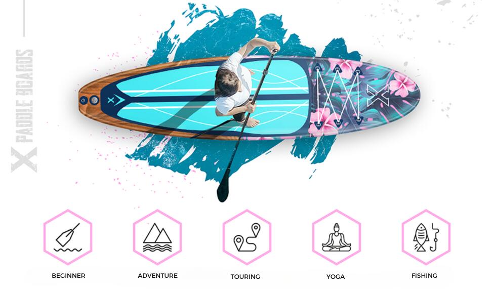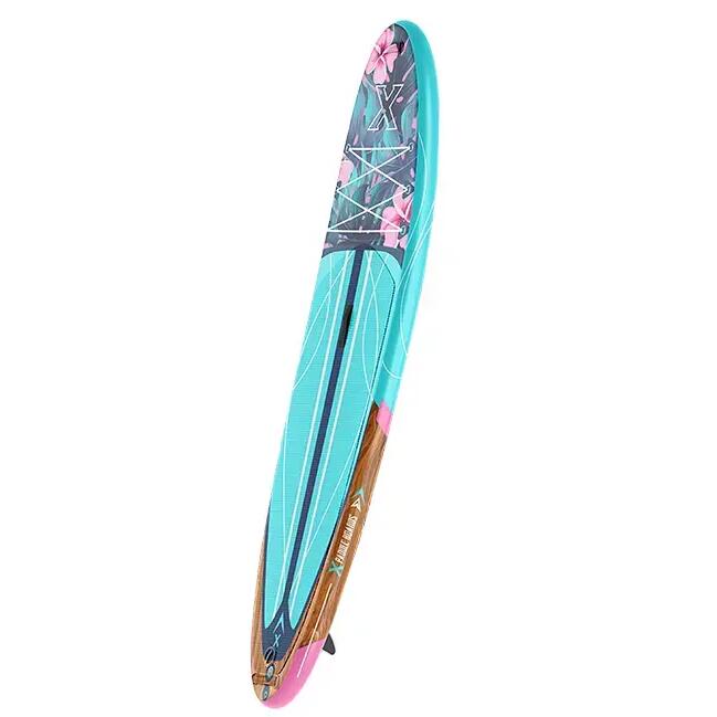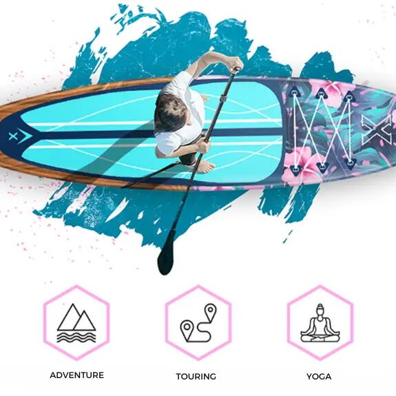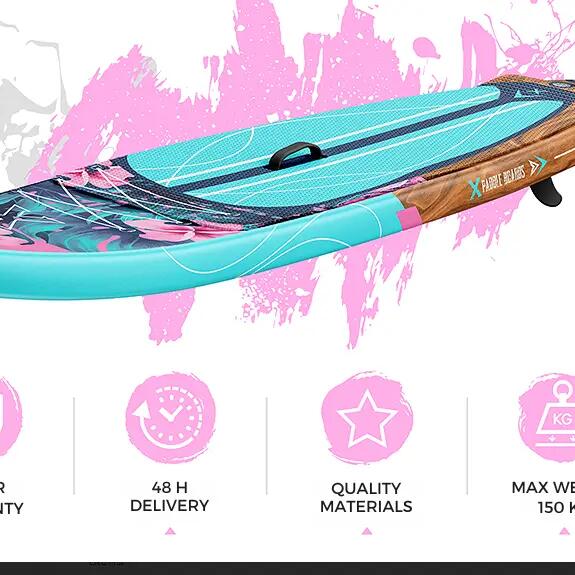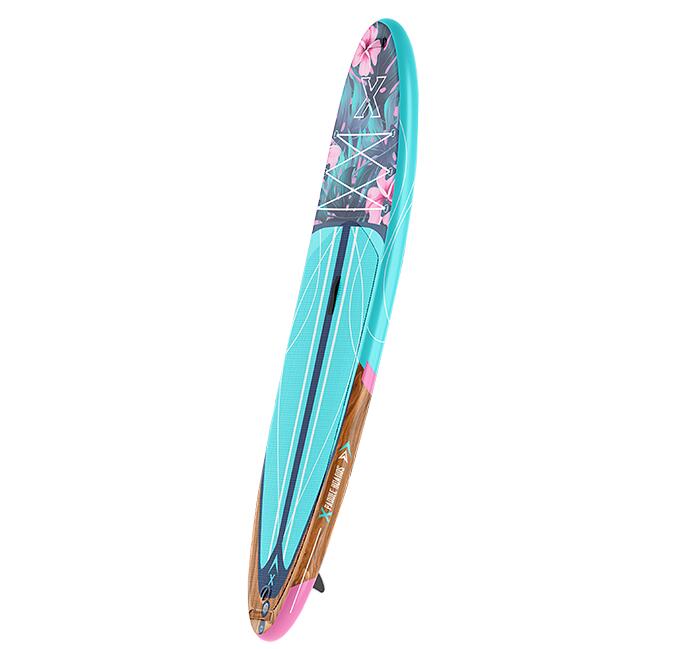 The Aloha is an incredible-looking paddle board, blending wood patterns with the turquoise waters of Hawaii and the pink of its flowers. Definitively feminine, this paddle board has been specially designed to offer the best women's paddle board on the market: a size perfectly suited for women who wish to start and progress in paddleboarding.