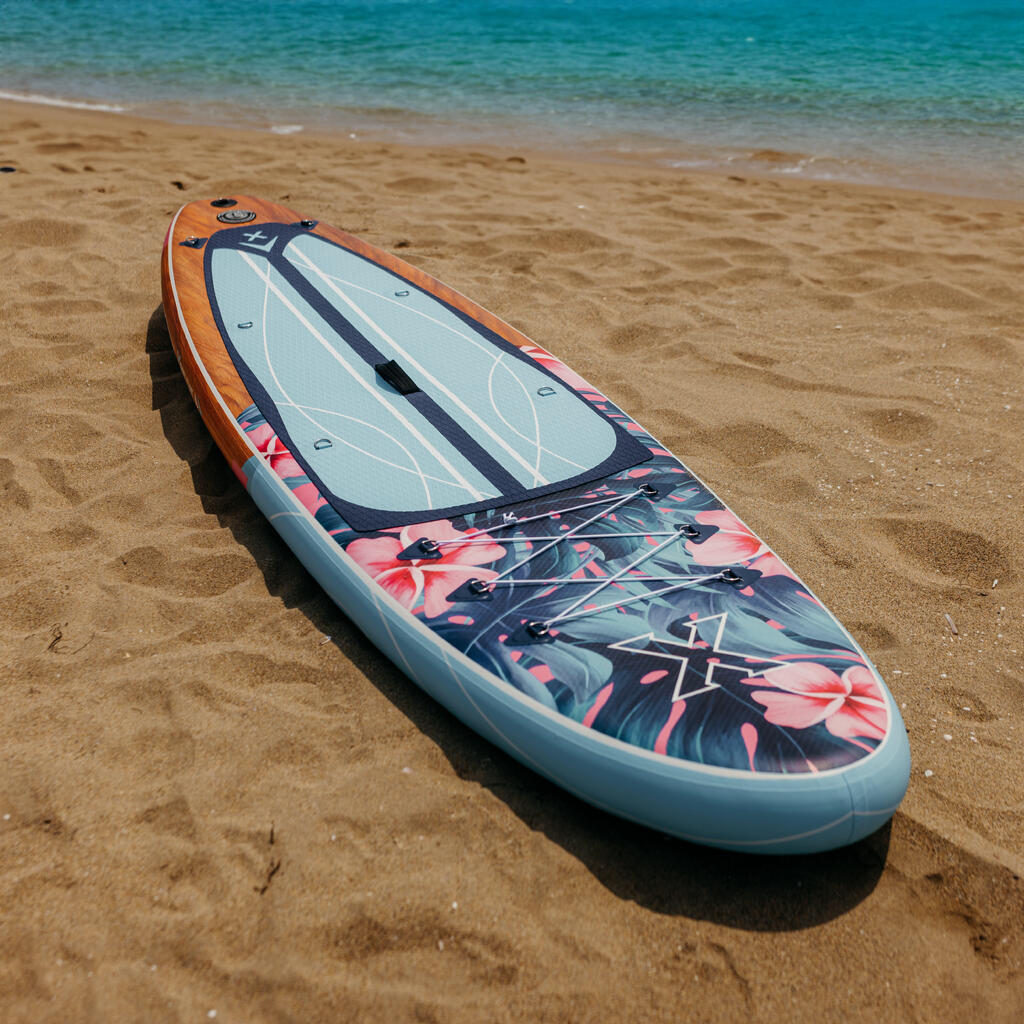 The ALOHA is a paddleboard with an incredible look, combining wood with the turquoise of Hawaiian waters and the pink of its flowers. Definitely feminine, this paddleboard was designed to offer the best women’s paddleboard on the market: a size perfectly adapted to women who want to start and progress in paddleboarding.