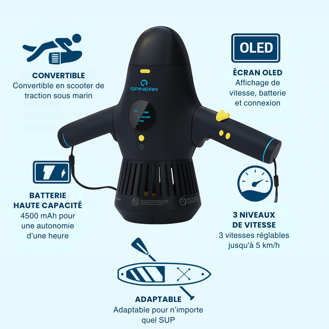This propulsion system is equipped with a lithium battery allowing you to navigate for up to 1 hour depending on the selected speed, and features an LED screen showing remaining battery level, WiFi signal, and the 3 different speed modes.