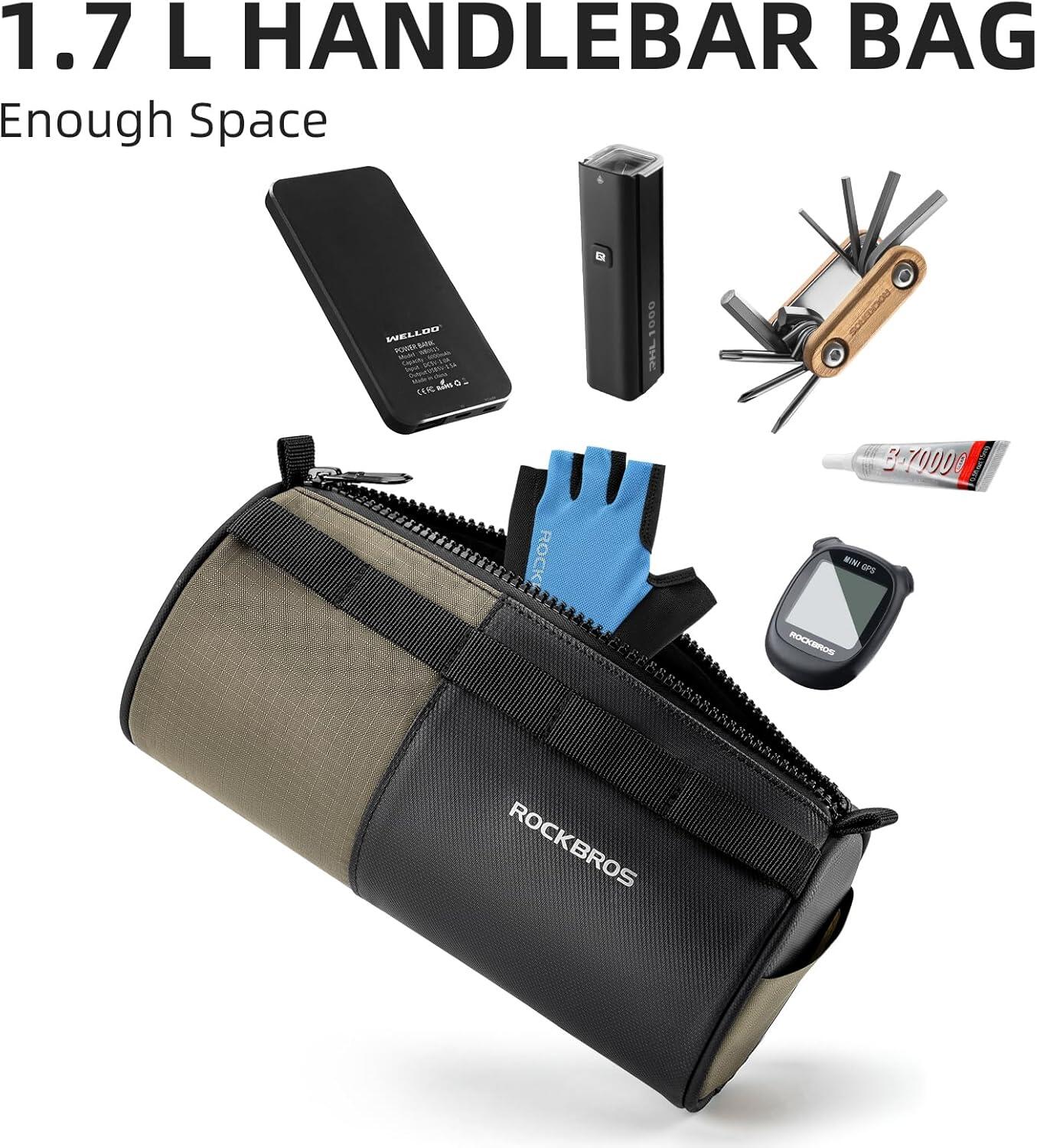 ROCKBROS Handlebar Bag - 1.7 L Discover the ROCKBROS handlebar bag, the ideal accessory for cyclists looking for a compact and versatile storage solution. Designed for practicality and security, it adapts to all types of bikes and easily converts into a shoulder bag. Key Features • Compact and lightweight: 1.7 L capacity, ideal for carrying your essentials (tools, energy bars, glasses, inner tube, mini-pump, etc.). • Versatile: 3-point handlebar attachment, compatible with road, mountain, e-bike, folding, and gravel bikes. • Smart design: Reflective logo for added safety, side pockets for small items. • Multifunctional use: Ideal for long rides, can carry a water bottle, snacks, or tools. Shoulder strap included for carrying it as a bag. Technical Details • Color: Black • Brand: ROCKBROS • Material: Polyester • Weight: 167 g • Capacity: 1.7 L • Service Type: Bicycle • Attachment: Handlebar, adjustable straps • Compartments: 1 • Closure: Zipper