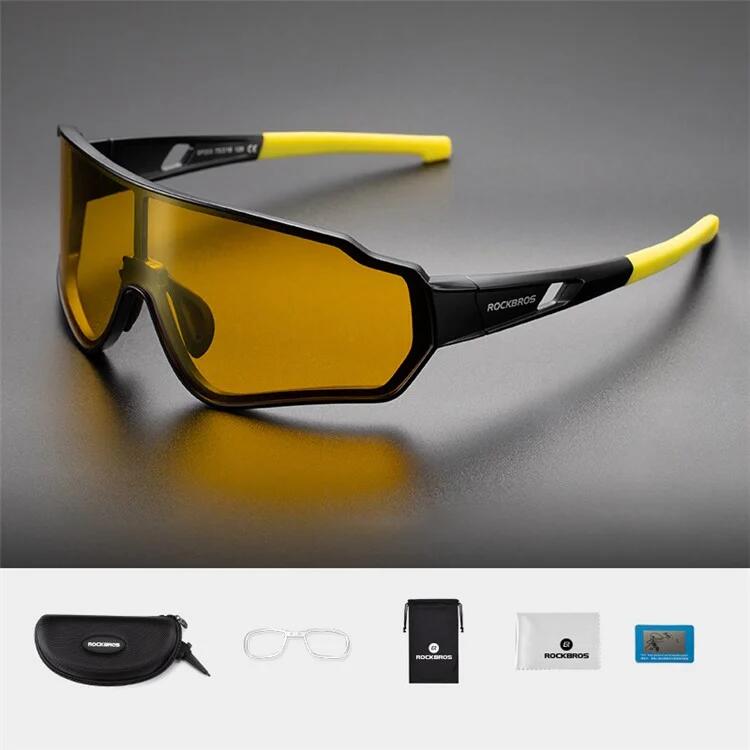 ROCKBROS 10161 Polarized Photochromic Cycling Glasses, Windproof, Sandproof, with Myopia Correction - Black/Yellow Polarized These glasses protect your eyes from UV rays, wind, dust, splashes, and impacts. They block strong light and effectively protect your eyes. The adjustable, soft nose pads reduce pressure on the nose. The comfortable and durable rubber temples won't irritate your ears. Specifications: Brand: ROCKBROS Weight: Approx. 29g Material: PC Lenses + TR Frame Package Includes: 1 x Glasses Case 1 x Myopia Correction Frame 1 x Glasses Pouch 1 x Cleaning Cloth 1 x Test Card