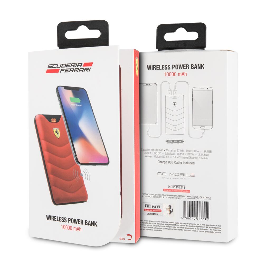 The Ferrari 10000 mAh wireless power bank lets you wirelessly charge two smartphones. Simply place a compatible smartphone on the power bank for fast charging. Additional devices can be connected using a cable. This Ferrari power bank features two USB ports.