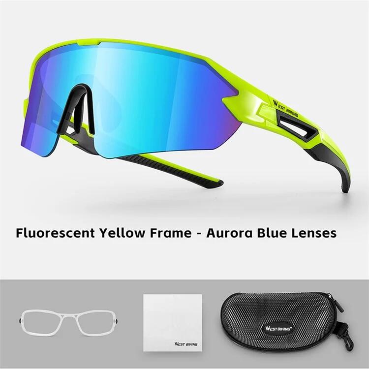 WEST BIKING Cycling Sunglasses – Style, Performance, and Protection for Your Adventures Enhance your cycling experience with WEST BIKING sport sunglasses, designed for men and women seeking performance and style. These wide-frame sunglasses are specifically designed for cyclists and are available in four different styles to suit all your preferences. High-Definition Vision and Vibrant Colors: The high-definition colored lenses of these sunglasses are designed to enhance color and contrast, accentuate details in your surroundings, and optimize your visual experience. They offer improved visual enjoyment and heightened awareness of your , essential for safety and performance while cycling. Unrivaled Comfort and Adaptability: Enjoy optimal comfort thanks to the flexible, skin-friendly temples, ensuring a comfortable fit, even on long rides. Their ergonomic design guarantees a perfect fit on your face. Protection and Easy Maintenance: These glasses feature dirt-resistant, waterproof, and easy-to-clean lenses, ensuring clear vision in all circumstances, regardless of the weather. Technical Specifications: Material: PC (Polycarbonate) lens / Rubber temples. Weight: Approximately 33 grams, for a lightweight feel you'll hardly notice. Applications: Ideal for cycling, running, hiking, and all other outdoor sports activities. Package Contents: 1 x Pair of WEST BIKING Cycling Glasses 1 x Myopia Glasses Frame (for those who wear prescription glasses) 1 x Cleaning Cloth for easy maintenance 1 x Hard Case to protect your glasses during transport and storage. Choose WEST BIKING cycling glasses to combine visual protection, optical clarity, and a distinctive style for all your sporting activities.