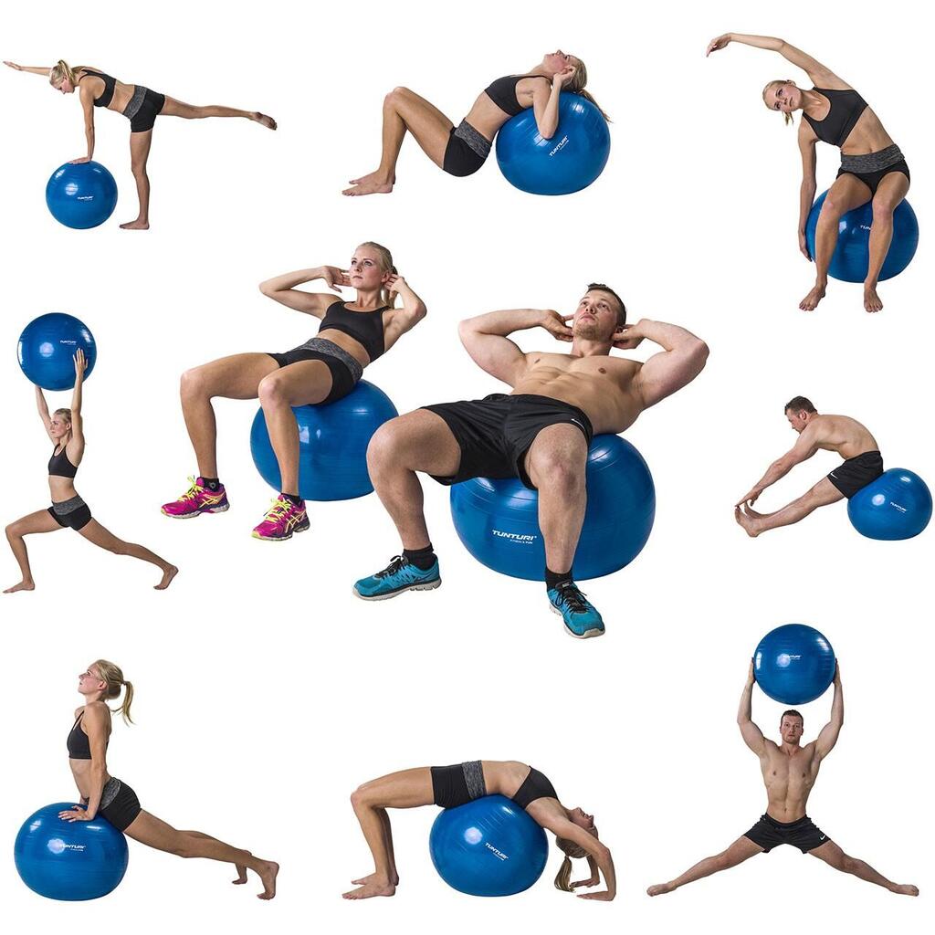 Tunturi tear-resistant ABS gym ball in PVC (petroleum), available in multiple diameters (45–90 cm) for Pilates, yoga, rehabilitation and use as an active seat.