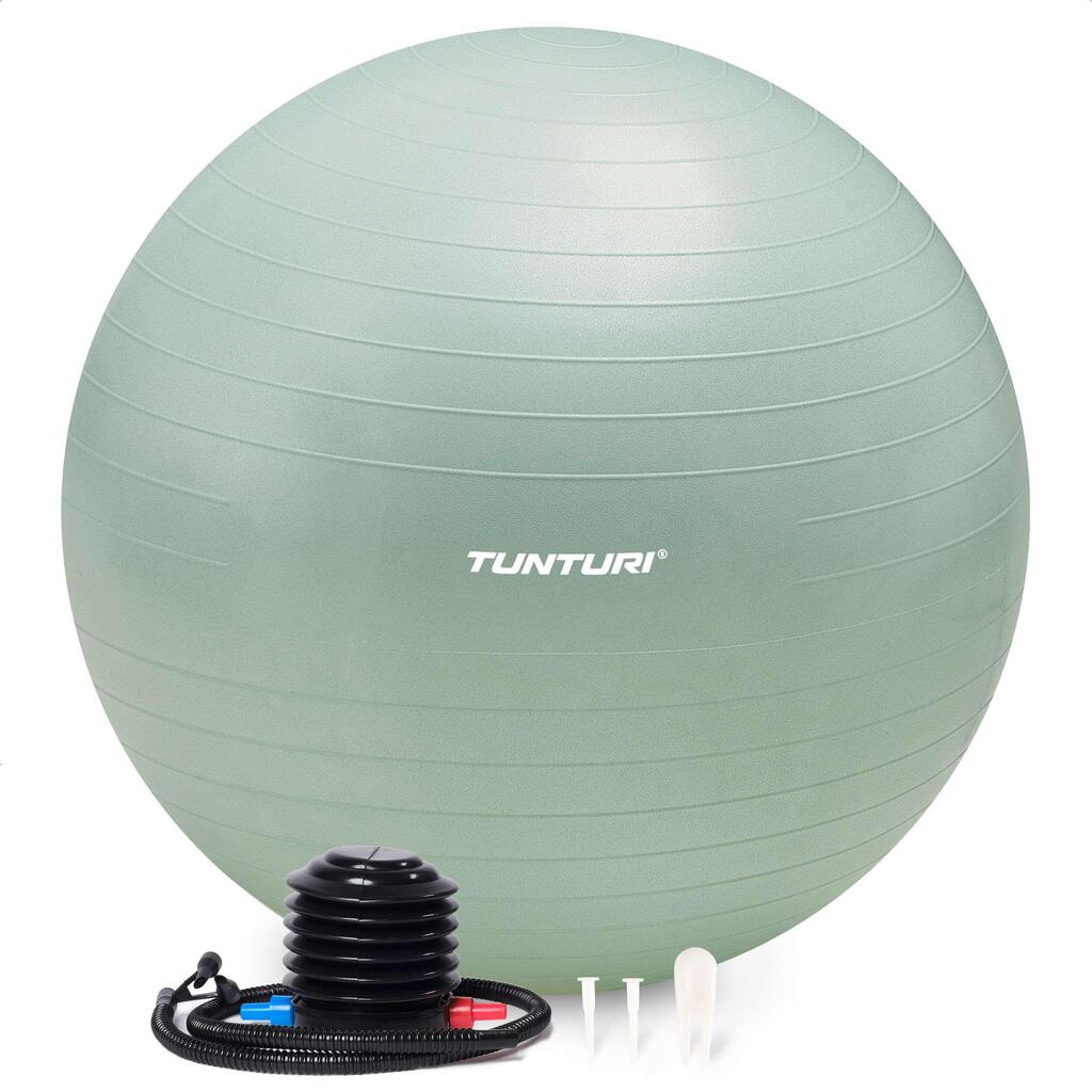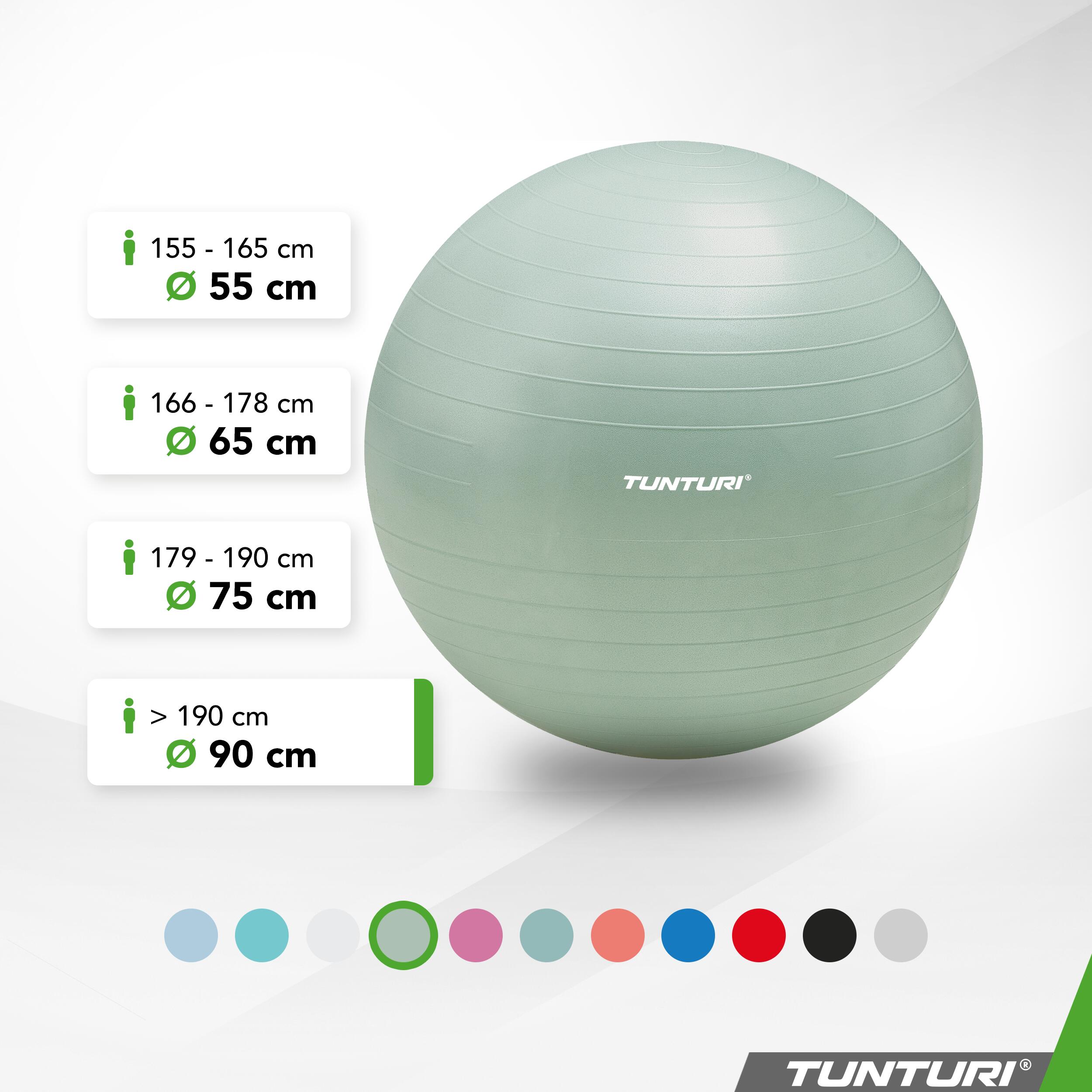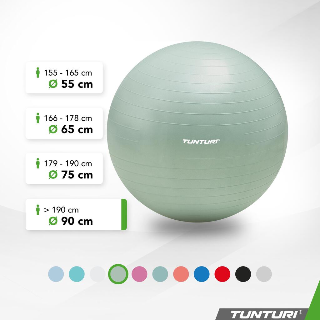 Tunturi tear-resistant ABS gym ball in PVC (petroleum), available in multiple diameters (45–90 cm) for Pilates, yoga, rehabilitation and use as an active seat.
