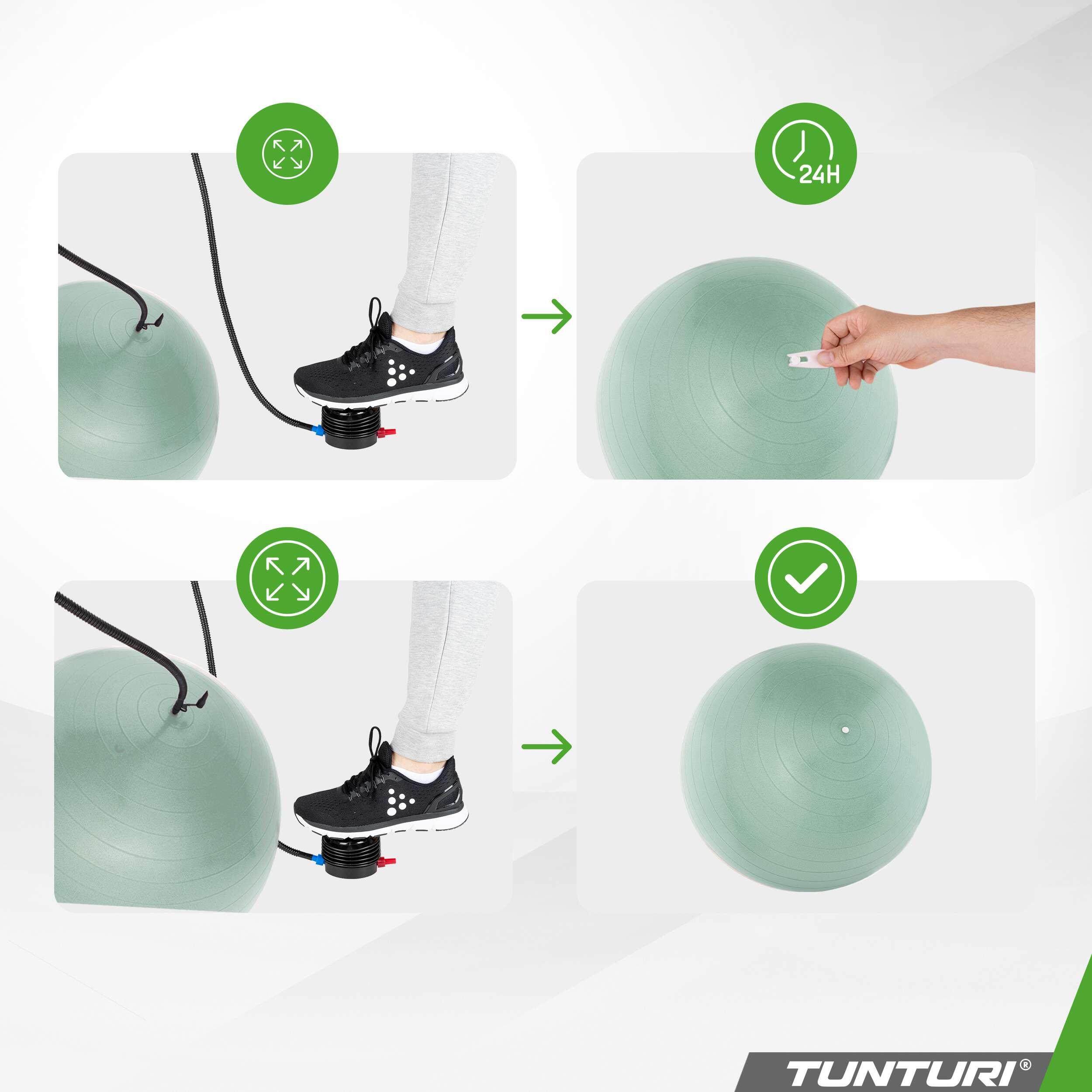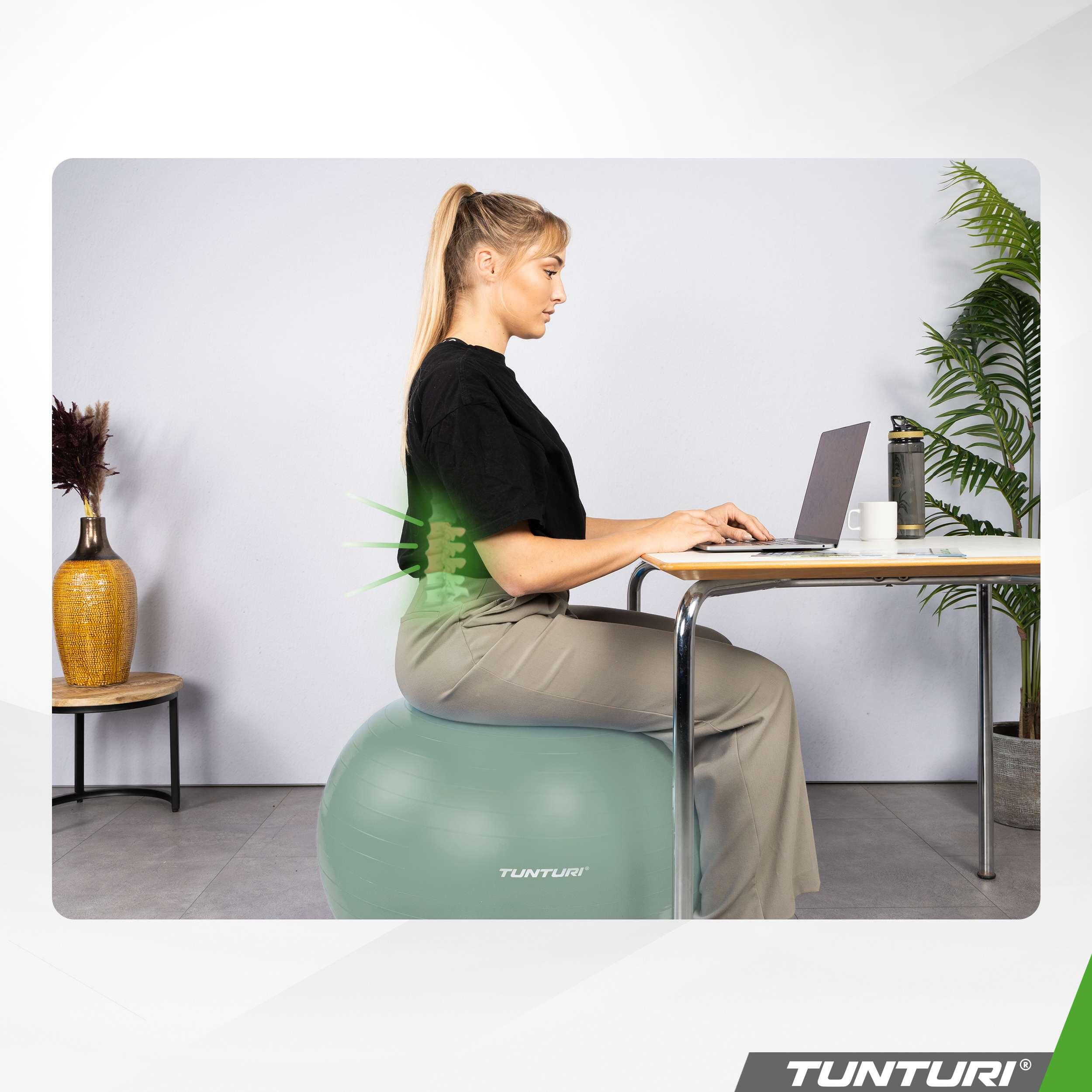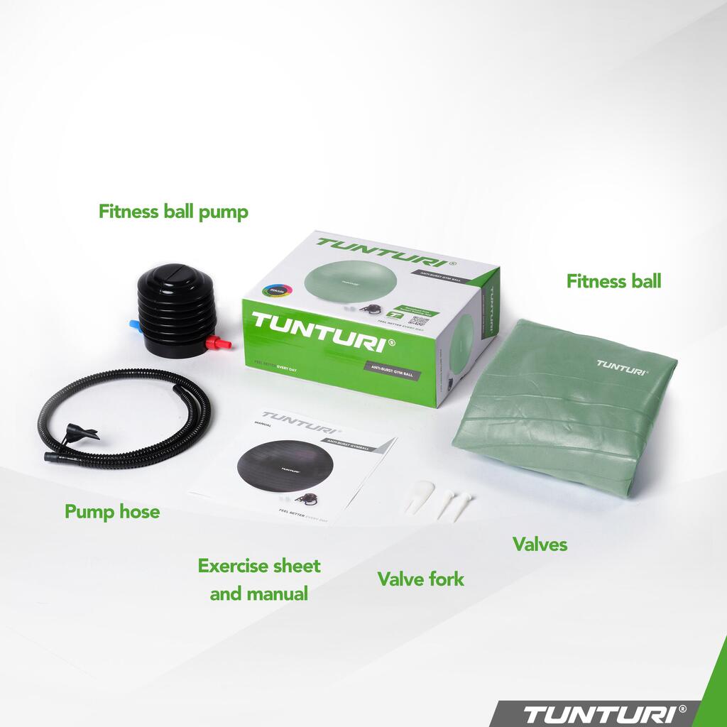 Tunturi tear-resistant ABS gym ball in PVC (petroleum), available in multiple diameters (45–90 cm) for Pilates, yoga, rehabilitation and use as an active seat.