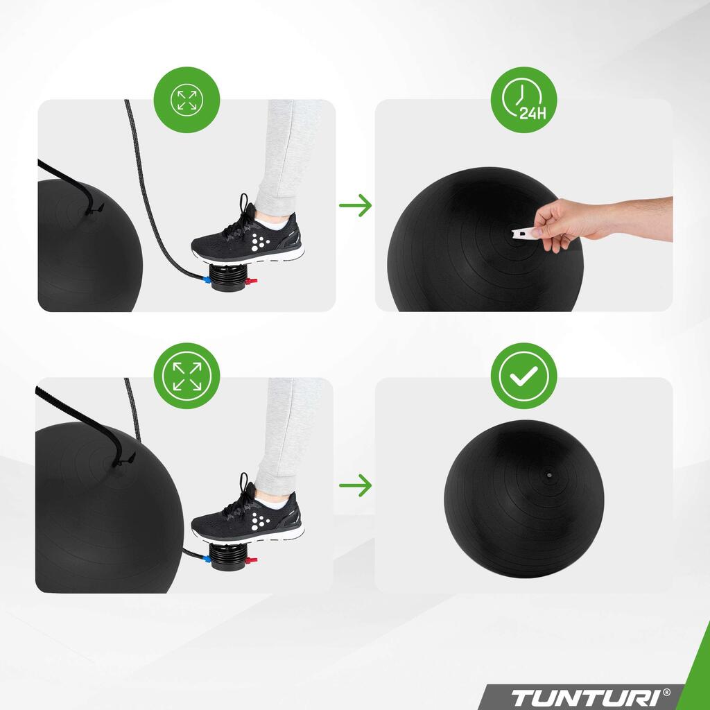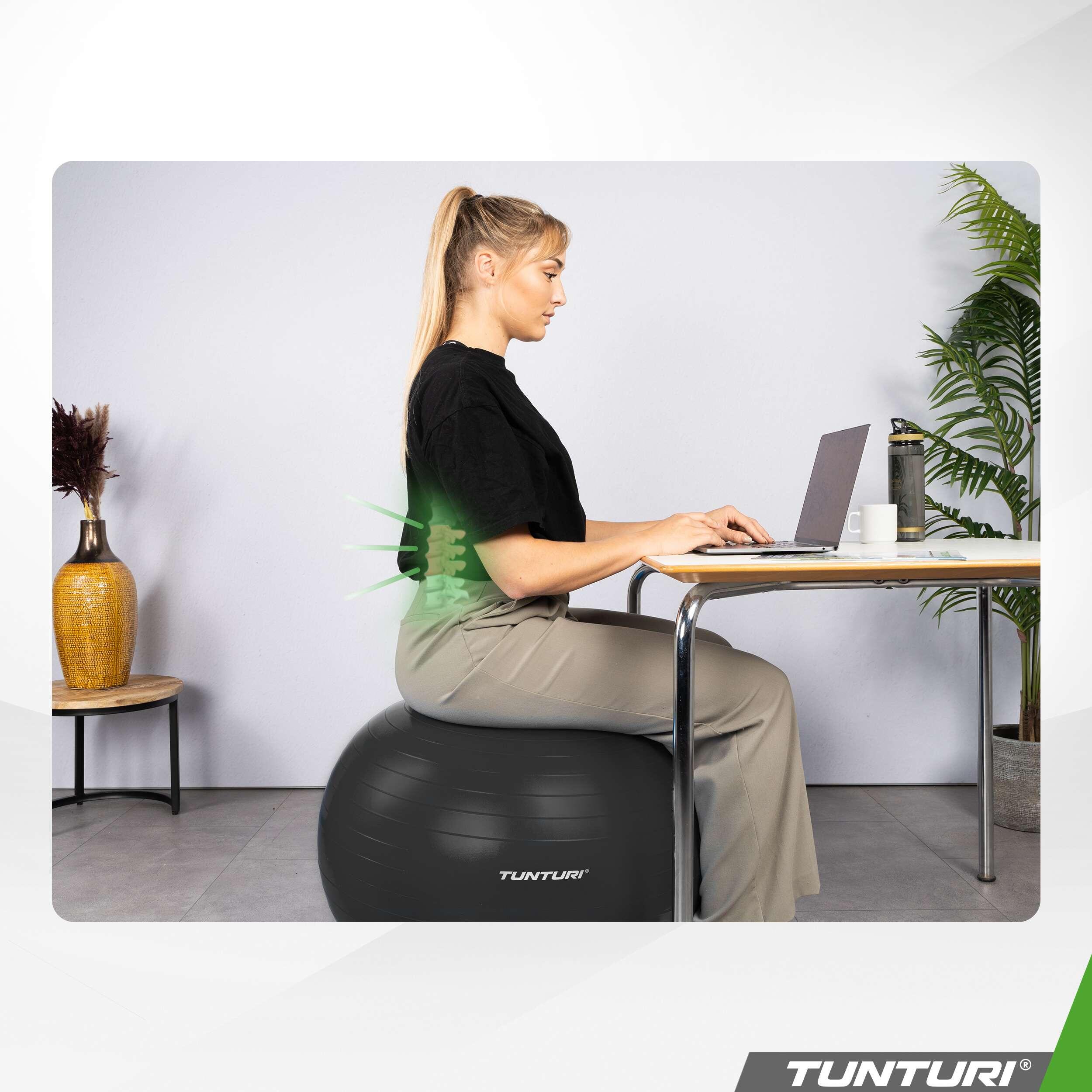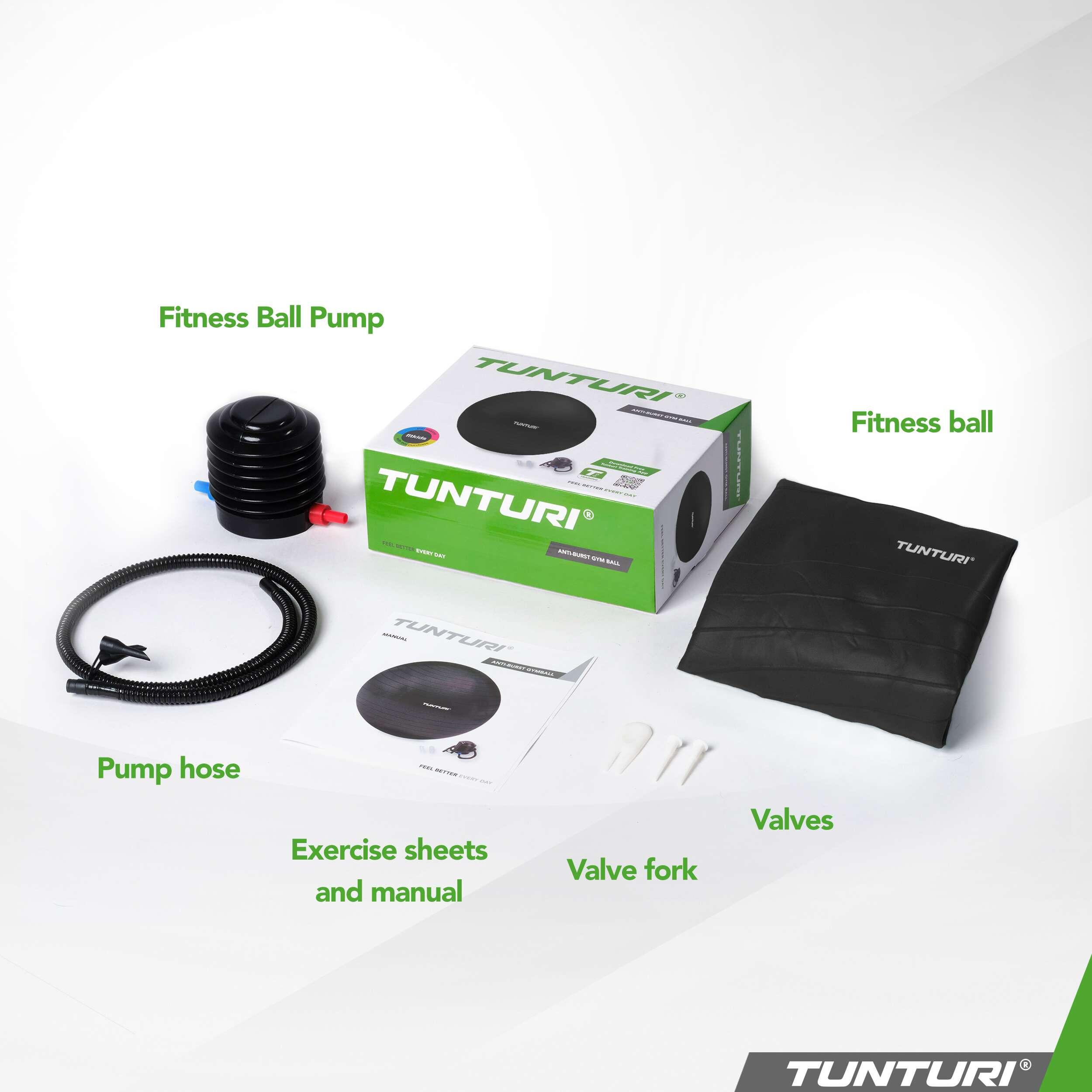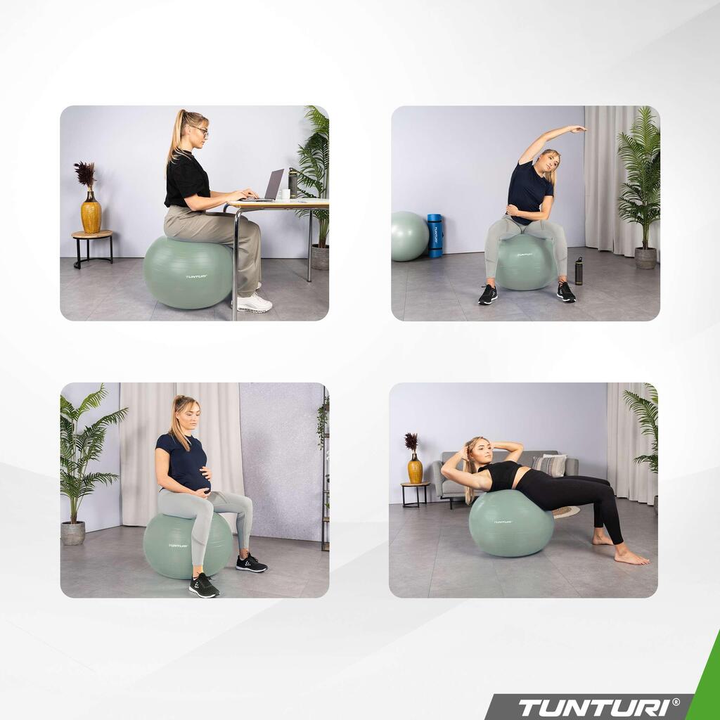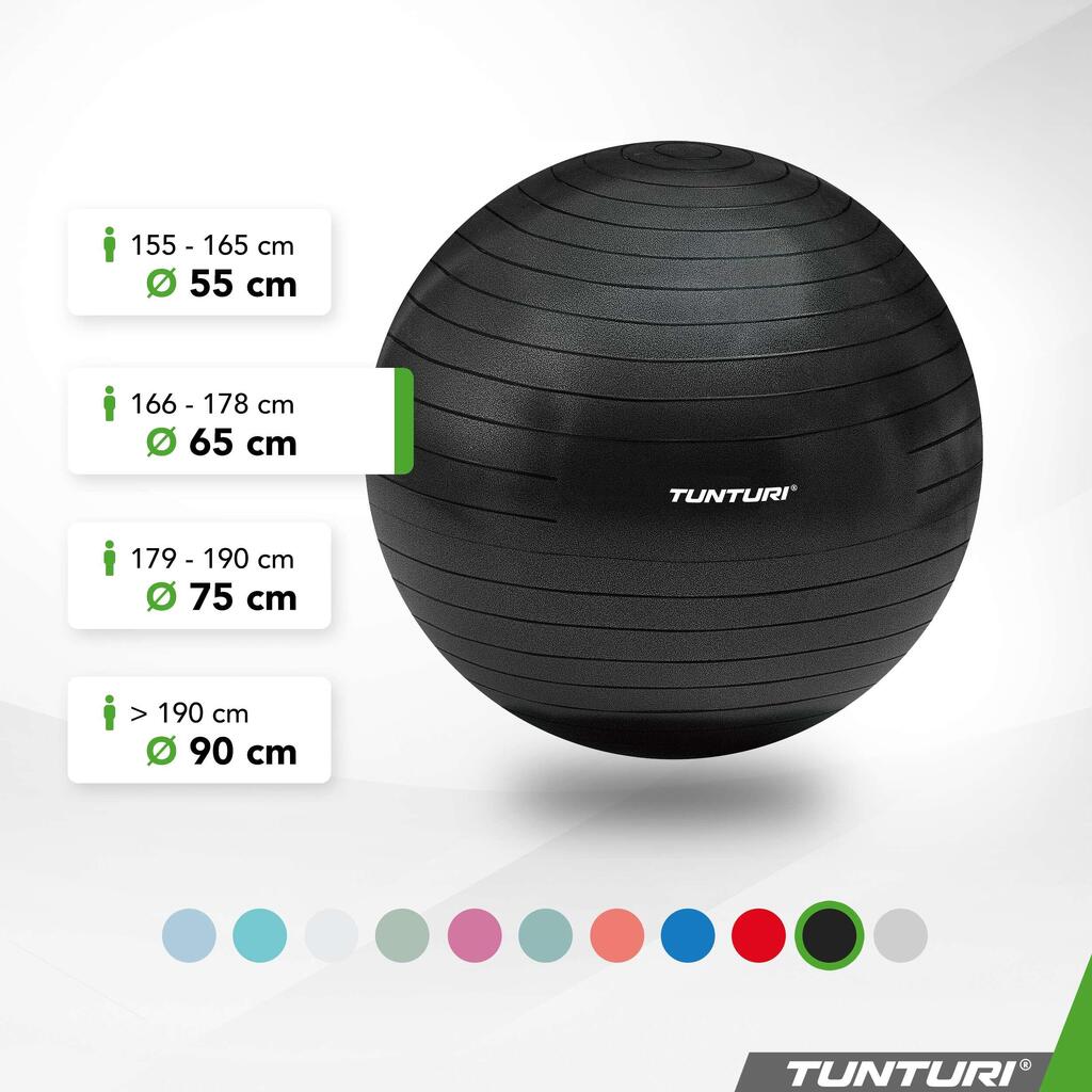 Tunturi tear-resistant ABS gym ball in PVC (petroleum), available in multiple diameters (45–90 cm) for Pilates, yoga, rehabilitation and use as an active seat.