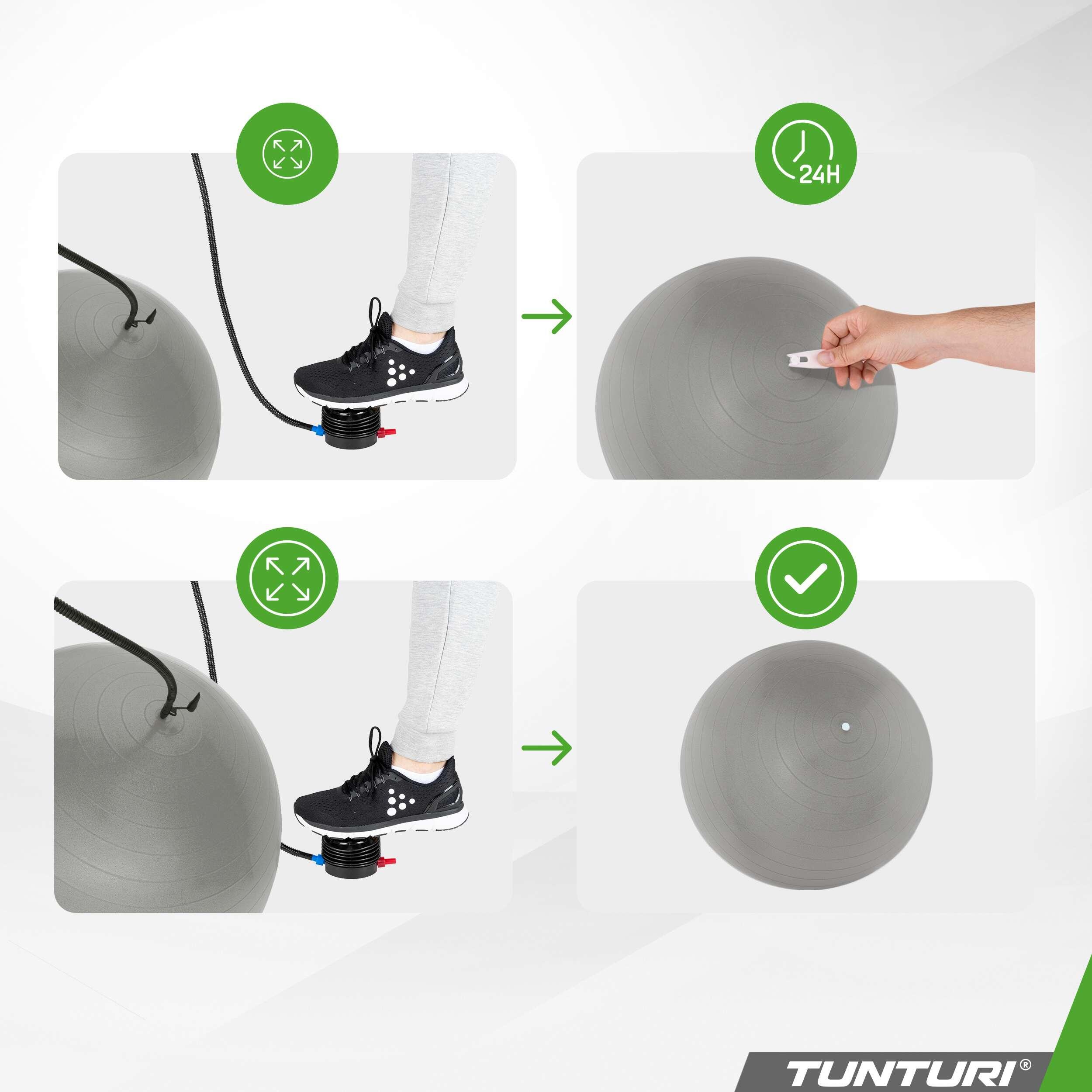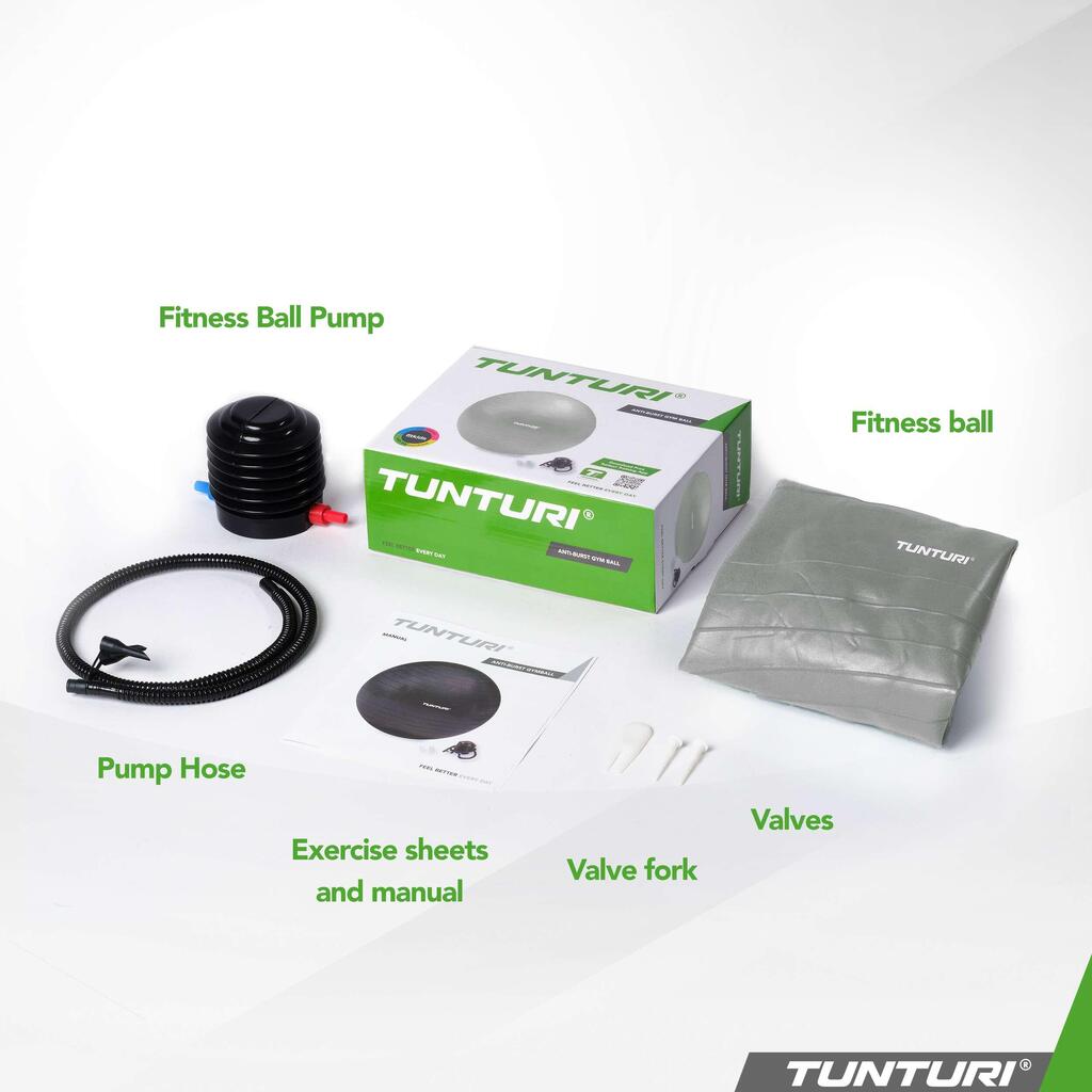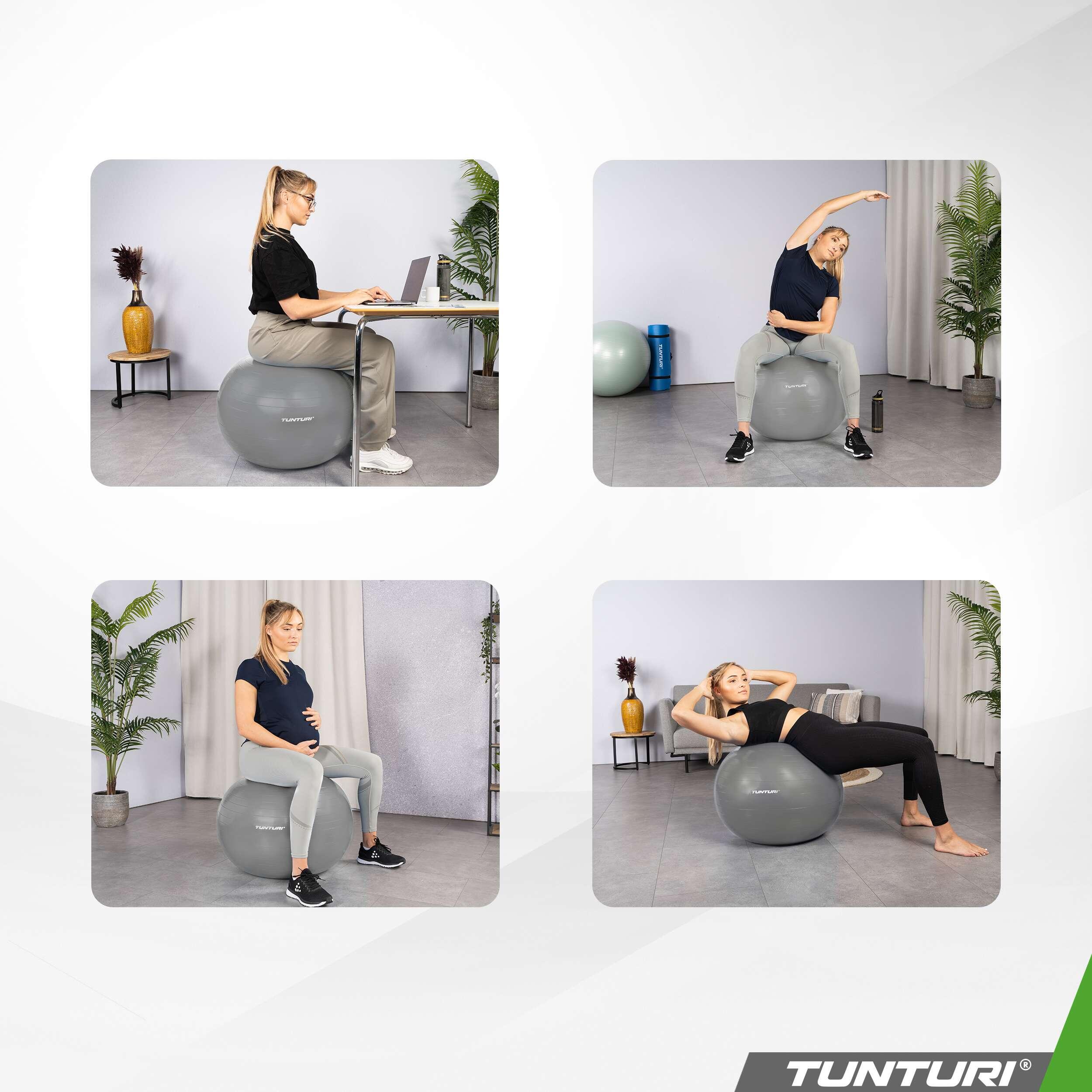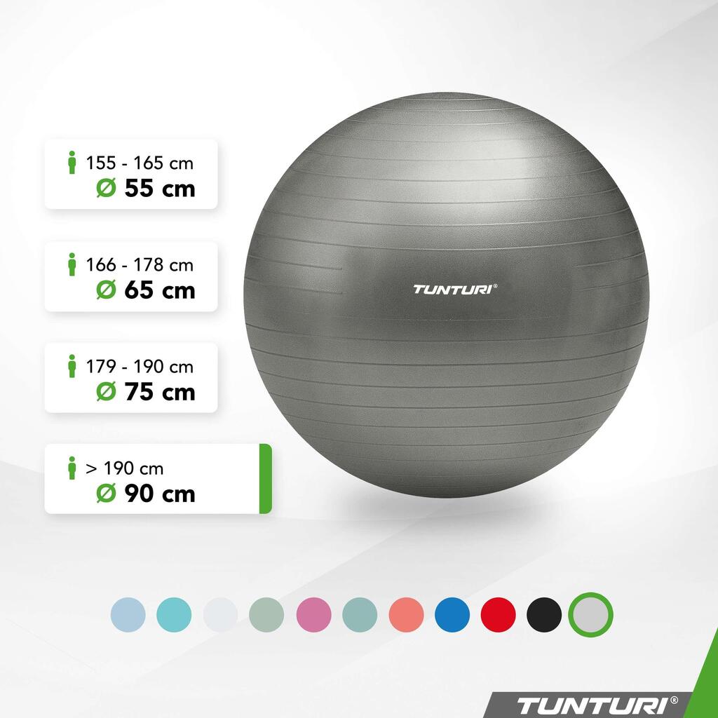 Tunturi tear-resistant ABS gym ball in PVC (petroleum), available in multiple diameters (45–90 cm) for Pilates, yoga, rehabilitation and use as an active seat.