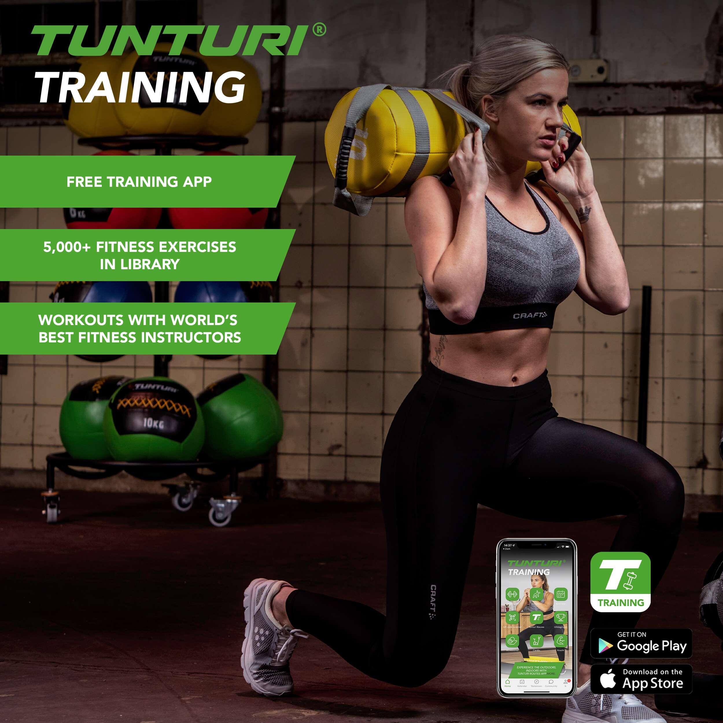 Increase your strength, stability and stamina with this Tunturi Strengthbag! The strengthbag comes with four sturdy handles and is suitable for different strength exercises. For example, go for a kettlebell training, traditional squats, bench press exercises or throw the bag as far as you can. Use your imagination and create your own fun and challenging exercises. The filling consists of sandbags weighing 10 kg in total. The bags are easy to remove in case you want to reduce the weight for certain exercises. **The benefits of the Tunturi Strengthbag - Sandbag - Fitnessbag** ✓ Solid fitness bag with different handles for training your arms, legs, shoulders and back ✓ Durable material: can be used both indoor and outdoor ✓ Combination of a kettlebell, medicine ball and weight bar ✓ Weight is easy to adjust by removing sandbags **Go for a fitness accessory with endless possibilities. Order this Tunturi Strengthbag today!** **Free Tunturi Training app included** Looking for help, inspiration or motivation for your training? In Tunturi Training, you will find thousands of animated fitness exercises, instructions and workout videos. These will help you get the most out of yourself and your Tunturi products. You can train solo and create your own training schedule, as well as attend group classes and make use of the community. The library is regularly updated so that new challenges and inspiration can always be found in the app. And the beauty of it is: Tunturi Training is 100% free! **About Tunturi** *Feel better every day*. That is the motto of Tunturi. Our origins lie in Finland, where two brothers started a bicycle shop in 1922. Now, over 100 years later, we are a Dutch company and a global brand. We support you on your journey to a healthy and fit body, a balanced mind, and a happy life. We do this with a wide range of cardio and strength training devices, accessories, and supporting apps. It’s a range that is constantly expanding and improving, with quality products and excellent guarantees. Can't find your way or do you have questions? Our service team is ready to assist you. We believe that everyone has the right to enjoy good and healthy exercise, including children. That is why we donate an amount of every purchase you make to the Fitkids foundation. Together, we ensure that children with disabilities can play a sport. **Overview specifications** • Length: Tunturi Strengthbag 56 cm. • Diameter: 23 cm. • Weight: 10 kg. • Four anti-slip rubber handles • Color: Yellow | grey • Material: Bizonyl | Sand filling • Available in different weights (colors)