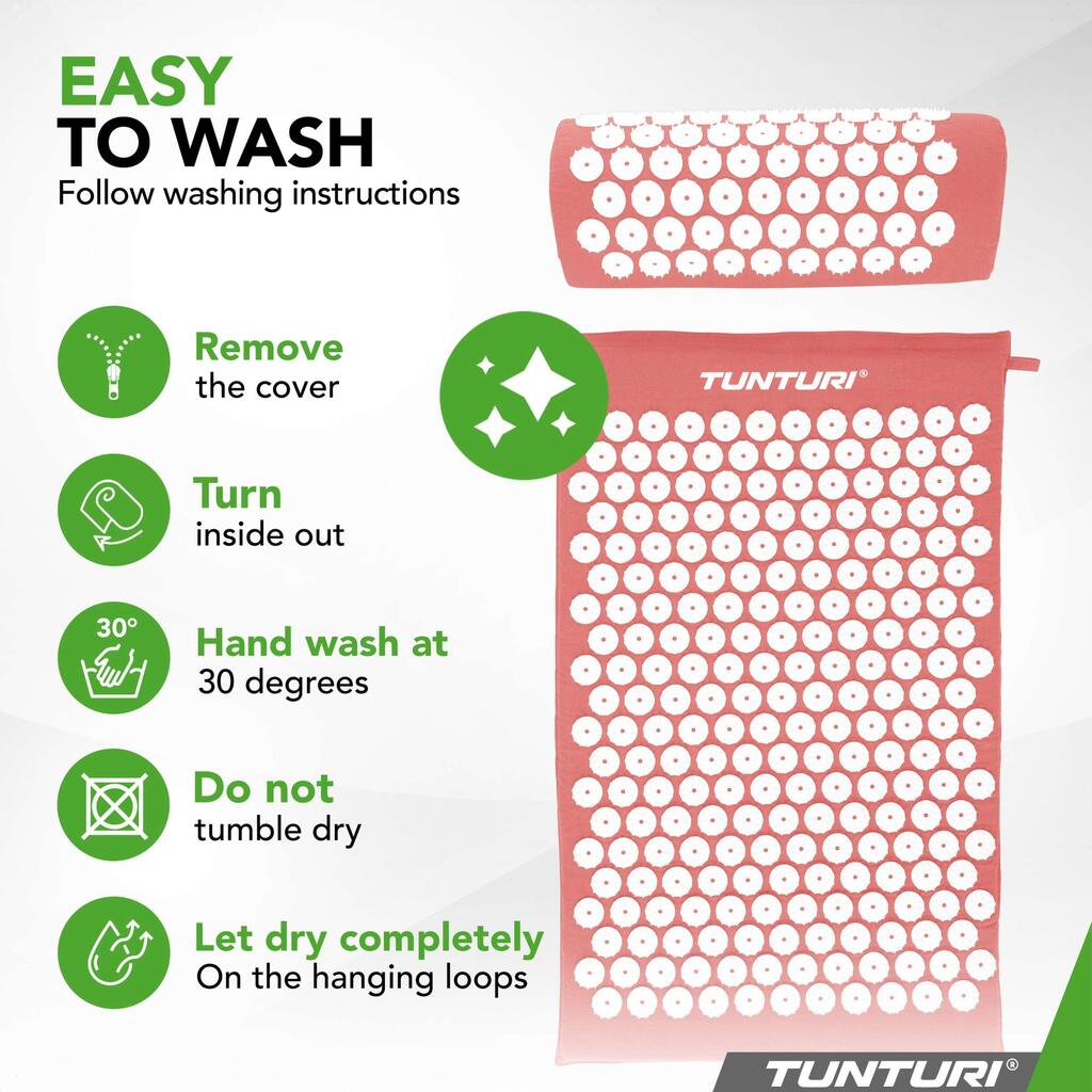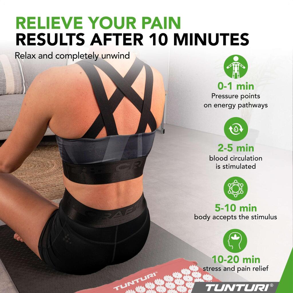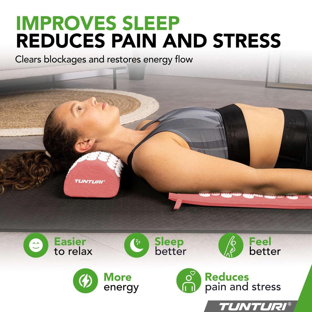Tunturi Acupressure Mat with Pillow: Reduces pain and stress, improves circulation, sleep, and energy. Just 10 minutes a day for results. Skin-friendly cotton, washable covers. Includes carrying bag.