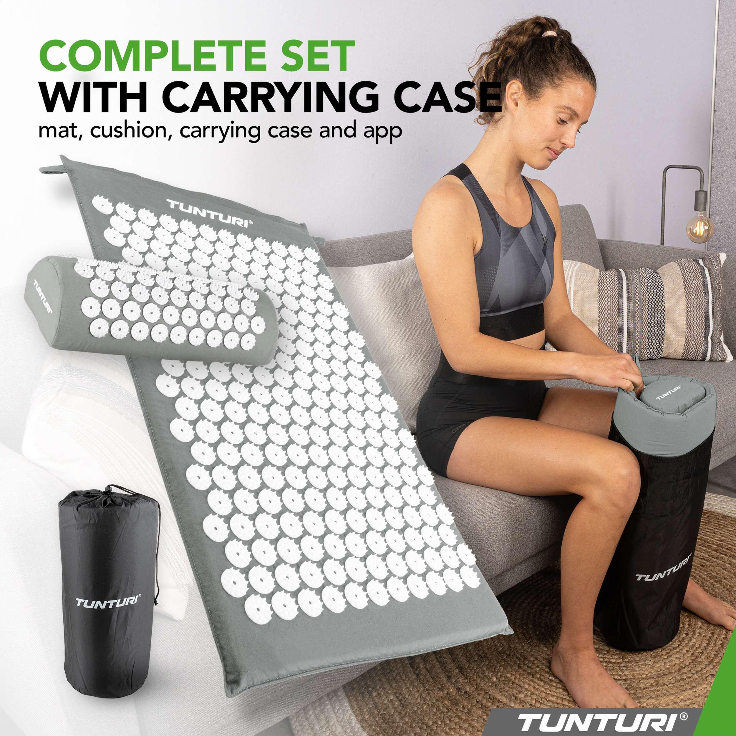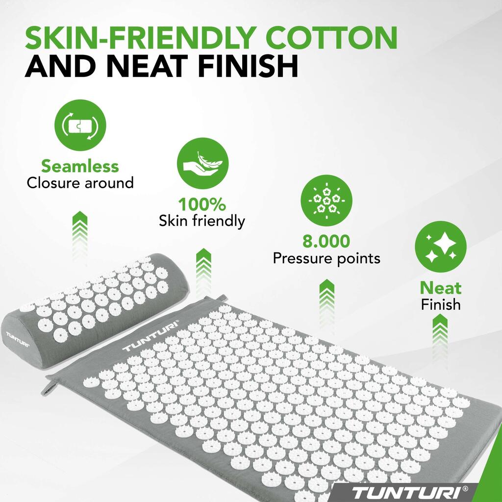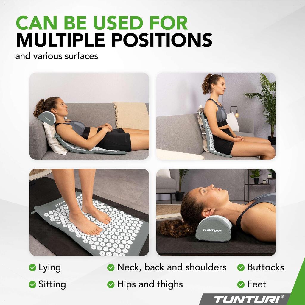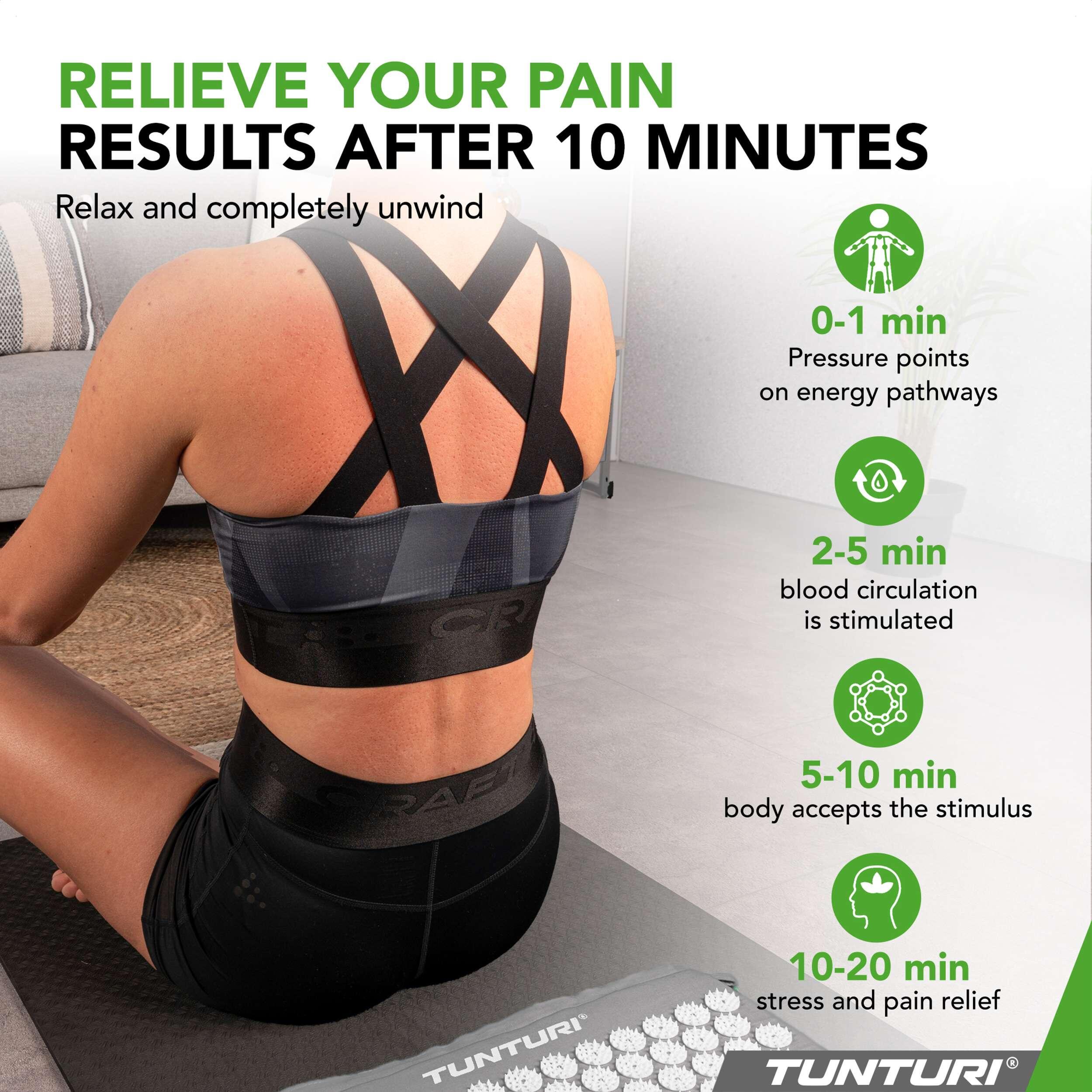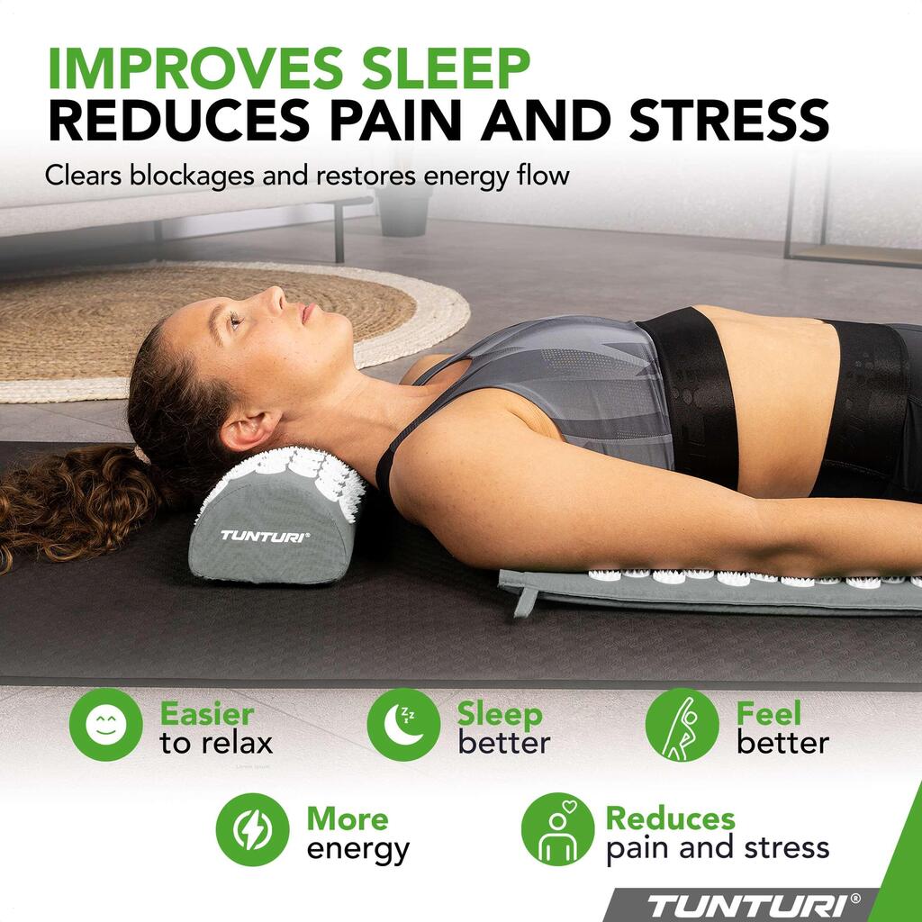 Free yourself from stress, sleep disturbances, back pain, and low energy levels with the Tunturi acupressure mat including cushion. Just a few minutes a day activate your body’s self-healing abilities. More than 8,000 strategically placed pressure points help release tension, relieve pain, stimulate energy flow, and improve sleep quality. Experience deep relaxation and feel your well-being rise to a new level.