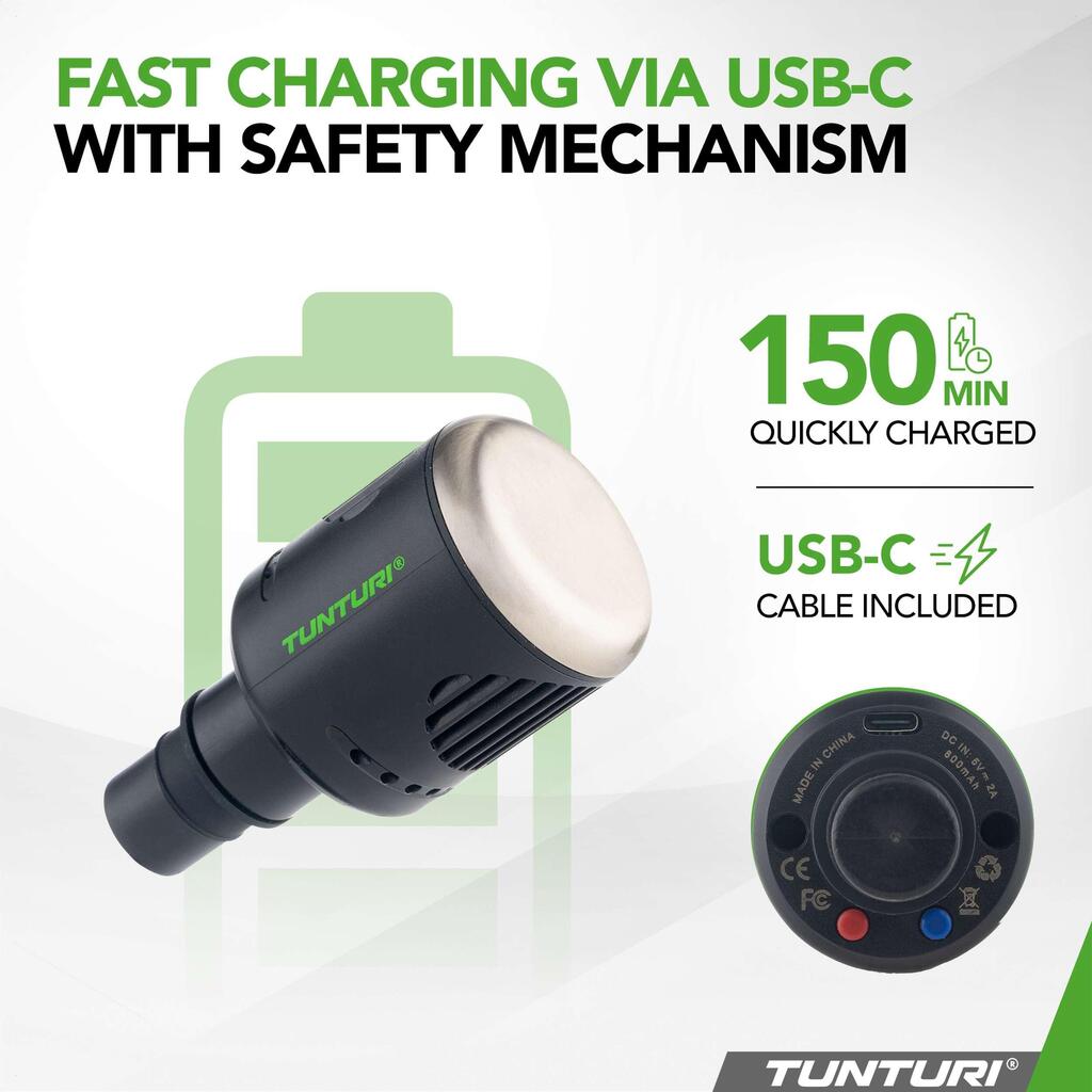 The attachment can be charged using the included USB-A to USB-C cable. The head is fully charged in 2.5 hours. When heating, the battery lasts 2.5 hours at level 1 and 2 hours at level 2. When cooling, the battery lasts 1 hour at level 1 and 40 minutes at level 2. For safety reasons, the device switches off automatically after 15 minutes.