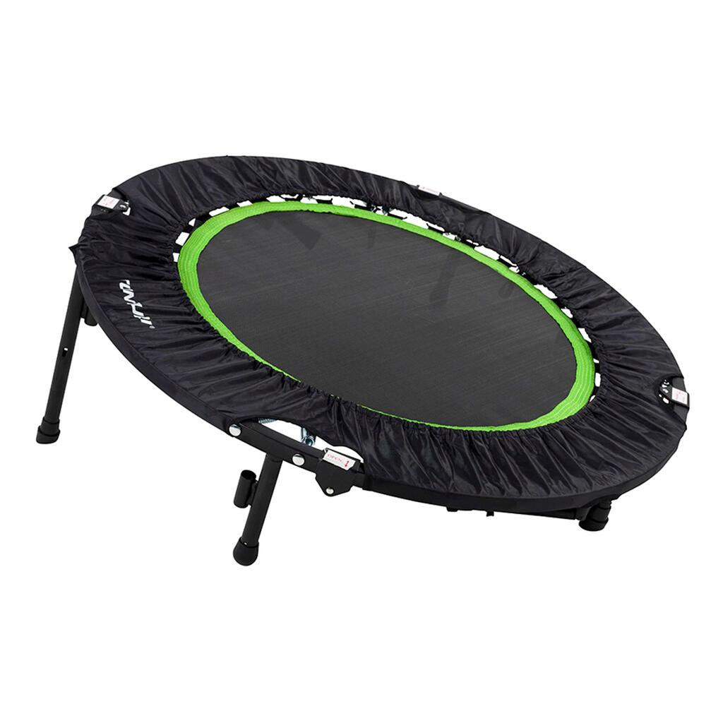 Tunturi folding fitness trampoline, robust and compact, with stability handle and metal springs for low-impact cardio training.