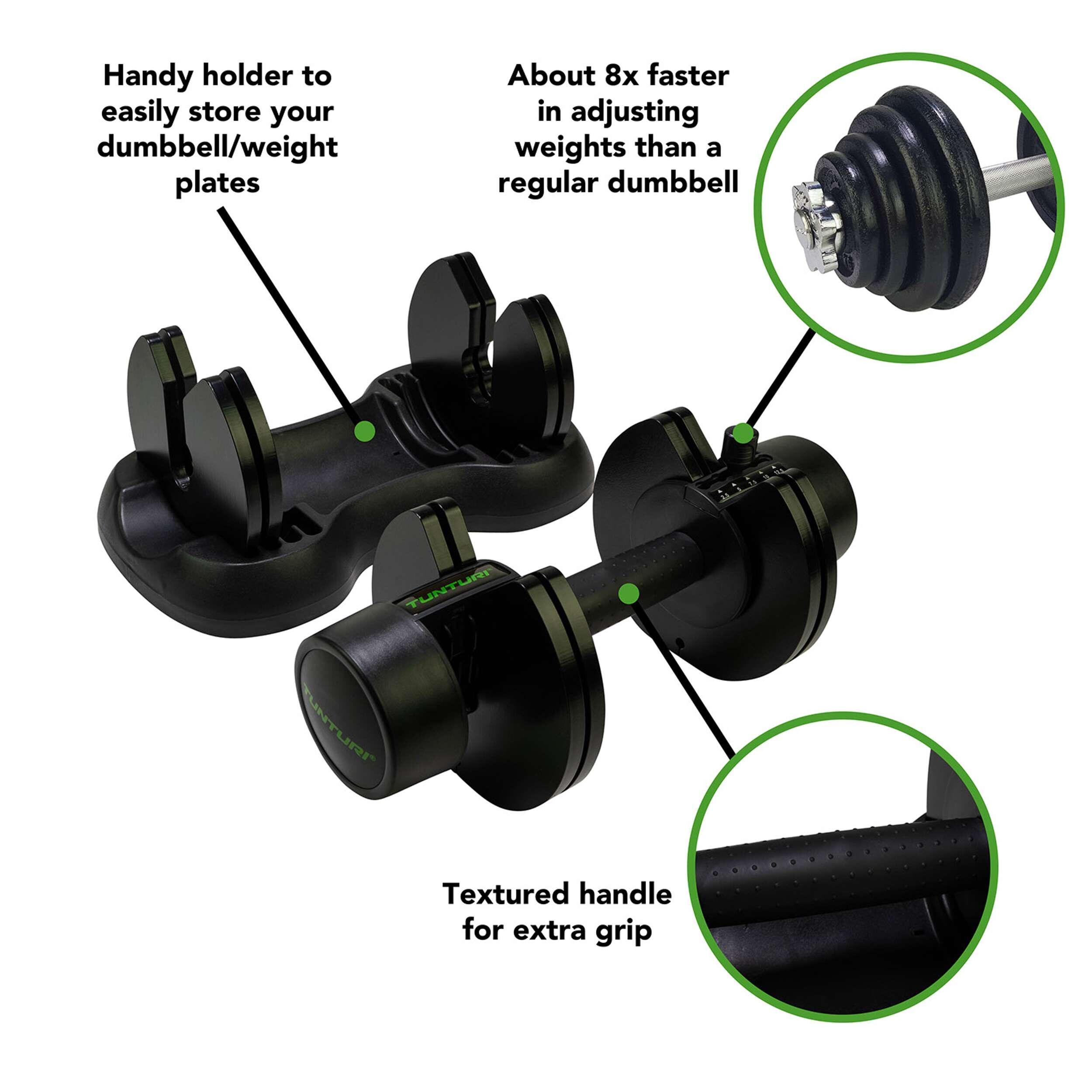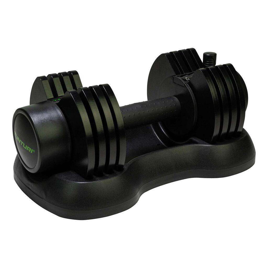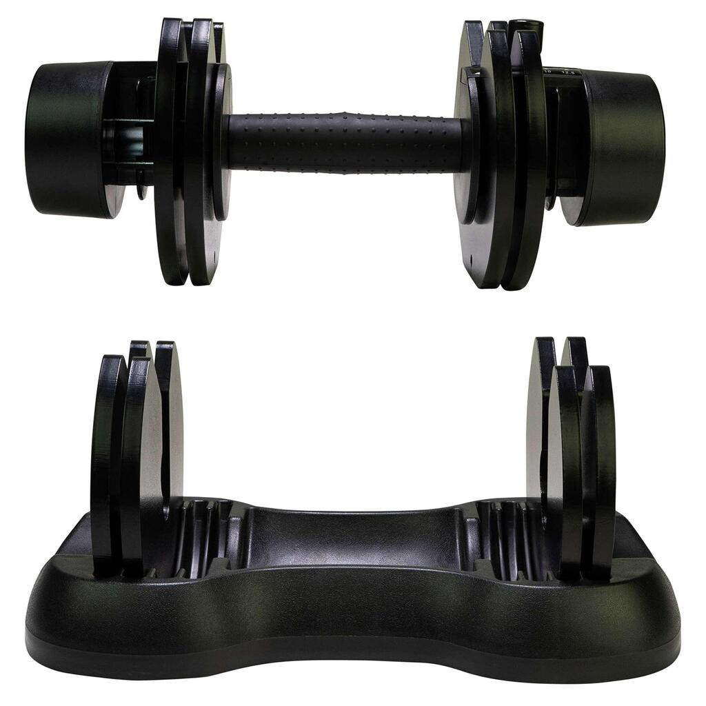 To train with different weights, you don't have to buy multiple dumbbells. With this, you can train with weights from 2.5 to 12.5 kilos using one and the same dumbbell. Five adjustable weights.