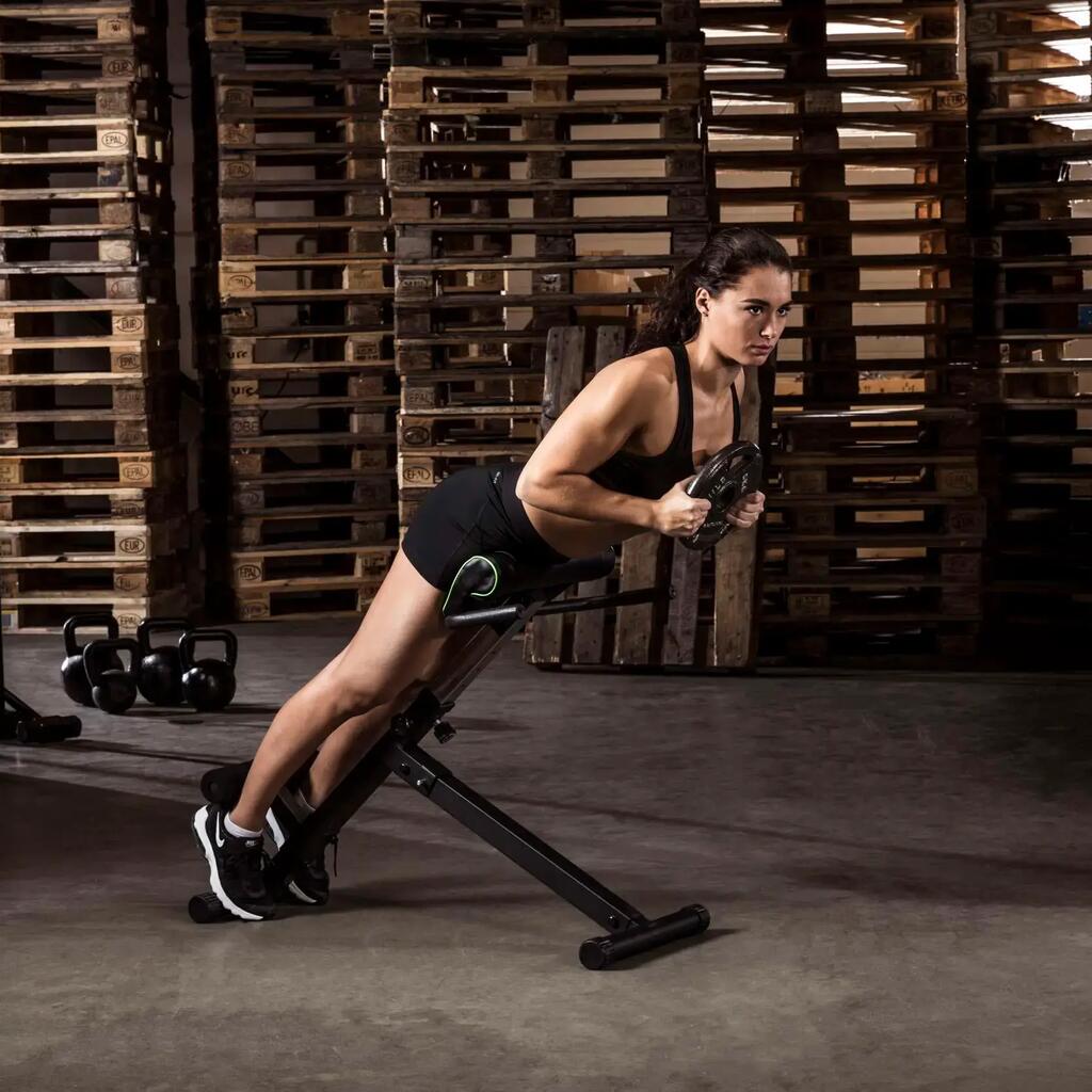 Specifically for upper body training. This bench can be used as a back trainer, abdominal bench, or Roman chair. The bench is compact and can be folded for easy storage.