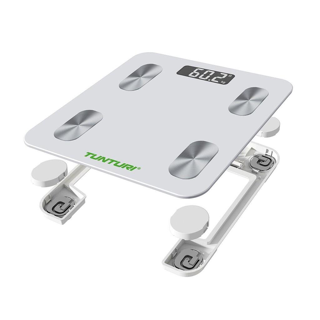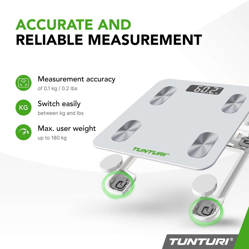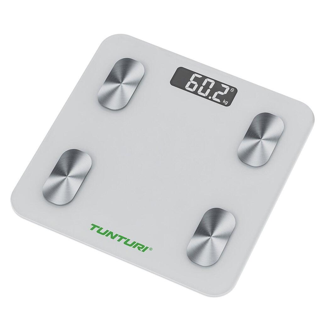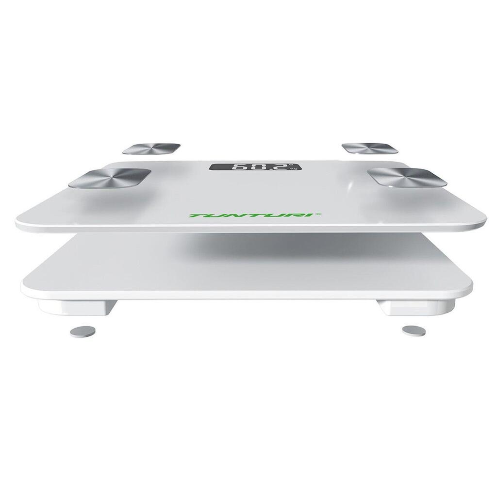 Tunturi SC30 smart scale in black with Bluetooth and Fitdays app, measures 14 body parameters (weight, BMI, muscle and bone mass) for complete health tracking.