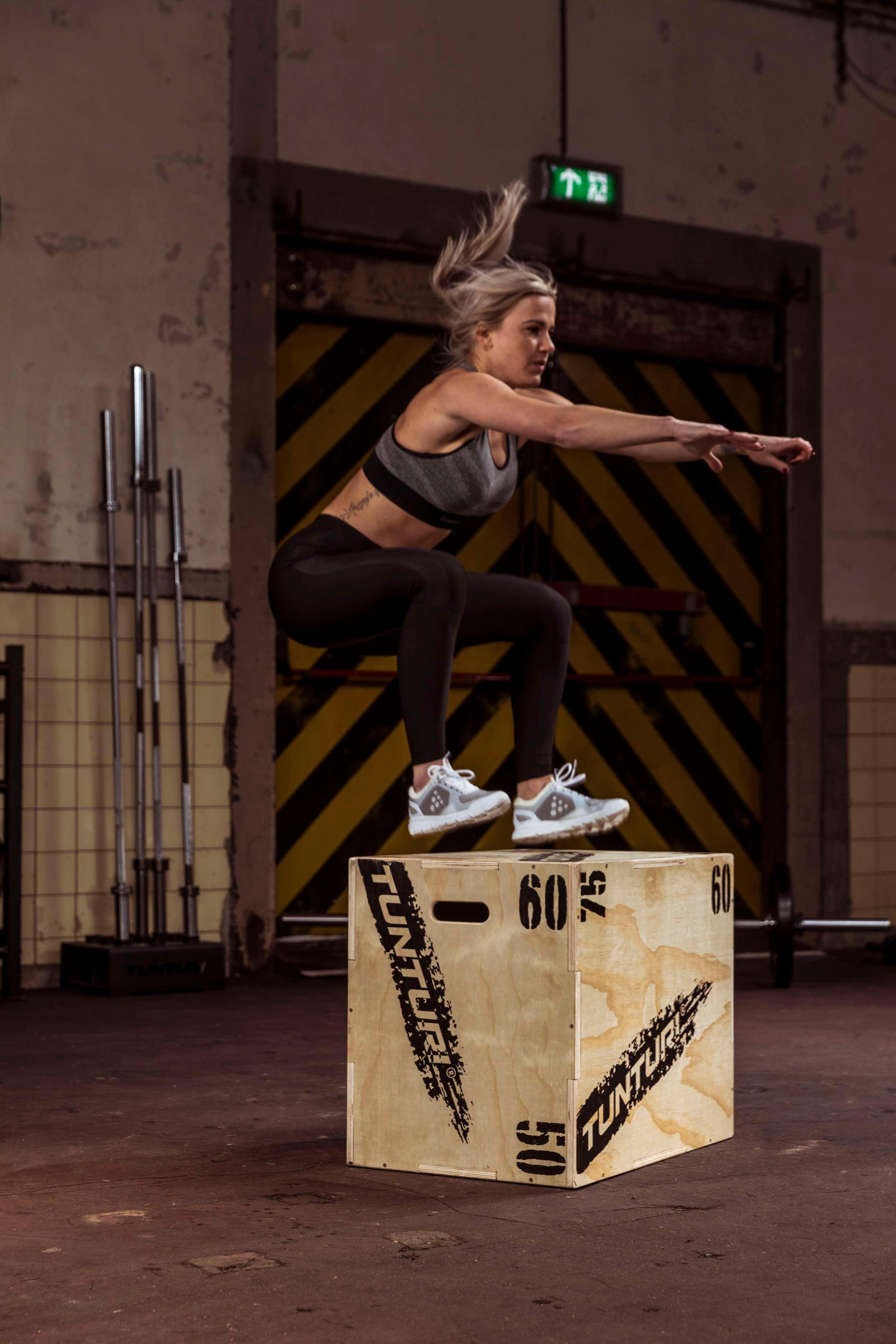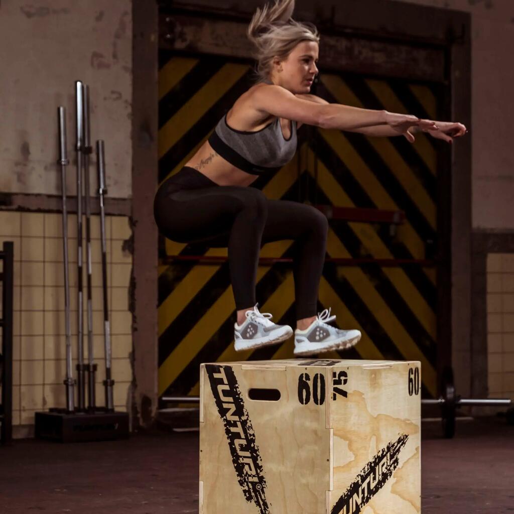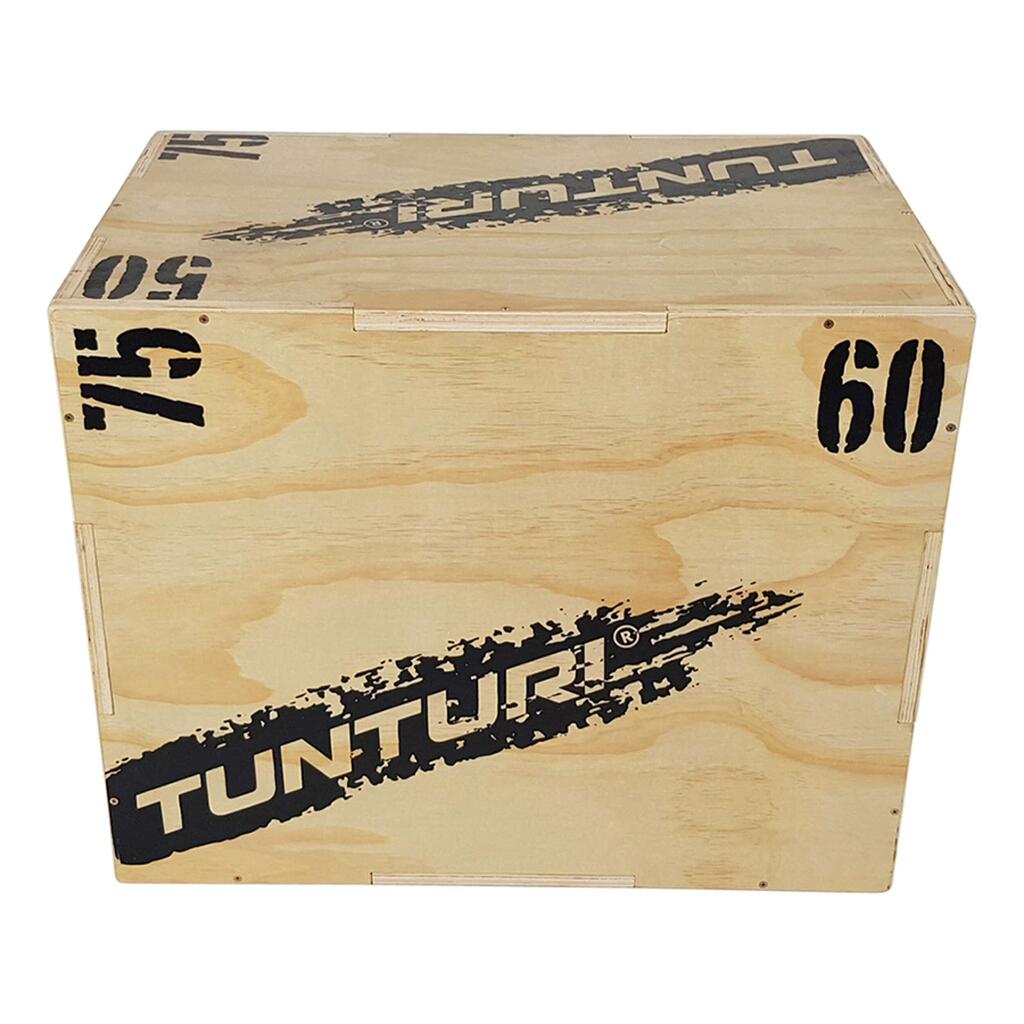 A wooden plyo box for explosive athletes. This one is extra reinforced and can be used at three different heights. A jump box is indispensable in the gym for both beginners and advanced athletes.