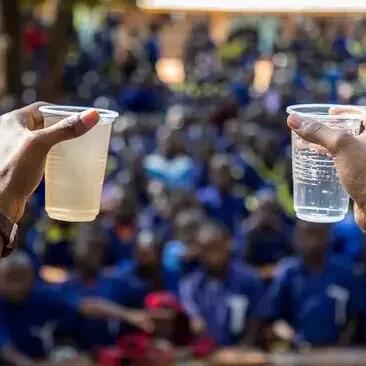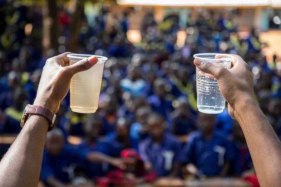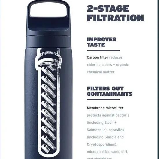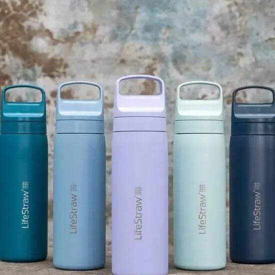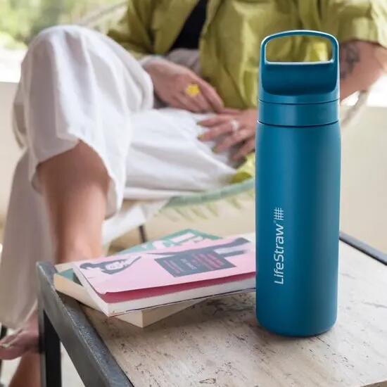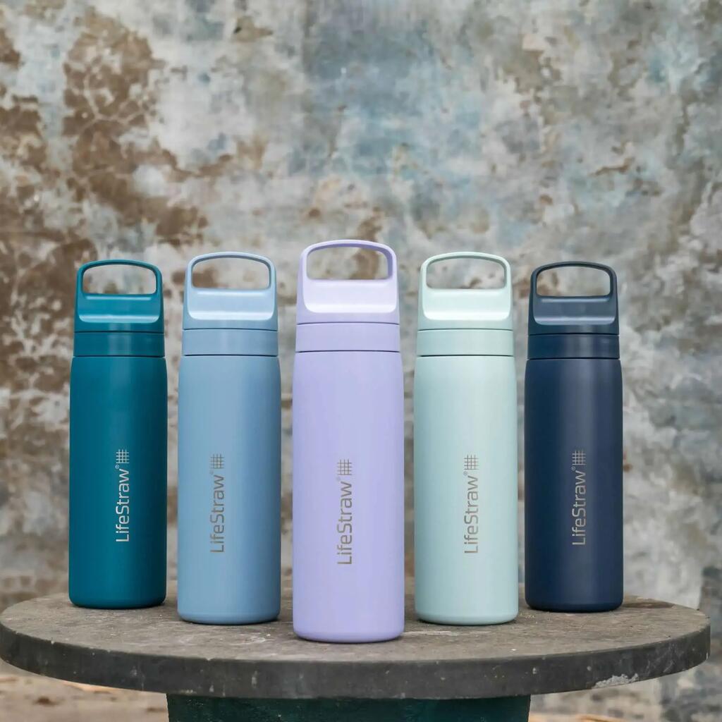 Stainless steel water bottle with built-in filter – clean water anywhere, anytime.