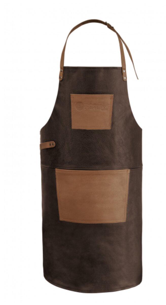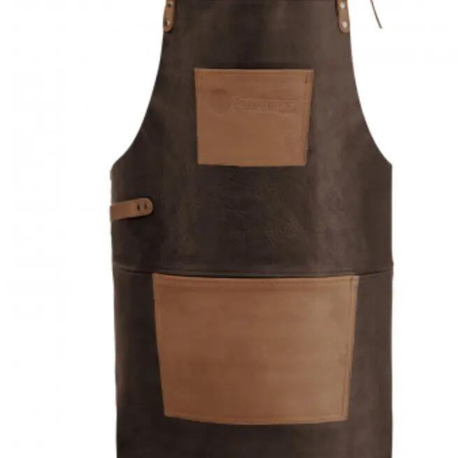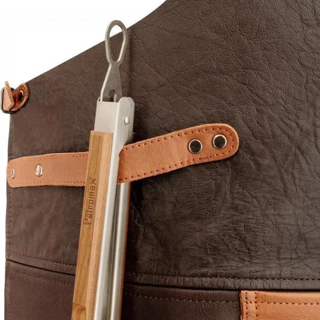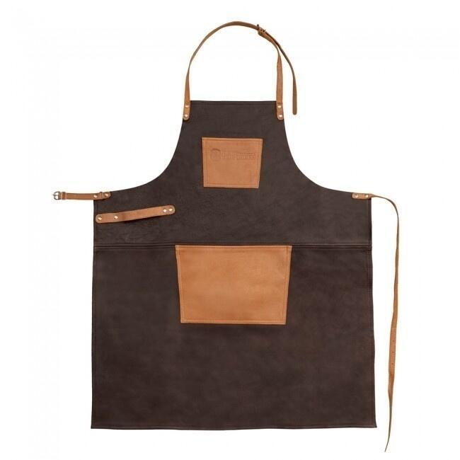 Whether for your open-air grilling place or fireplace: The Buff Leather Apron is your perfect companion to protect you and your clothes from dirt and fat spatter. It also provides comfortable fit and optimum durability. Thanks to the adjustable neck strap and waist belt, the Buff Leather Apron is flexible and adjustable. Reinforced threads, riveted straps and belts ensure longevity and highest quality, and also best functionality. The cleverly placed pocket at chest and waist height as well as the lateral support straps hold your towel, grilling and cooking tools right at hand. Through gentle dying and colouring of the material, the grain of the buff leather is maintained which gives your apron an original and individual patina. The Buff Leather Apron ab-b in dark brown with cognac coloured applications has an original charm, giving you as chef at the fire a lasting impression.