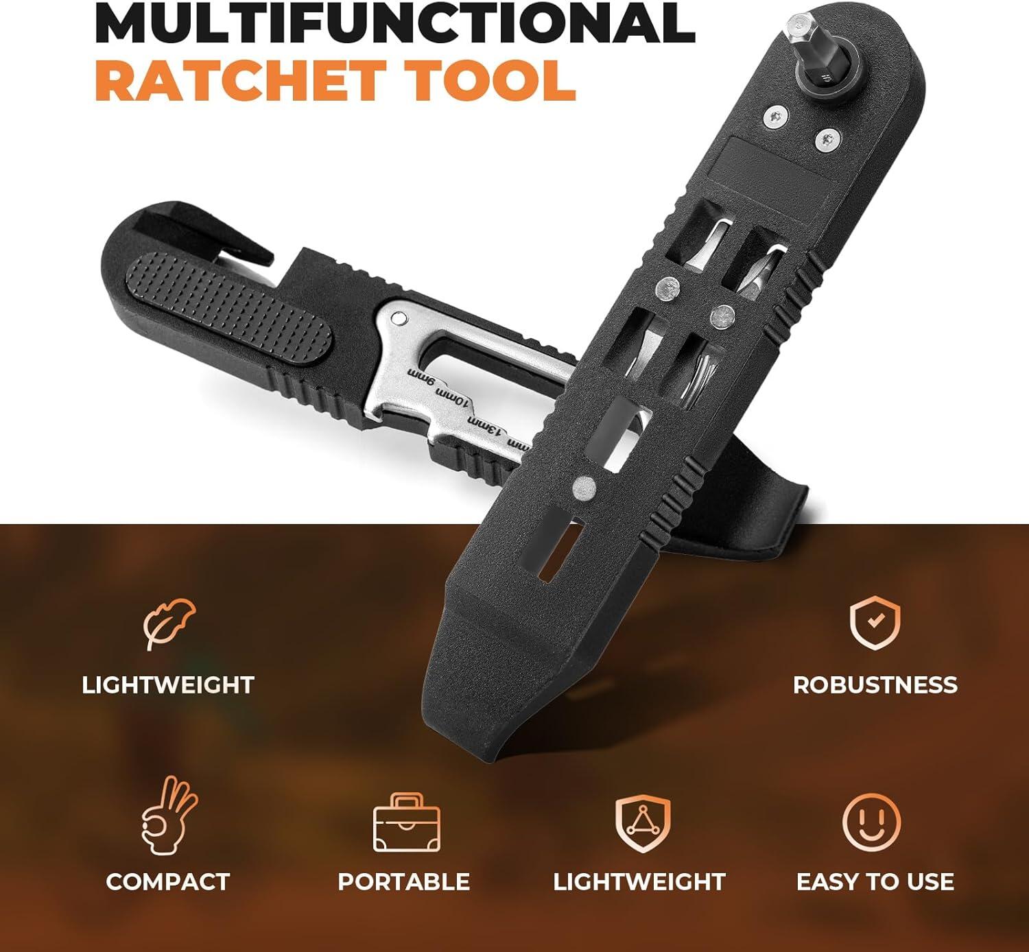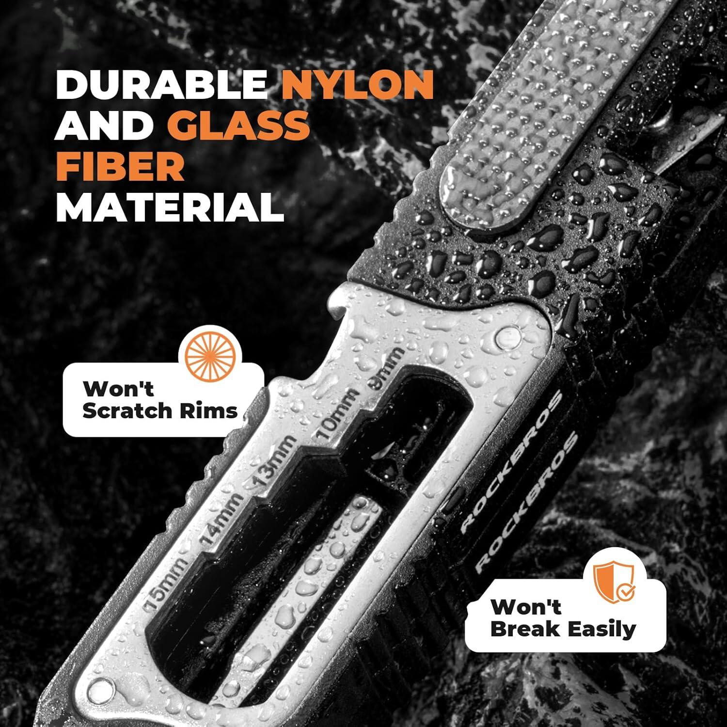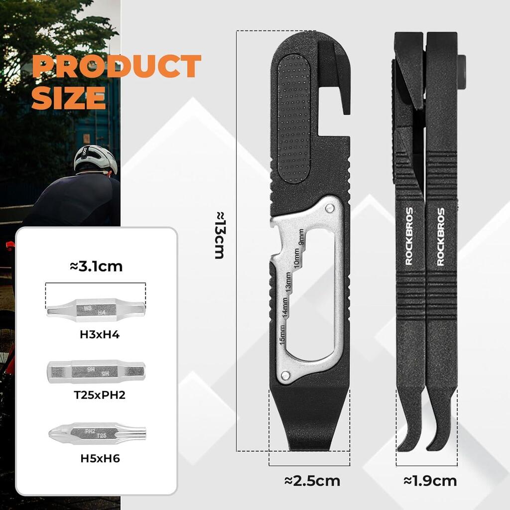 ROCKBROS 16-in-1 Multi-Tool for Bicycles – Compact, Lightweight, and Robust Never be caught unprepared on the road again with the ROCKBROS 16-in-1 multi-tool. This essential tool combines compactness, lightness, and robustness thanks to its composite material construction, and includes a ratchet, interchangeable bits, and wrenches for all your quick repairs and adjustments. Key Features Brand/Manufacturer: ROCKBROS Color: Black Folded Size: Approx. 0.98×0.75×5.12 inches (or 2.5×1.9×13 cm) Net Weight: 115 grams (information taken from the "About This Item" section) Body Material: 70% Nylon PA6 + 30% Fiberglass (High-strength composite material) 16 Essential Features This mini repair kit offers maximum versatility in a minimal size: Open-End Wrenches: 9 mm, 10 mm, 13 mm, 14 mm, 15 mm File Tire Lever with Spoke Hook Ratchet Bit Driver Interchangeable Bits (6): Allen Wrenches (Hex): H3, H4, H5, H6 Screwdriver: T25, PH2 (Phillips) Bottle Opener Quick-Release Button Advanced Design and Durability High-Strength Material: The body is made from PA6 nylon reinforced with 30% fiberglass, offering excellent resistance to impacts, breakage, and scratches, even on carbon rims. Compact and Lightweight: With minimal dimensions and a weight of 115 grams, it easily fits in a saddlebag or jersey pocket. Magnetic Design: The design incorporates a magnetic system to secure the tools and bits, minimizing bulk during transport. Intuitive and Safe to Use Quick Release System: The ratchet features an instant release button that allows for quick and secure attachment and removal of the bits, preventing them from being lost during use. Application: Ideal for quick repairs (tire changes, inner tube replacements, adjustments) while hiking or for everyday maintenance.