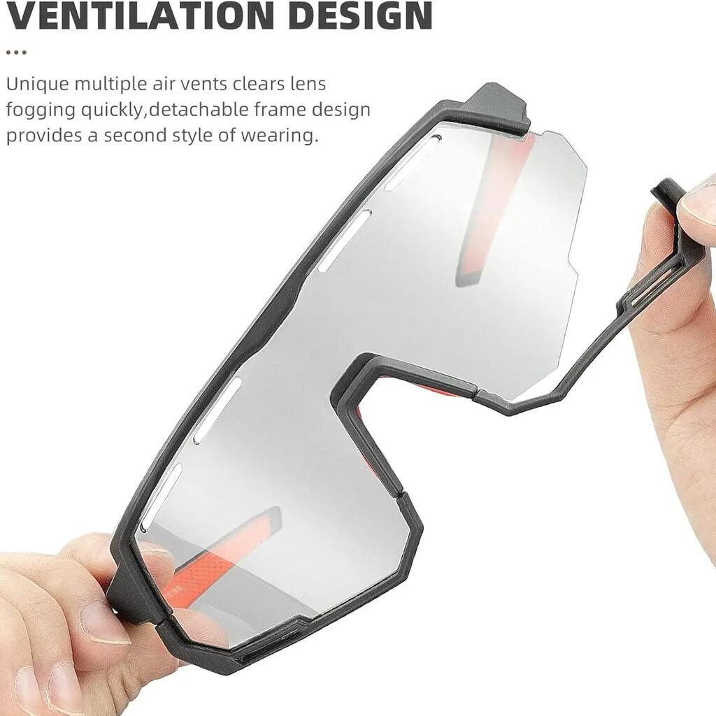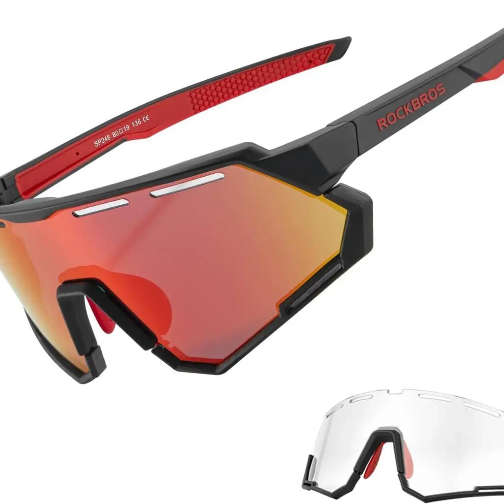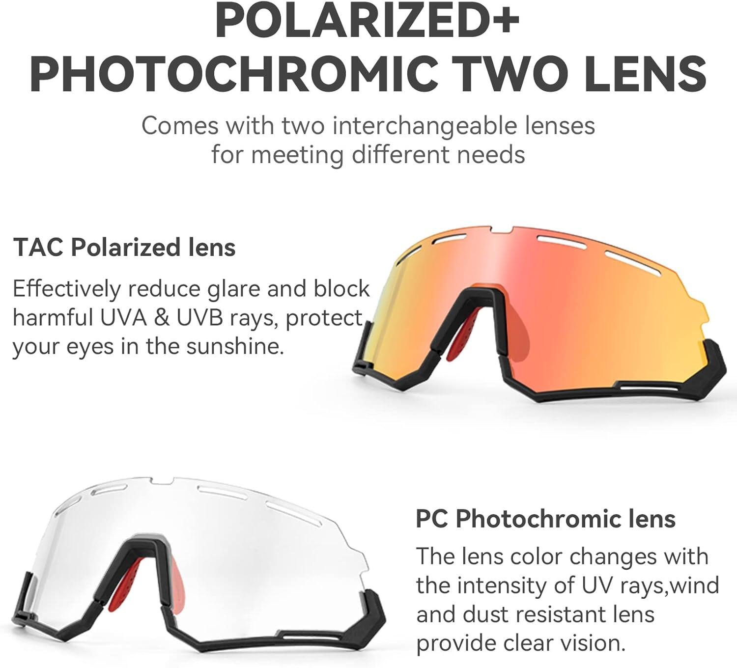 Cycling glasses with interchangeable lenses: polarized for glare, photochromic for light adaptation.
