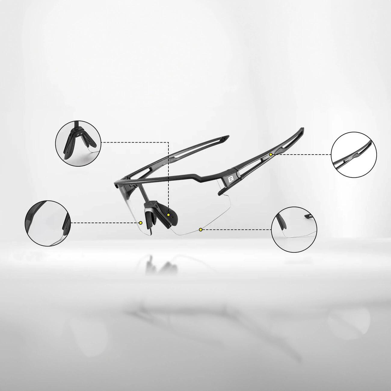 Rockbros performance: black, photochromic cycling glasses, UV400 protection.