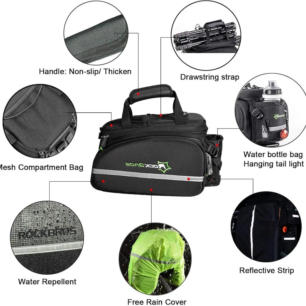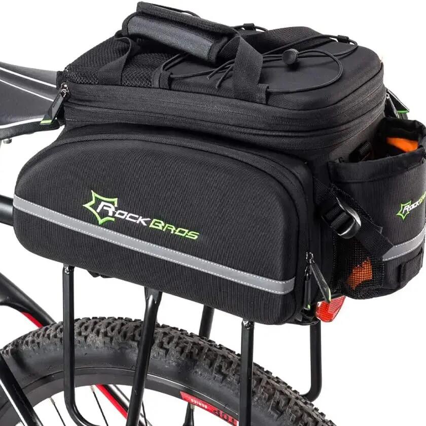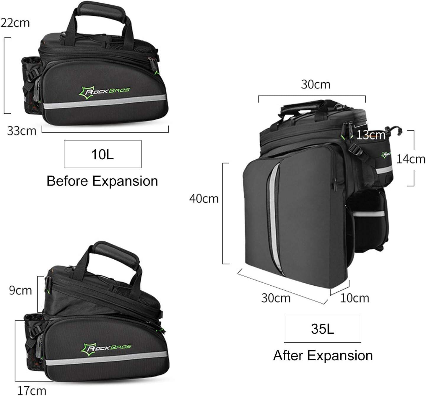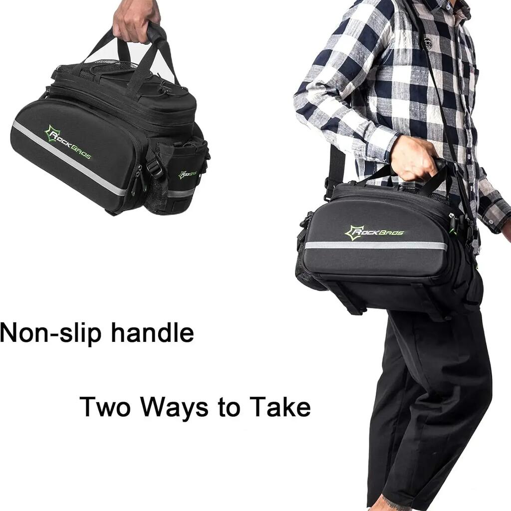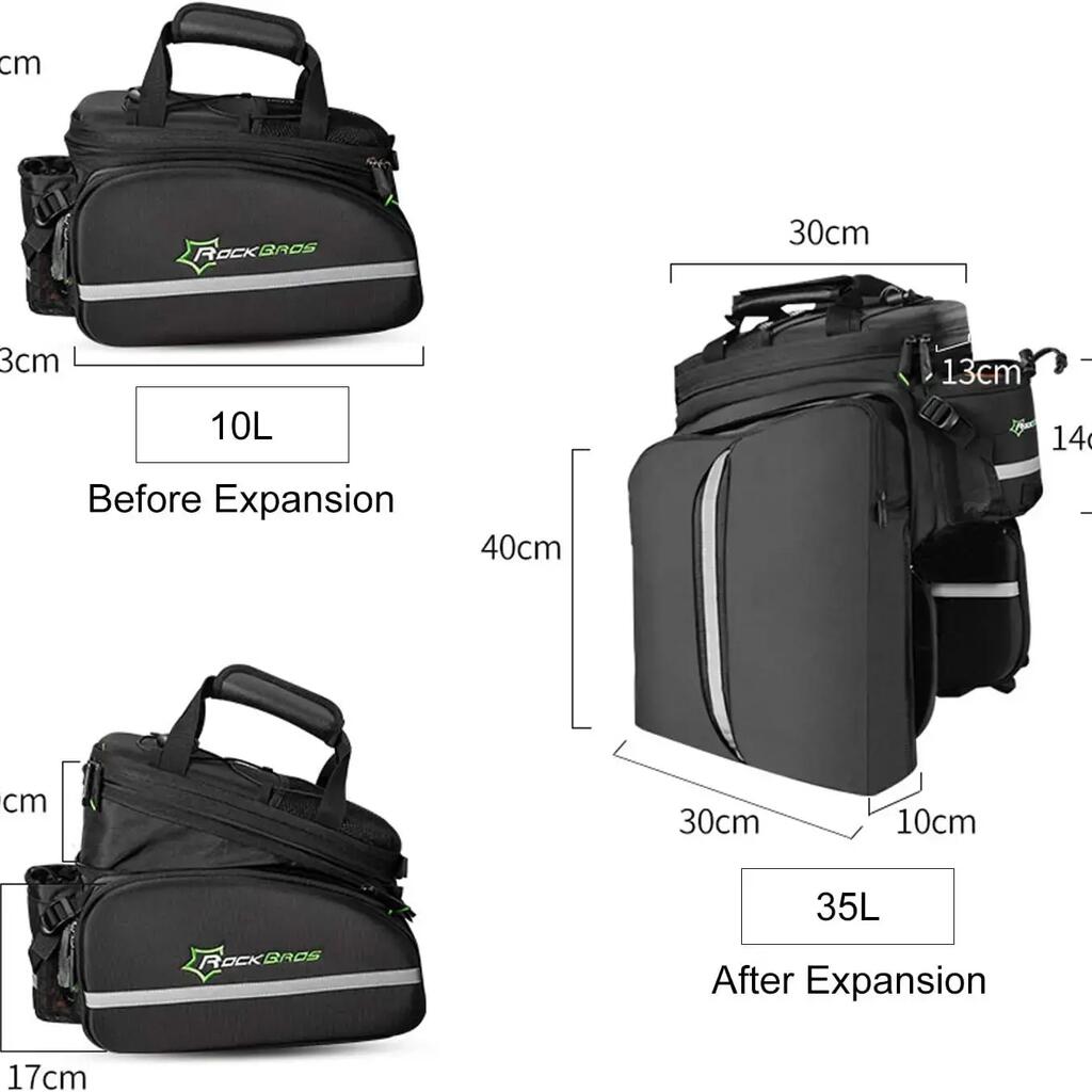 ROCKBROS 35L ​​Pannier Bag Discover the ROCKBROS pannier bag, a modular and very spacious storage solution for your cycling adventures. With its expandable capacity, clever design, and weather protection, this bag is the ideal gear for cycle touring, commuting, and long-distance rides. Key Features - Expandable Capacity from 17L to 35L: This ingenious pannier adapts to your needs. Its two side bags can be unfolded to significantly increase the volume, expanding from an initial capacity of 17 liters to a maximum of 35 liters. The top bag can also be extended vertically by 9 cm. - Optimized Organization: The top bag features two removable, non-slip square dividers that allow you to create three compartments. This helps you better organize your belongings and protect fragile items like a camera. The bottom of the bag is also padded for added protection. - Comfort and practicality: Double side zippers provide easy access to the contents. The bag features an external water bottle pocket, accessible with one hand. Straps and mesh pockets are also located on the top of the bag for additional storage. - Multifunctional and portable: This accessory easily converts into a handbag or shoulder bag thanks to an included strap. The padded shoulder straps and handle offer optimal comfort when carrying the bag on foot. - Durable and secure: The bag is water-resistant in its non-expanded configuration. For maximum protection, it comes with a rain cover for the side bags. Integrated reflective strips increase your visibility and safety at night. The bag attaches securely to the pannier rack with four straps. Technical Details - Color: Black - Capacity: From 17 L (unexpanded) to 35 L (expanded) - Brand: ROCKBROS - Material: Polyester - Item Weight: 1.2 kg - Product Dimensions: 33 cm (L) x 24 cm (W) x 22 cm (H) - Vehicle Use: Bicycle - Mounting Type: Adjustable straps on the rear rack - Key Features: Large expandable capacity, waterproof (with rain cover), reflective elements, customizable internal organization.