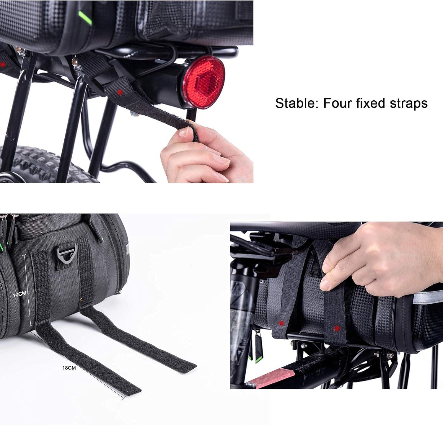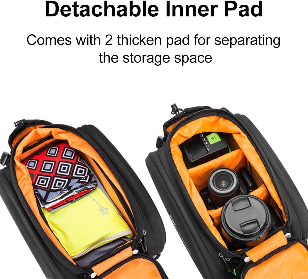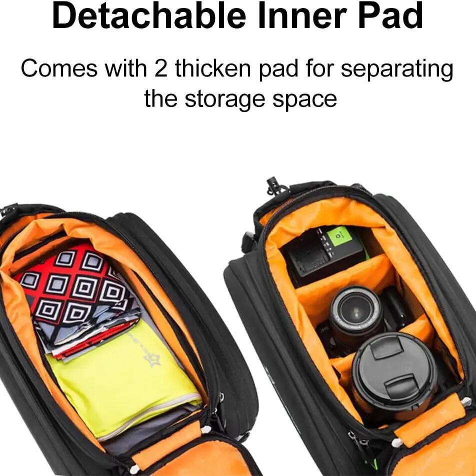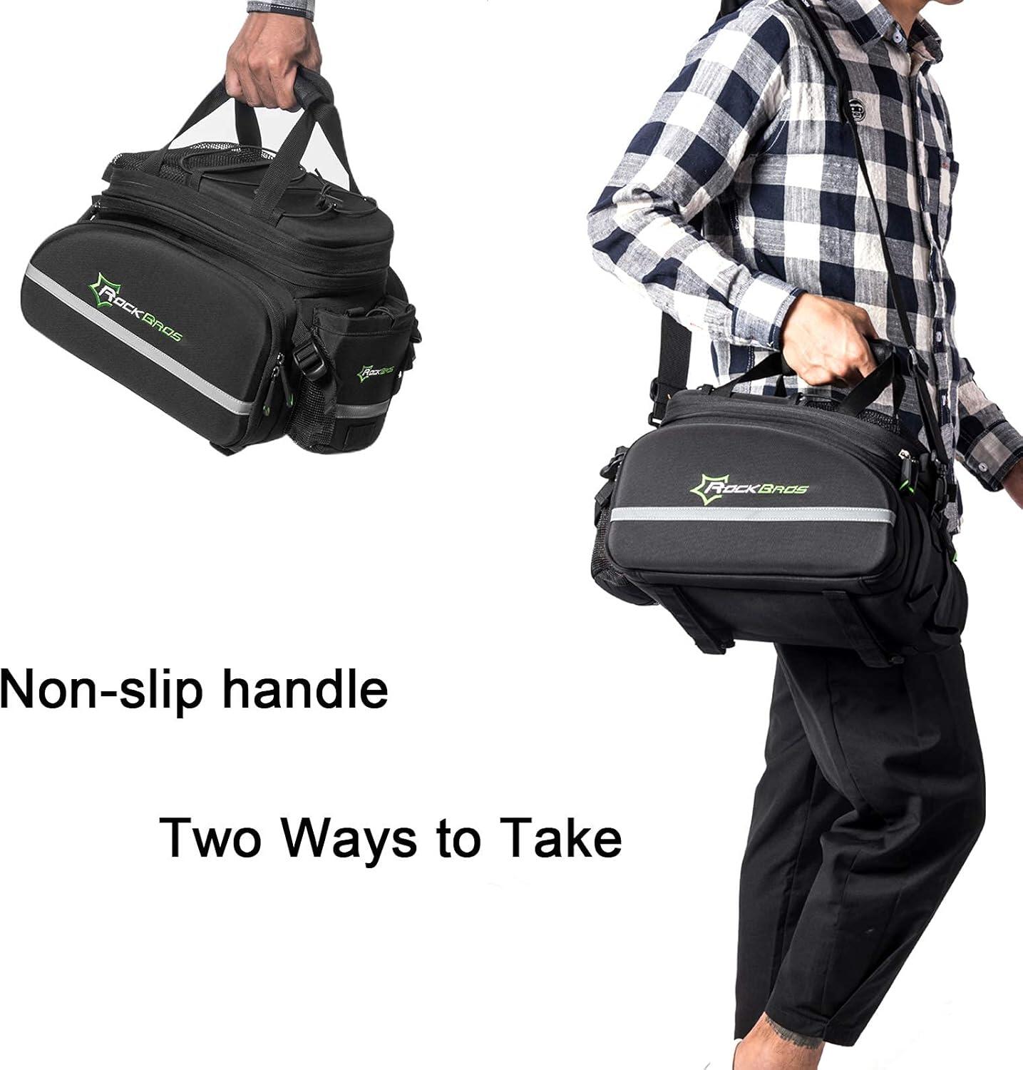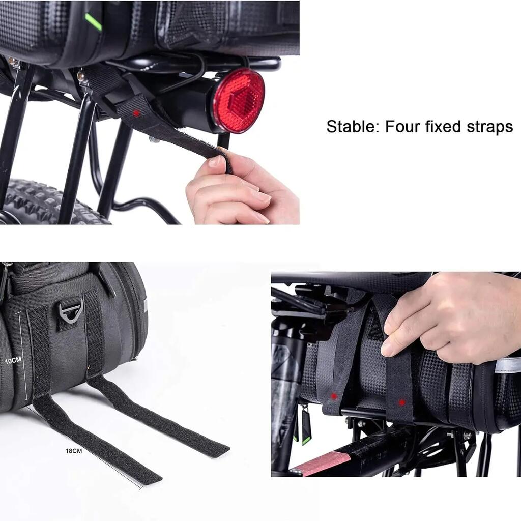 ROCKBROS 35L ​​Pannier Bag Discover the ROCKBROS pannier bag, a modular and very spacious storage solution for your cycling adventures. With its expandable capacity, clever design, and weather protection, this bag is the ideal gear for cycle touring, commuting, and long-distance rides. Key Features - Expandable Capacity from 17L to 35L: This ingenious pannier adapts to your needs. Its two side bags can be unfolded to significantly increase the volume, expanding from an initial capacity of 17 liters to a maximum of 35 liters. The top bag can also be extended vertically by 9 cm. - Optimized Organization: The top bag features two removable, non-slip square dividers that allow you to create three compartments. This helps you better organize your belongings and protect fragile items like a camera. The bottom of the bag is also padded for added protection. - Comfort and practicality: Double side zippers provide easy access to the contents. The bag features an external water bottle pocket, accessible with one hand. Straps and mesh pockets are also located on the top of the bag for additional storage. - Multifunctional and portable: This accessory easily converts into a handbag or shoulder bag thanks to an included strap. The padded shoulder straps and handle offer optimal comfort when carrying the bag on foot. - Durable and secure: The bag is water-resistant in its non-expanded configuration. For maximum protection, it comes with a rain cover for the side bags. Integrated reflective strips increase your visibility and safety at night. The bag attaches securely to the pannier rack with four straps. Technical Details - Color: Black - Capacity: From 17 L (unexpanded) to 35 L (expanded) - Brand: ROCKBROS - Material: Polyester - Item Weight: 1.2 kg - Product Dimensions: 33 cm (L) x 24 cm (W) x 22 cm (H) - Vehicle Use: Bicycle - Mounting Type: Adjustable straps on the rear rack - Key Features: Large expandable capacity, waterproof (with rain cover), reflective elements, customizable internal organization.