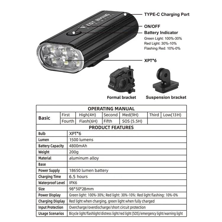 High Power Bike Handlebar Light 1500 Lumen, 5 Modes Waterproof