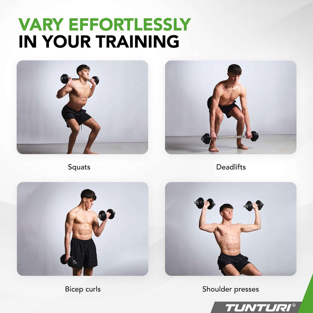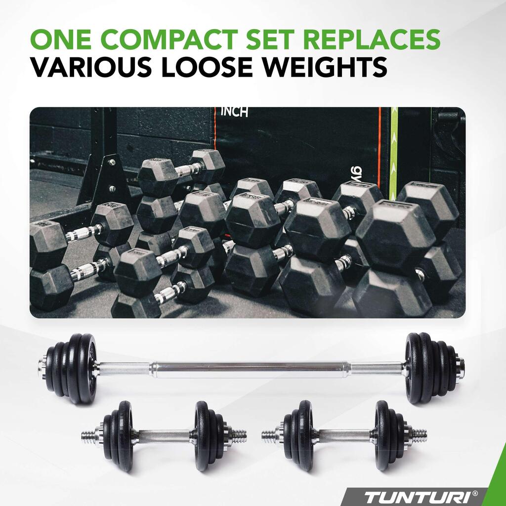 **Are you searching for a compact and convenient way to train your entire body? The 20 kg Tunturi Halter & Dumbbells Set is the ideal solution, perfect for small spaces or a varied workout without having to deal with multiple clunky weights. With both dumbells and a barbell in one set, you have everything at your fingertips for a complete workout.**