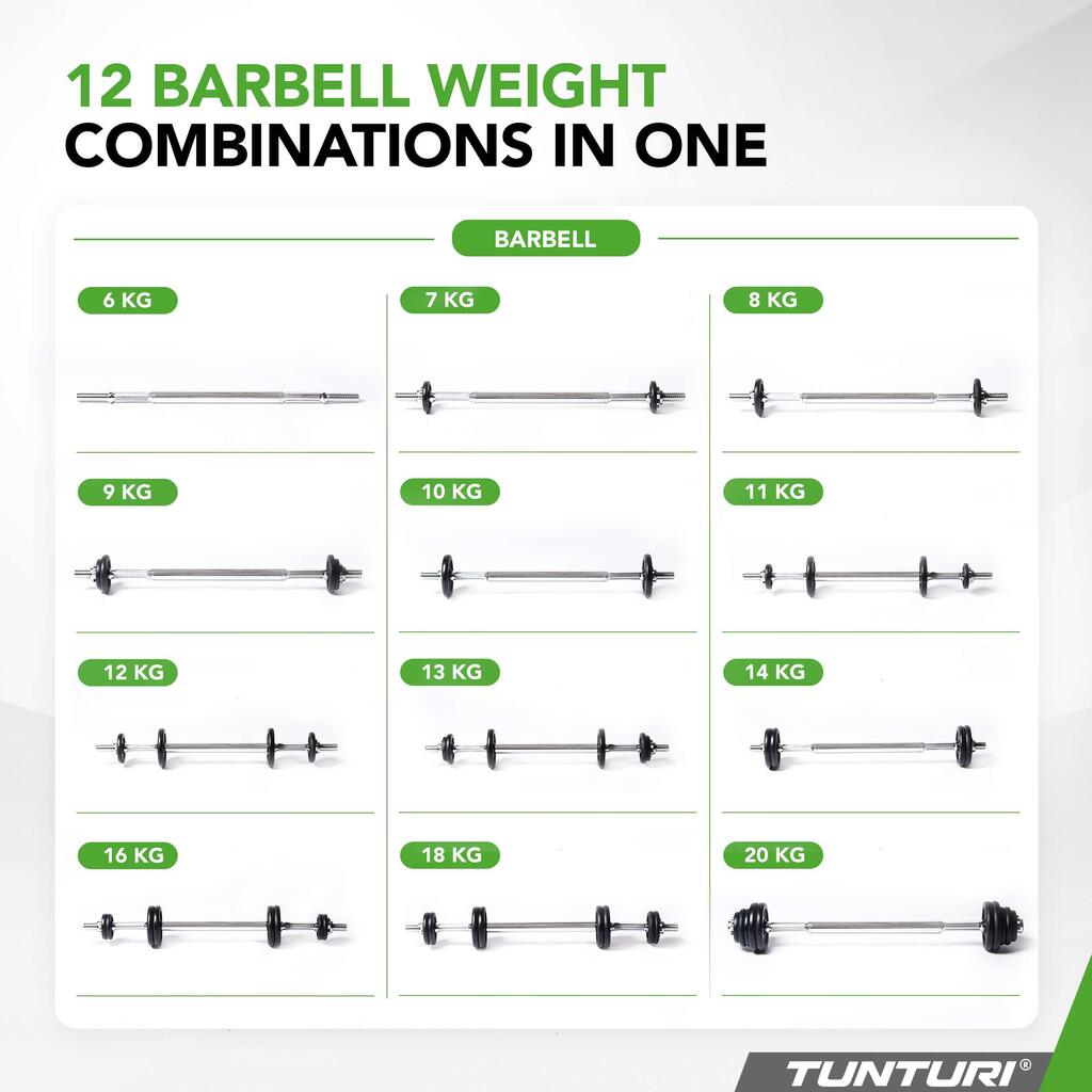 The set offers 12 weight options for the barbell (6-20 kg) and 8 options for the dumbbells (2-9 kg per dumbbell) for a total of 20 weight variations in one compact set. You can quickly convert the dumbbells to a barbell by screwing them into the sturdy, chrome-plated intermediate bar. This versatility is not only convenient for your workout but also for storage. You can quickly store the set as a whole, so you'll never have to deal with loose weights on the floor again.