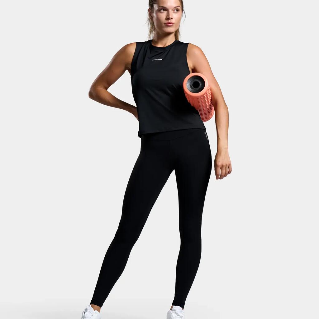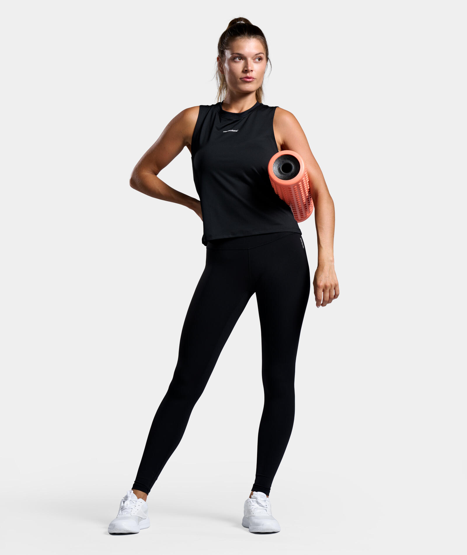 Lightweight, elegant tank top with a round neckline and slightly shorter at the front.