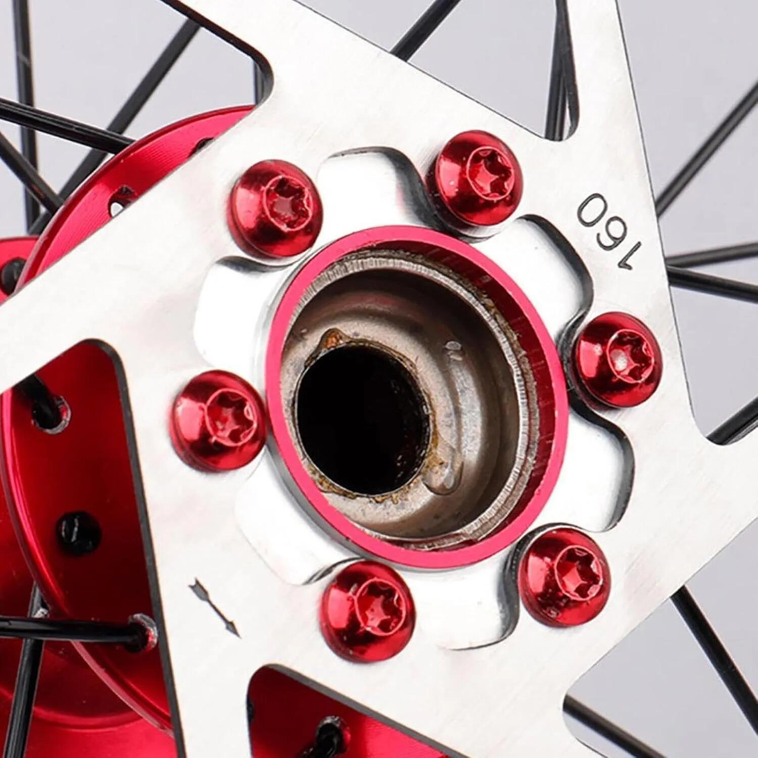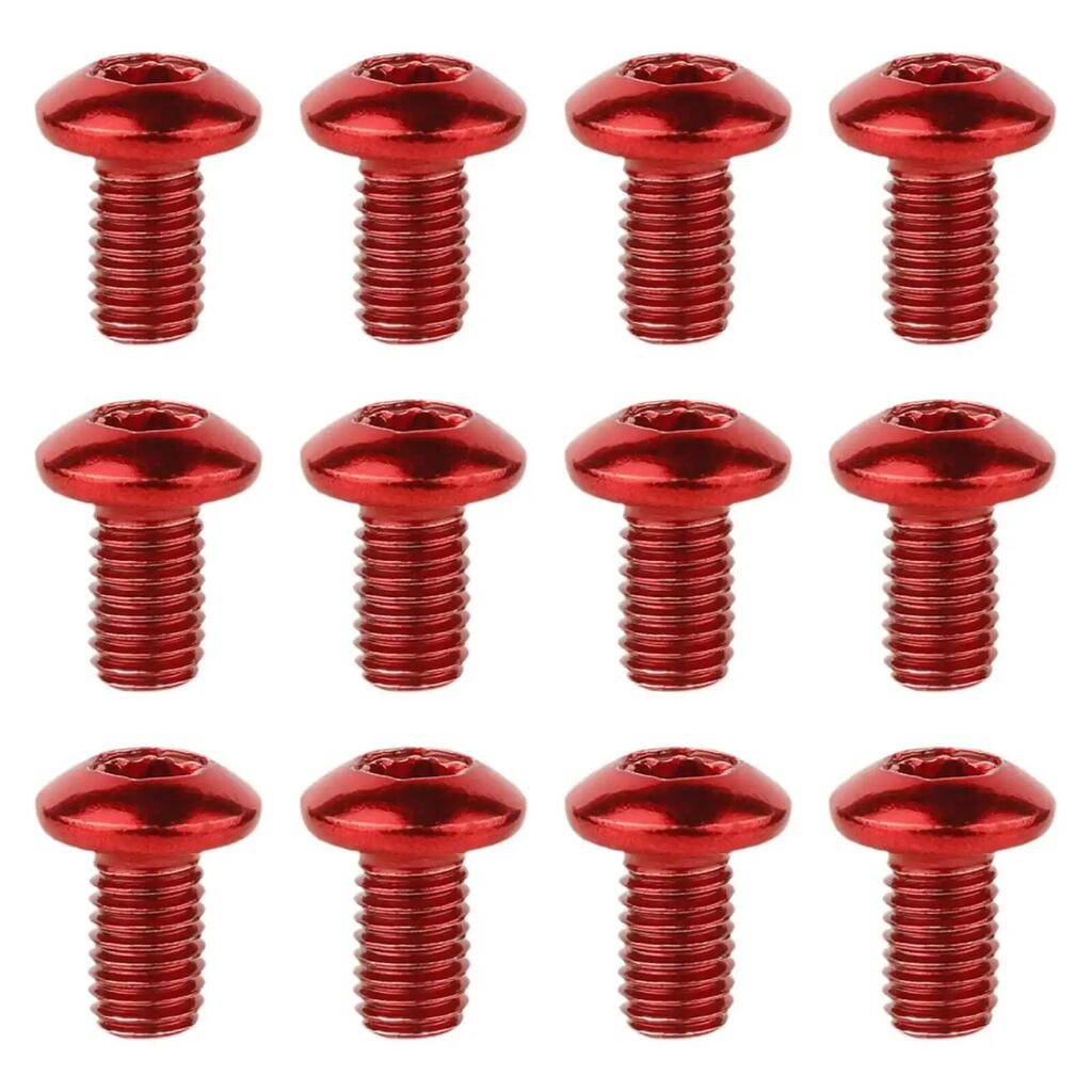 12 red T25 rotor bolts, M5×9 mm, stainless PVD for 6-bolt rotors. Anti-vibration, reusable, −40 °C to +150 °C. Durable, glossy finish for MTB/road/gravel.
