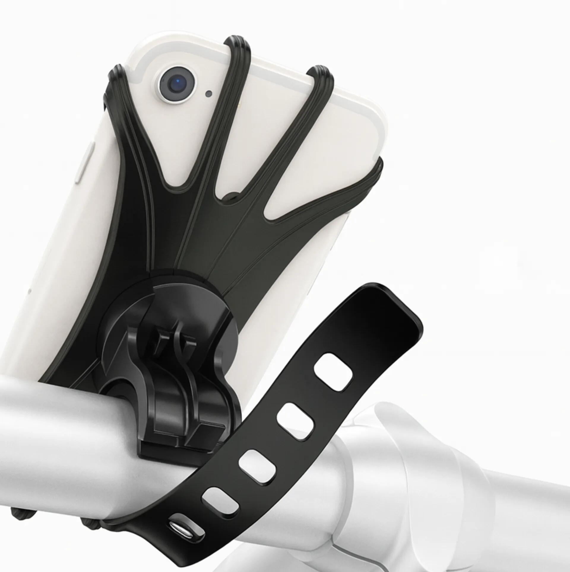 Universal silicone bike phone holder for 4.5–7’’ smartphones. Quick, secure, tool-free mounting on any handlebar.
