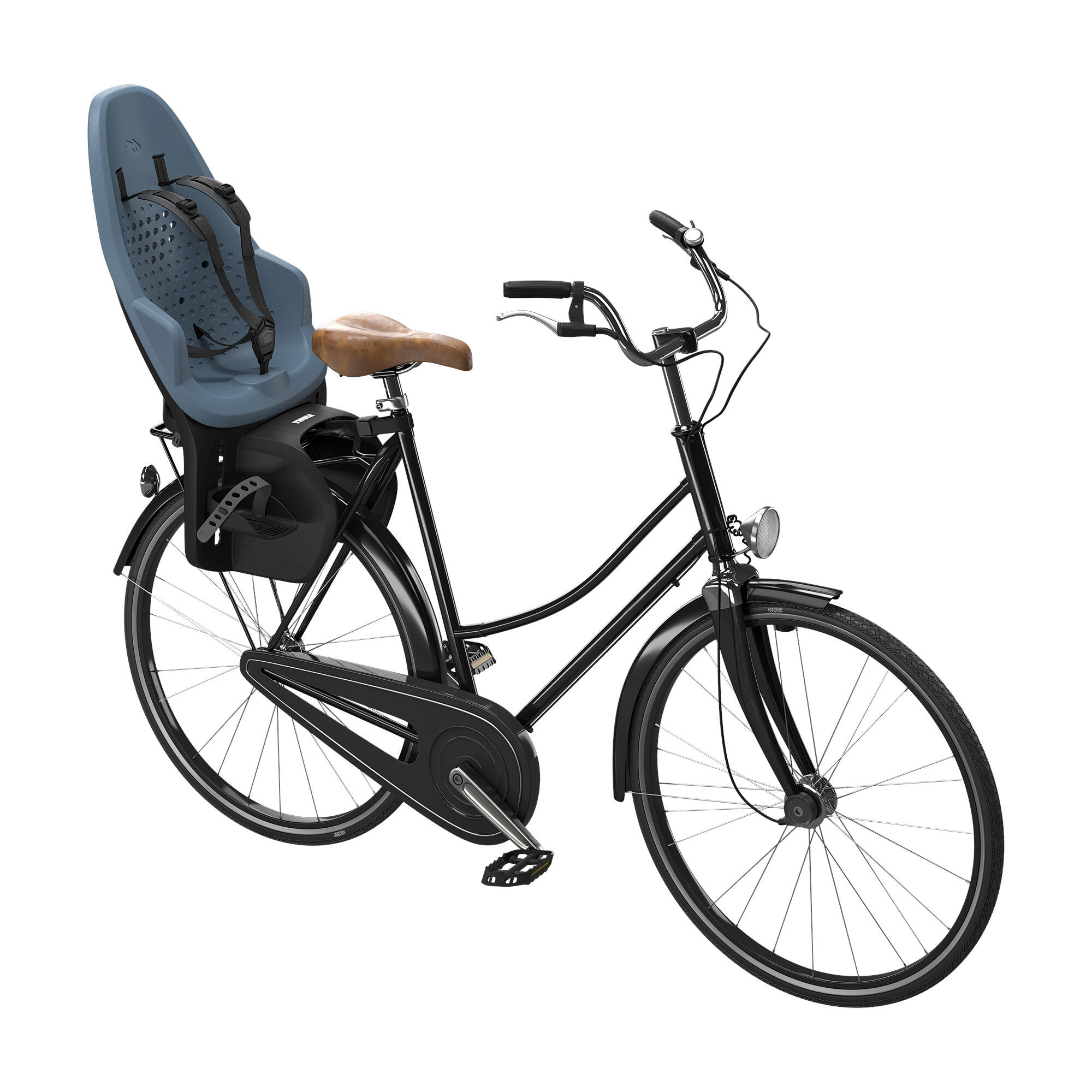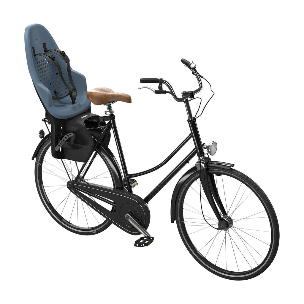 Rear-mounted child bike seat for 9 months to 6 years (up to 22 kg), offering comfort, adjustable 5-point harness and universal rack-mount.