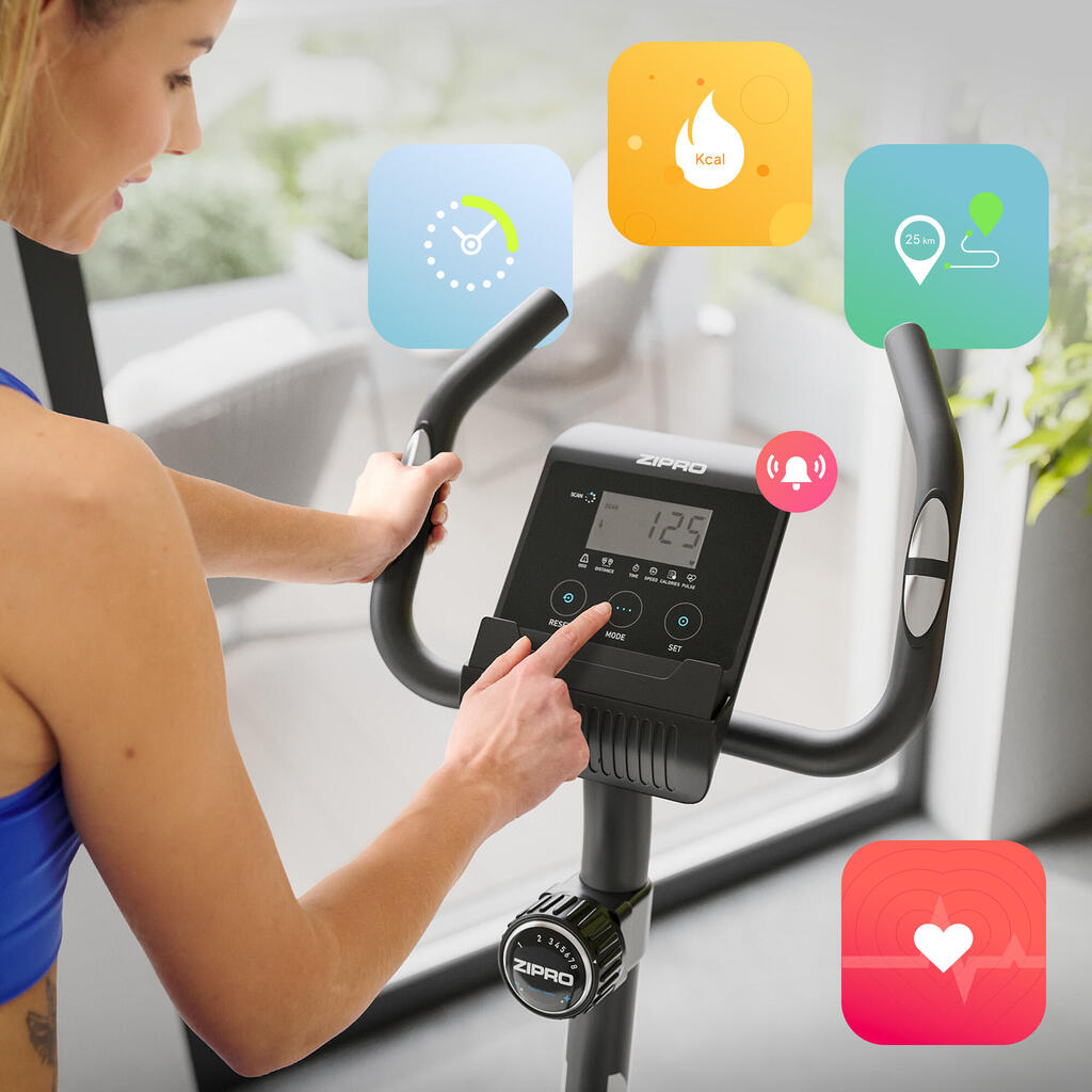 The **ZIPRO Beat** is a compact and modern **exercise bike**, perfect for **home fitness**. With its **magnetic resistance system**, **adjustable saddle**, and **intuitive onboard computer**, it offers an efficient and safe workout tailored to your needs. Available in **two colour options** – grey/black and black/white – it easily blends into any home interior.