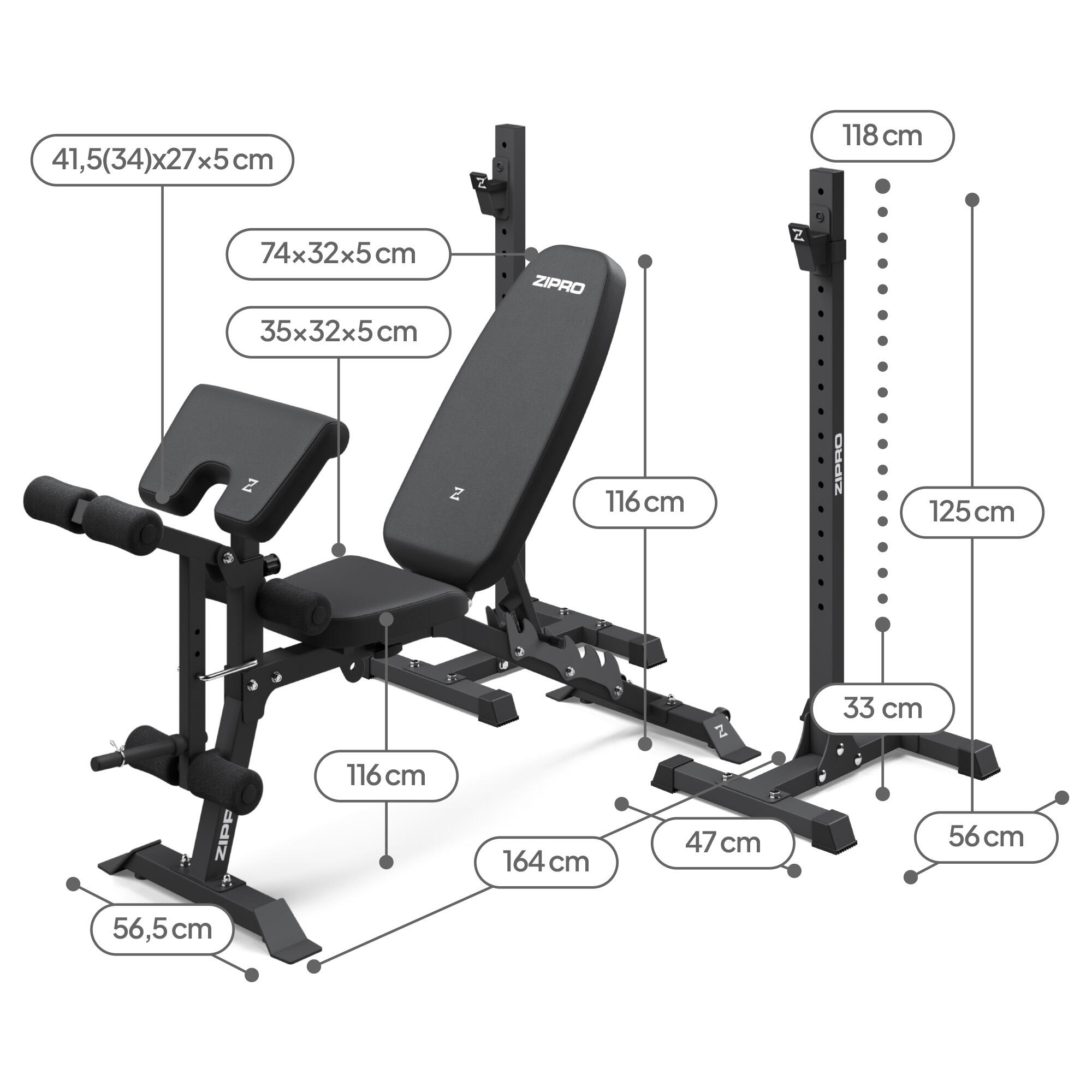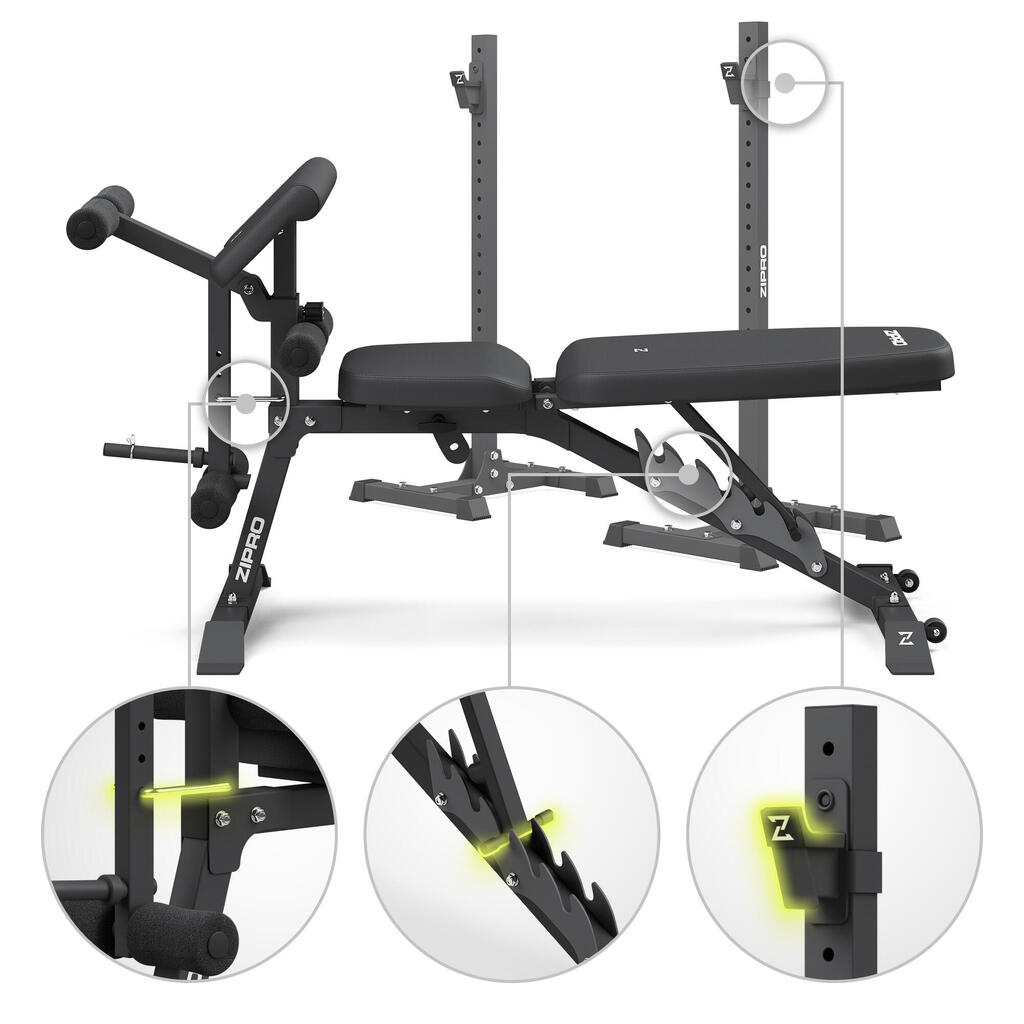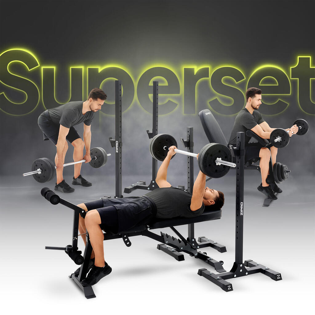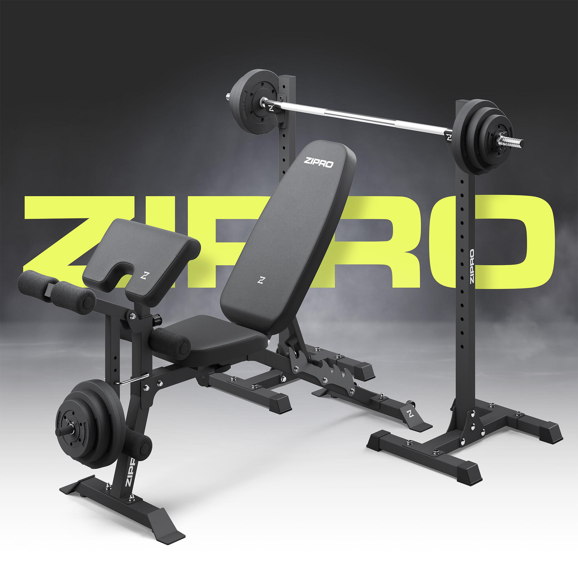 ZIPRO Superset: Adjustable bench with preacher curl and leg developer. Independent barbell stands, 270 kg capacity – your complete home strength set!