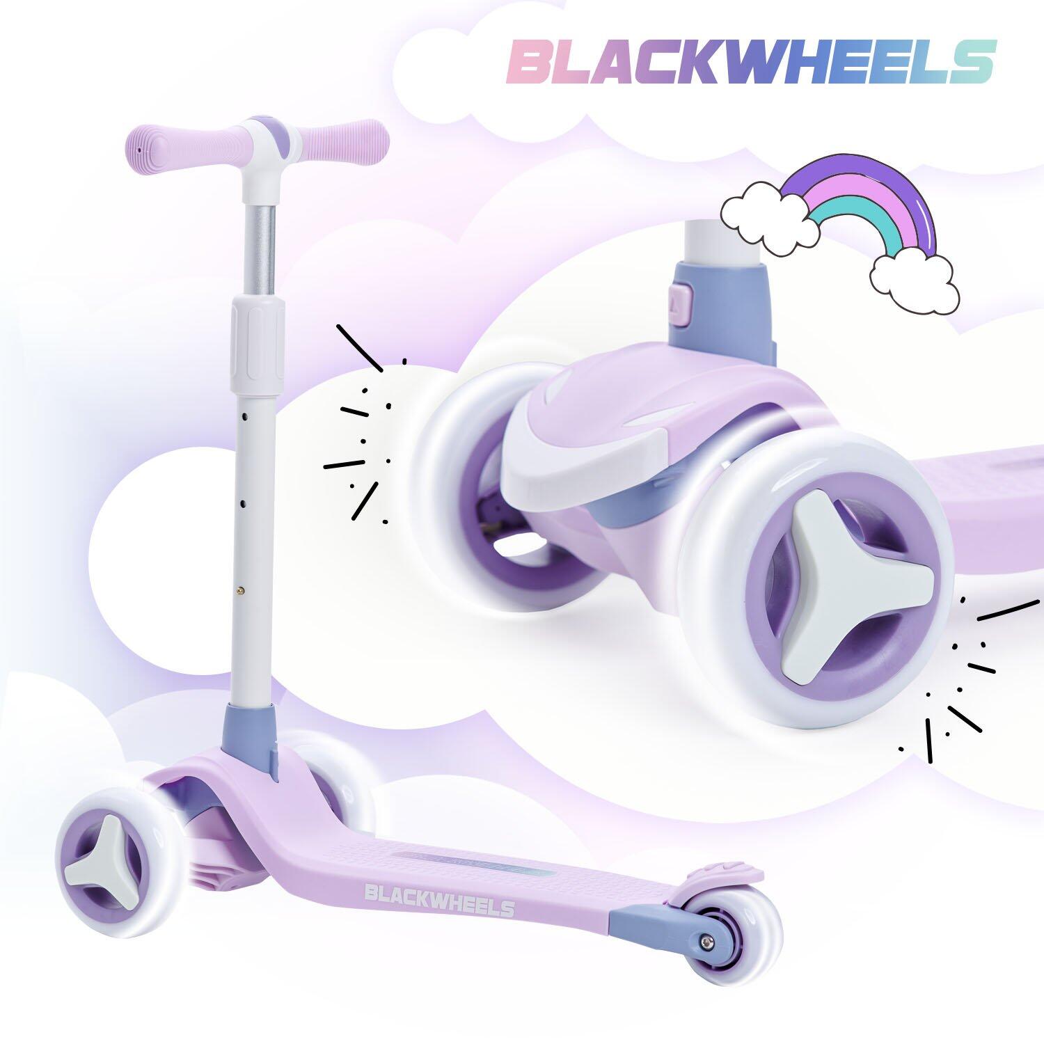 Blackwheels Blink – colourful three-wheel scooter with LED light-up wheels, adjustable handlebar (61–75 cm), anti-slip deck and rear brake. Perfect first scooter for kids!