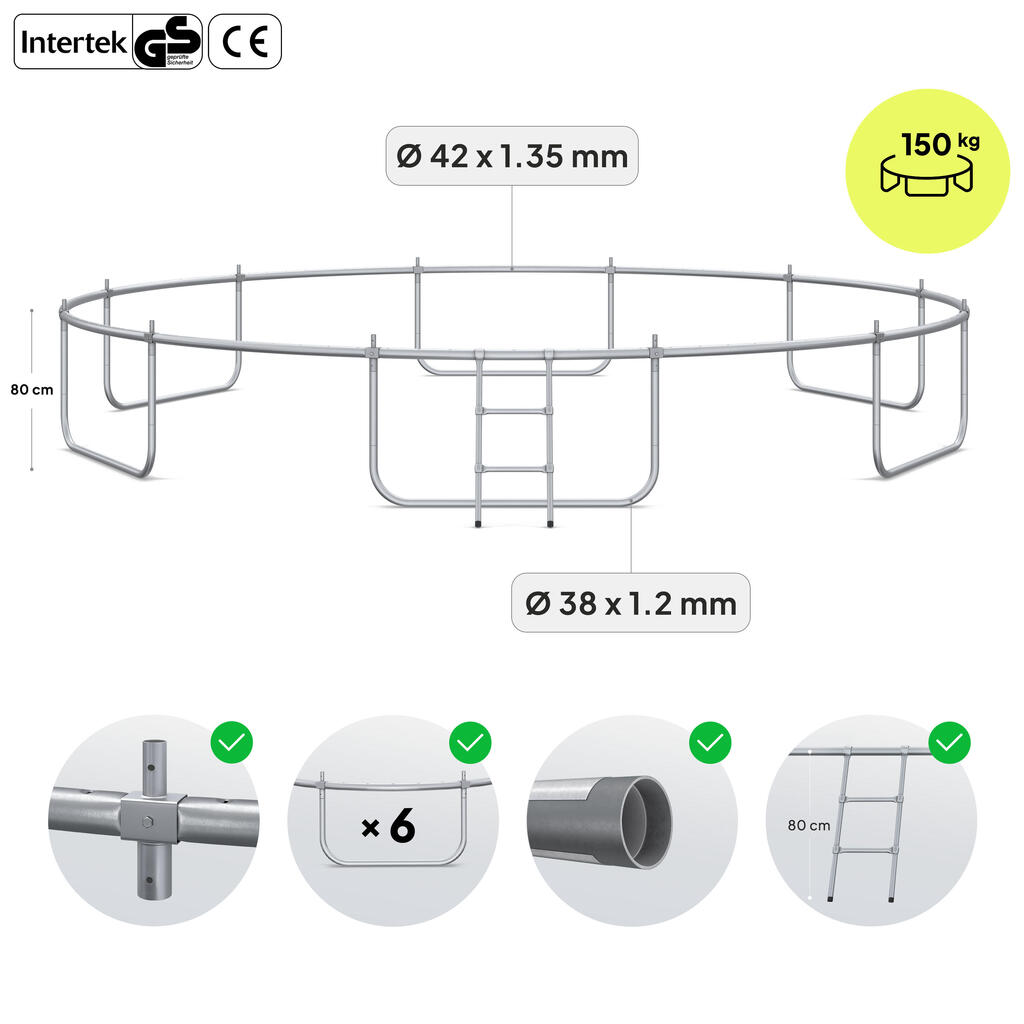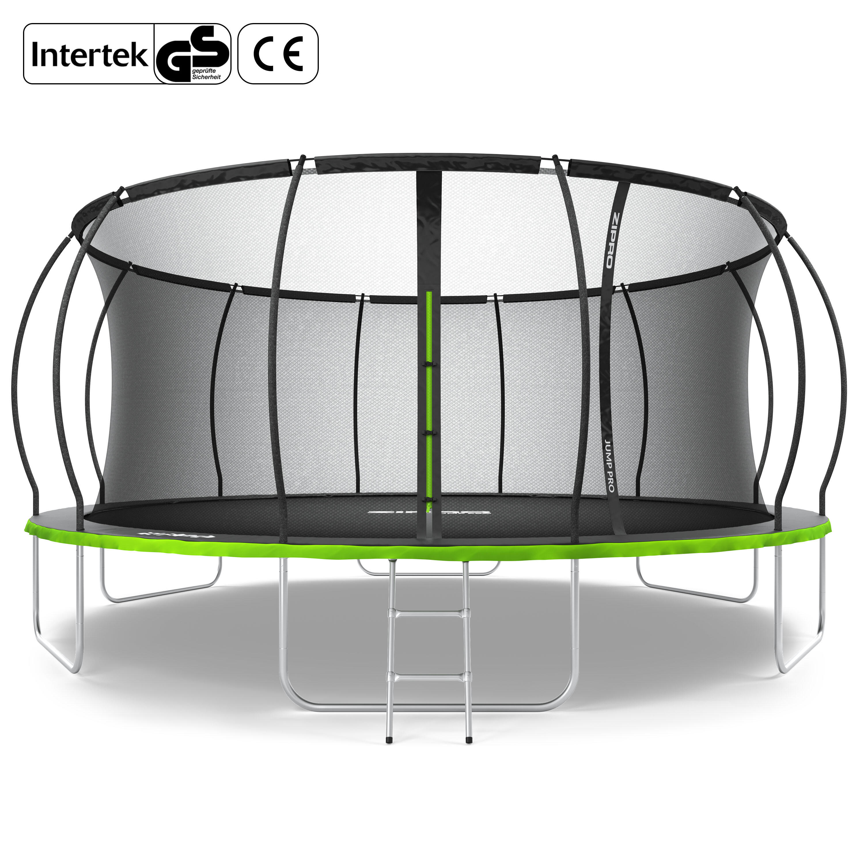 The ZIPRO JumpPro PREMIUM 16′ trampoline ensures fun and safety with curved poles, reinforced net, strong steel frame, UV resistance, quick assembly, and 150 kg load capacity.
