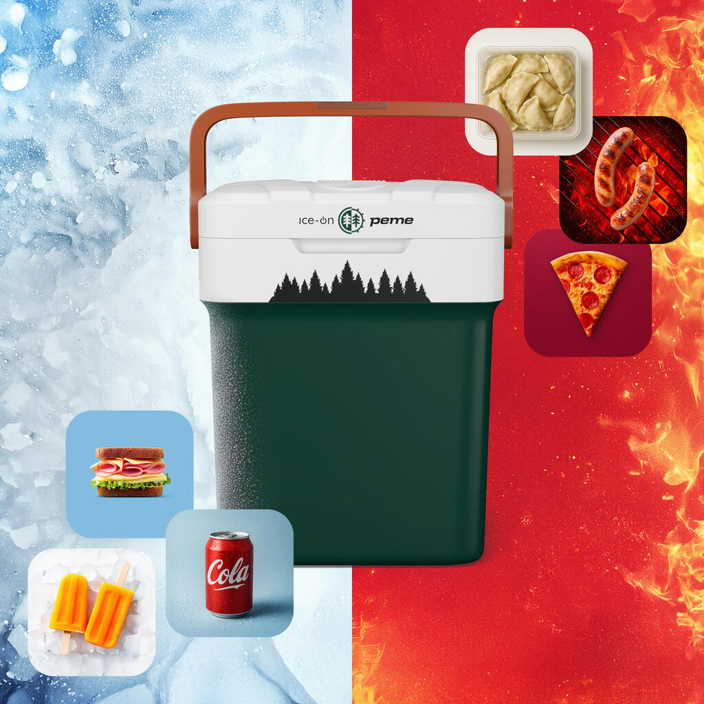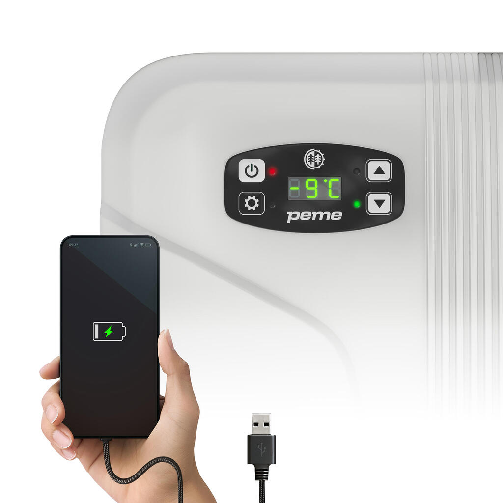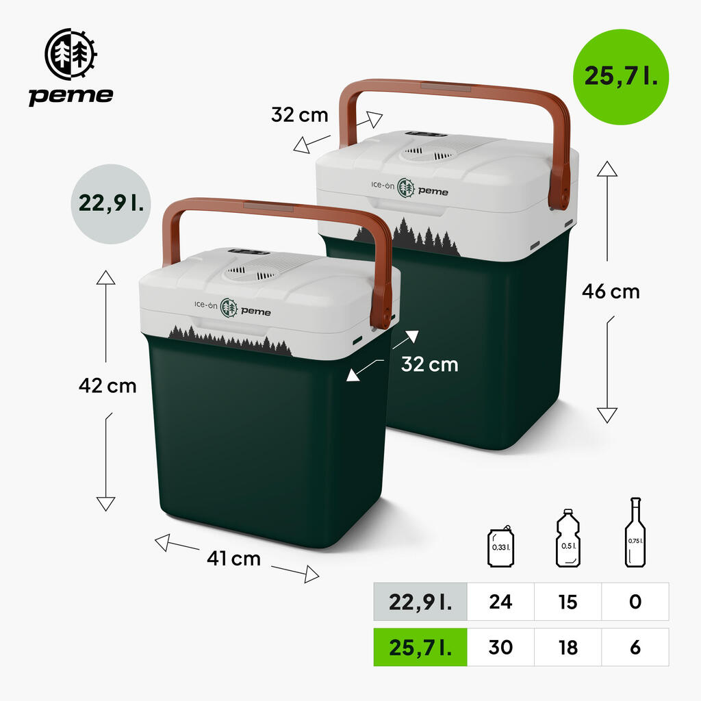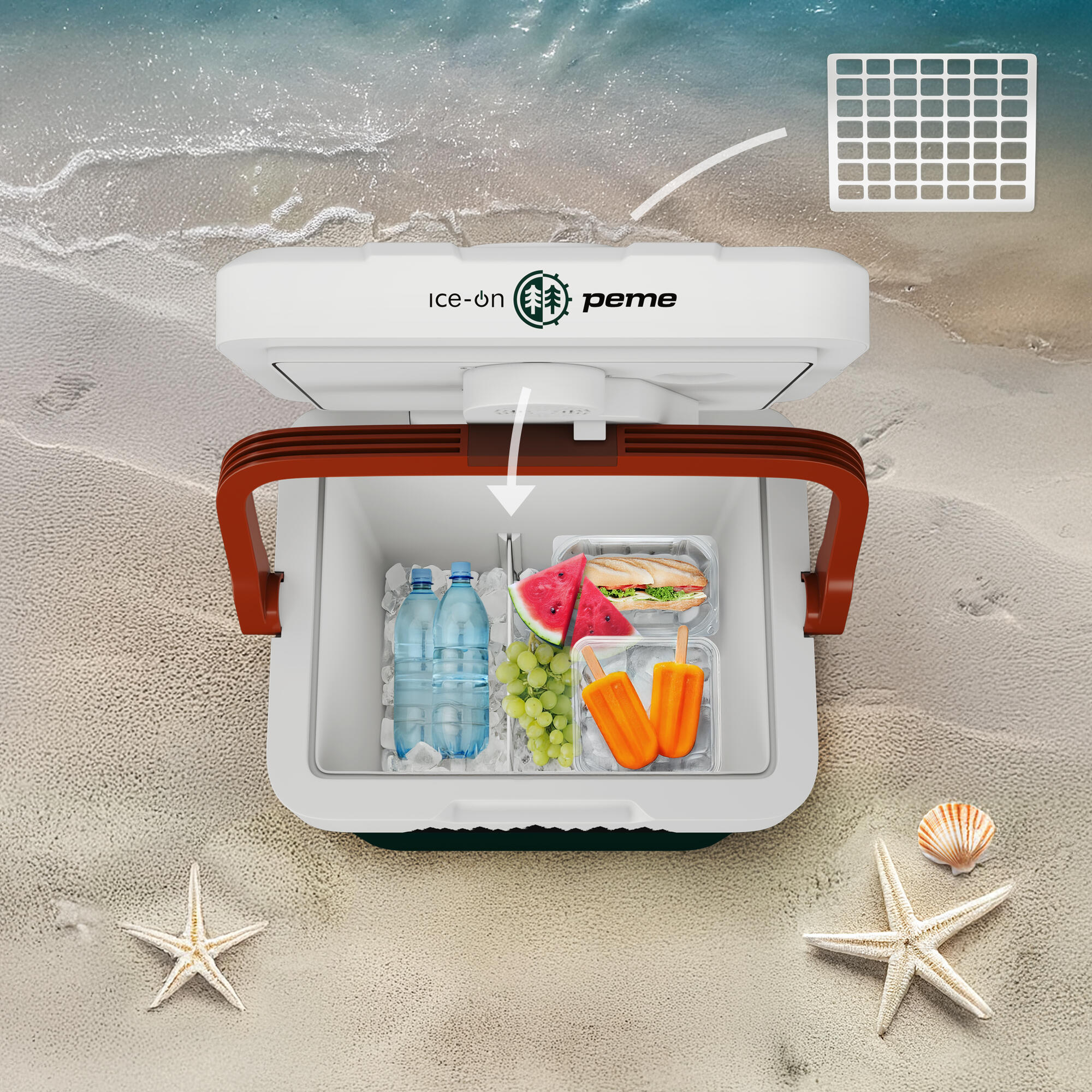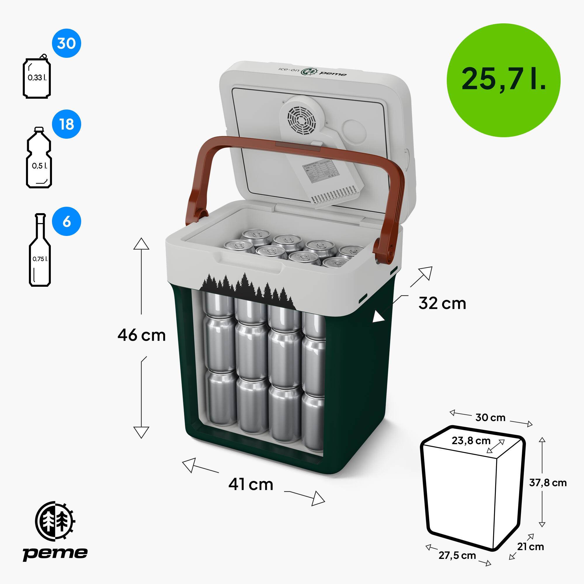 Peme Essential 32 – 25.7L thermo-electric cooler. Keeps food 14–18°C cooler or 60–65°C warmer. AC/DC powered, USB port, ultra-quiet 26 dB. Perfect for travel!