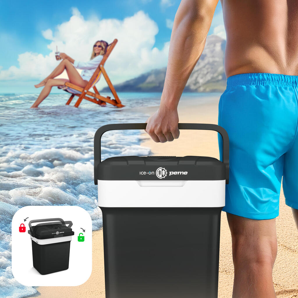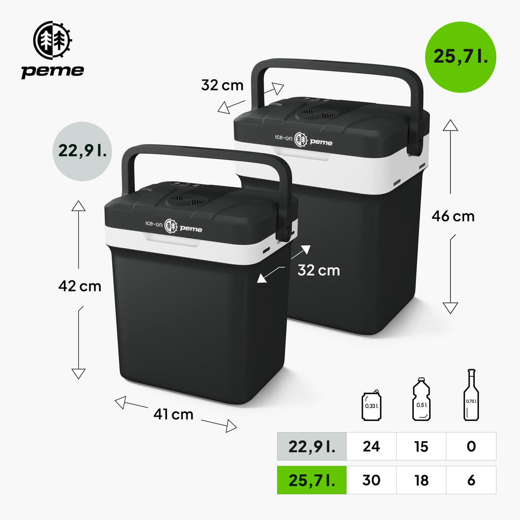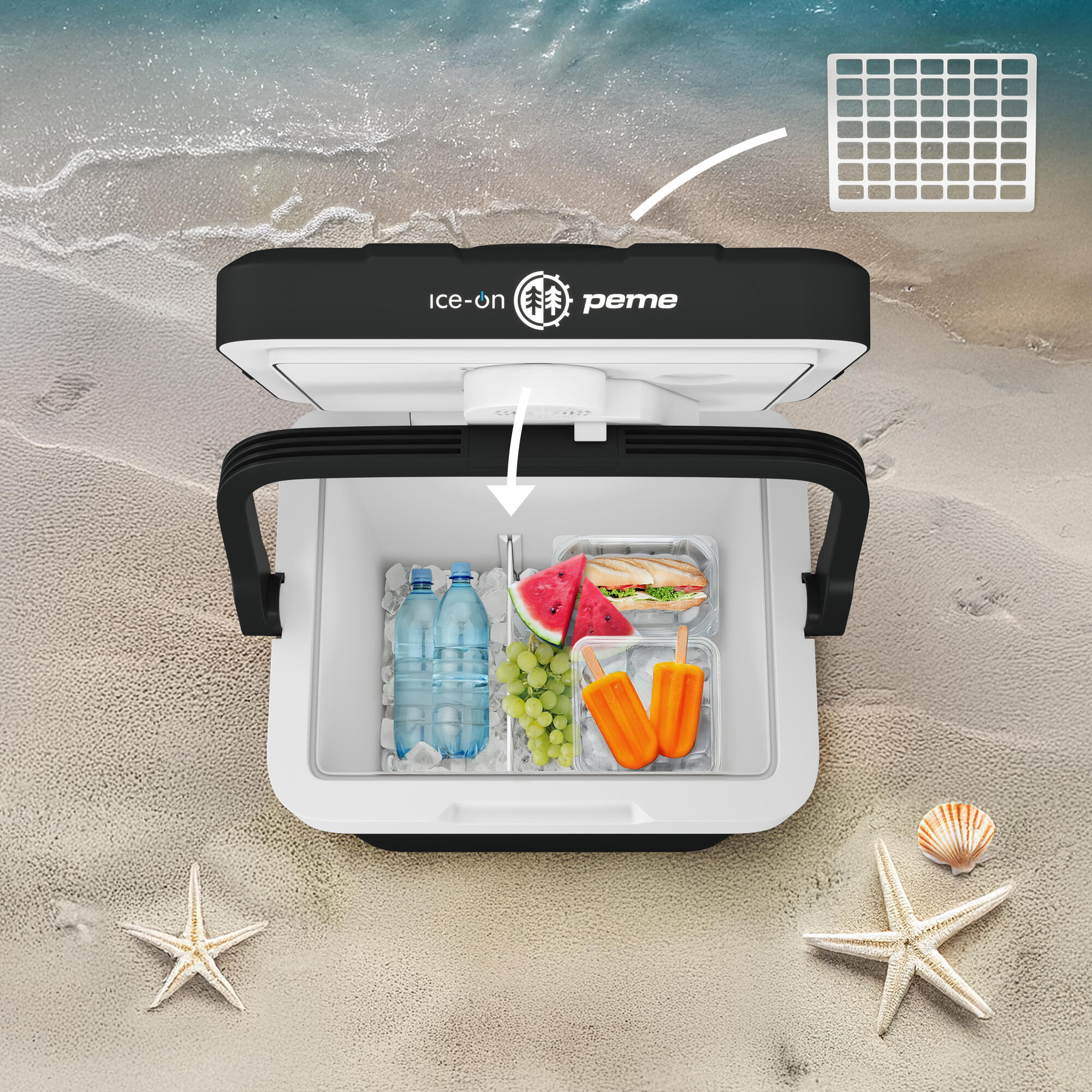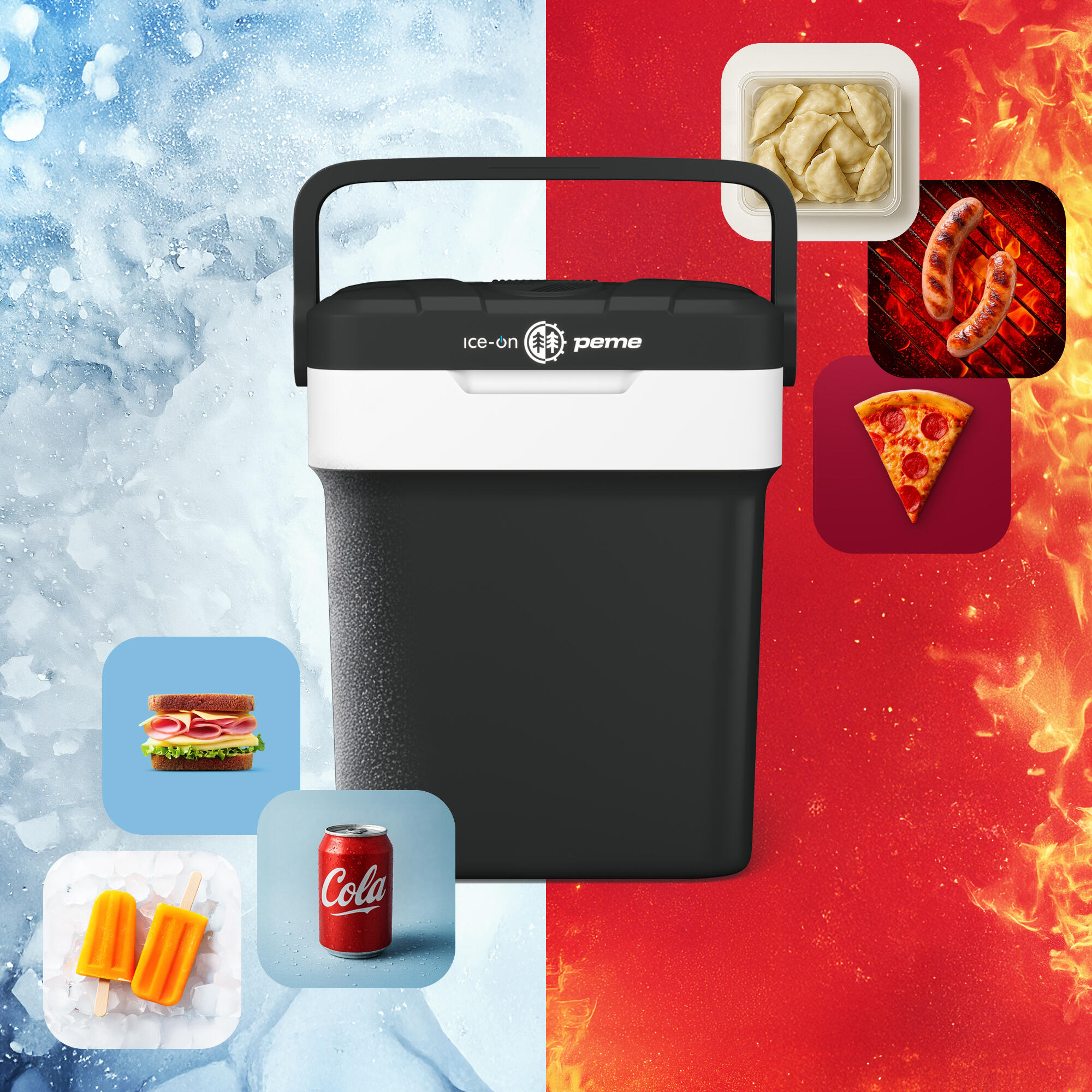 Peme Essential 32 – 25.7L thermo-electric cooler. Keeps food 14–18°C cooler or 60–65°C warmer. AC/DC powered, USB port, ultra-quiet 26 dB. Perfect for travel!