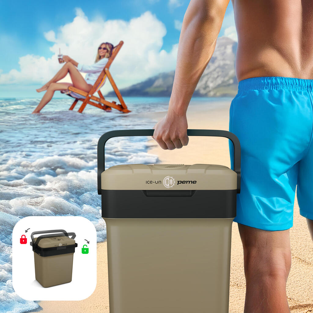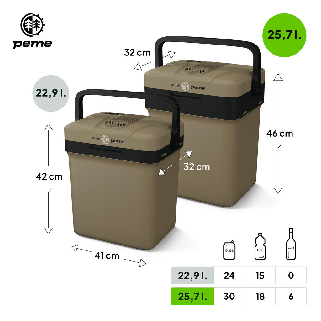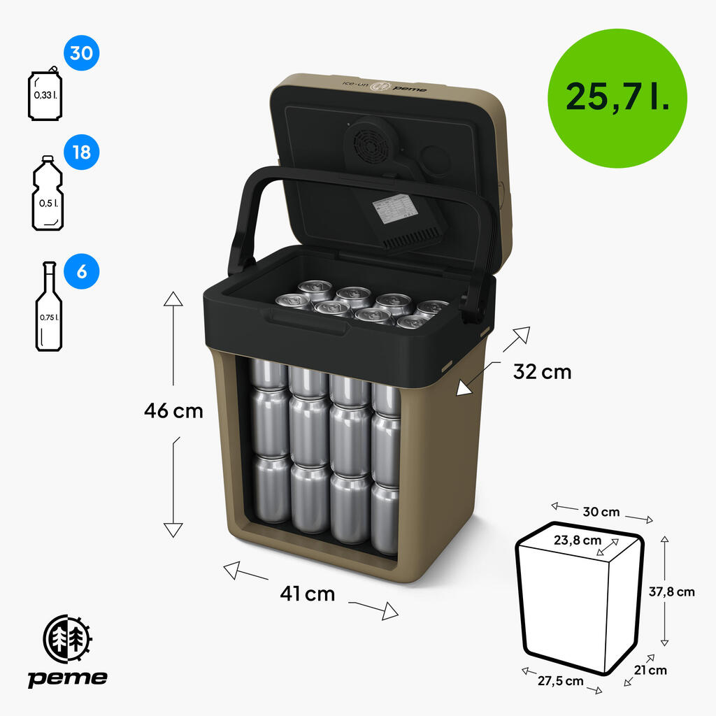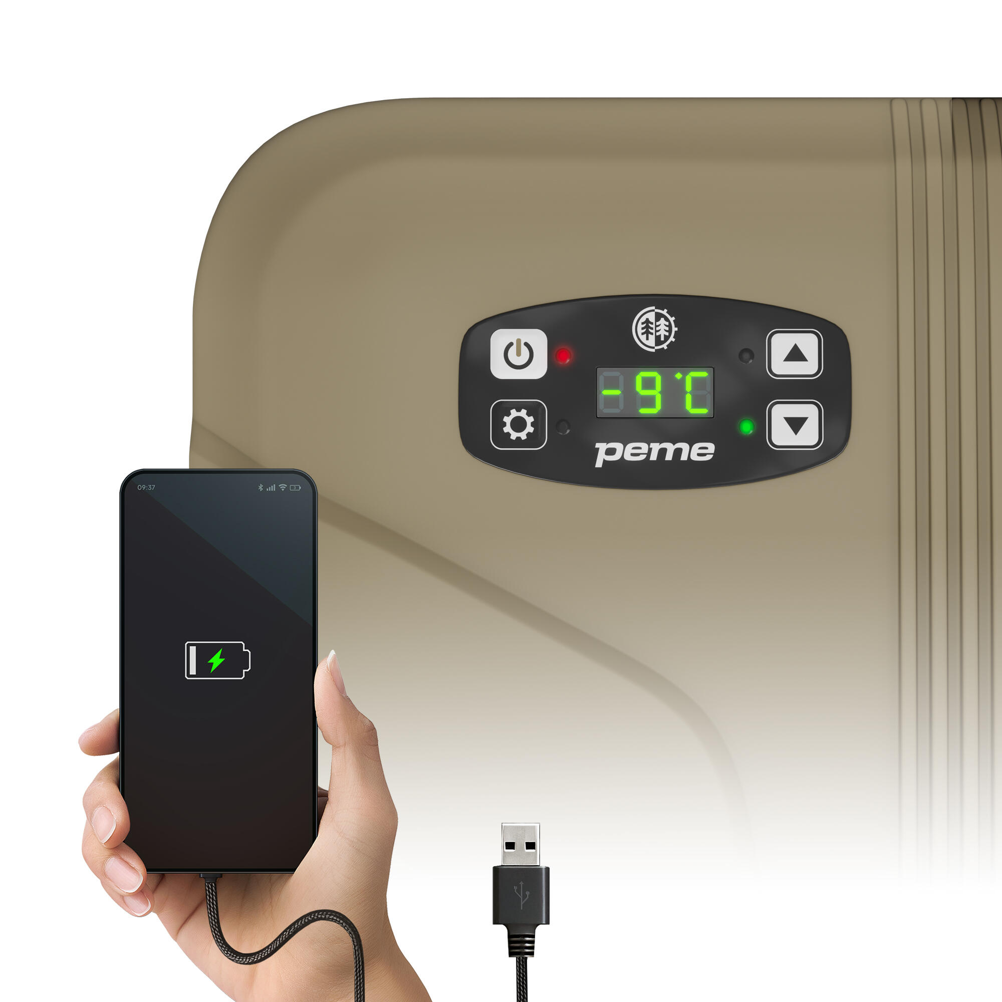 Peme Essential 32 – 25.7L thermo-electric cooler. Keeps food 14–18°C cooler or 60–65°C warmer. AC/DC powered, USB port, ultra-quiet 26 dB. Perfect for travel!
