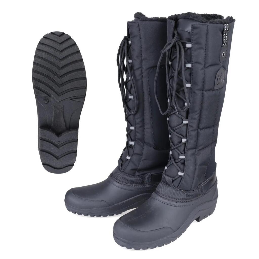Warm boots for the stable and horse! The winter thermal boot 'Happy Boot Kärnten' is a reliable partner for use in the stable during the colder months of the year. It is designed to focus on practicality and comfort. A back zip makes it easy to put on and take off. The waterproof feature of the boot extends to the zip for added protection. A lacing at the front allows for individual adjustment to the leg shape, ensuring optimal insulation. The entire inner lining of the boot, including the foot area, is lined with synthetic fur, contributing to thermal insulation. The sides of the shaft facing the horse are covered with a smooth, durable layer of material to withstand heavy use. In addition to the zipper, an elastic element runs along the entire shaft, providing flexibility and making it suitable for people with stronger calves. The boot is made from a material composition that includes a lining made of 100% polyester, a synthetic sole, and a synthetic interior. Features: Easy to put on and take off, Waterproof to the zip, Sole with good grip, Individual adjustment to the leg shape, Synthetic fur for thermal insulation, Elastic element along the shaft.