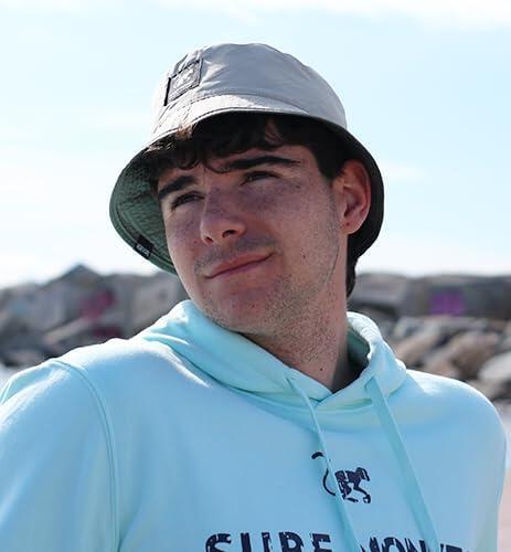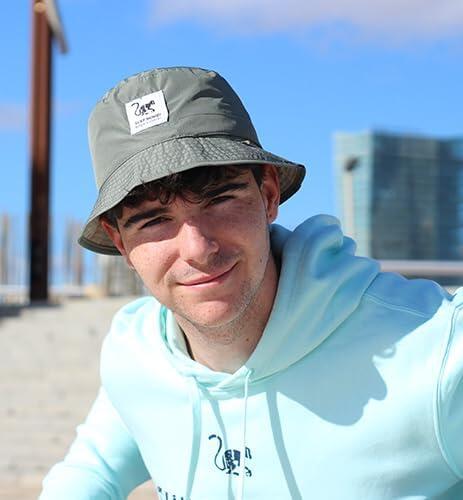 100% recycled polyester circular hat / Waterproof hat with side pocket / Reversible hat / One size - approx. 58cm. Inner pocket and outer hook. Hand wash.