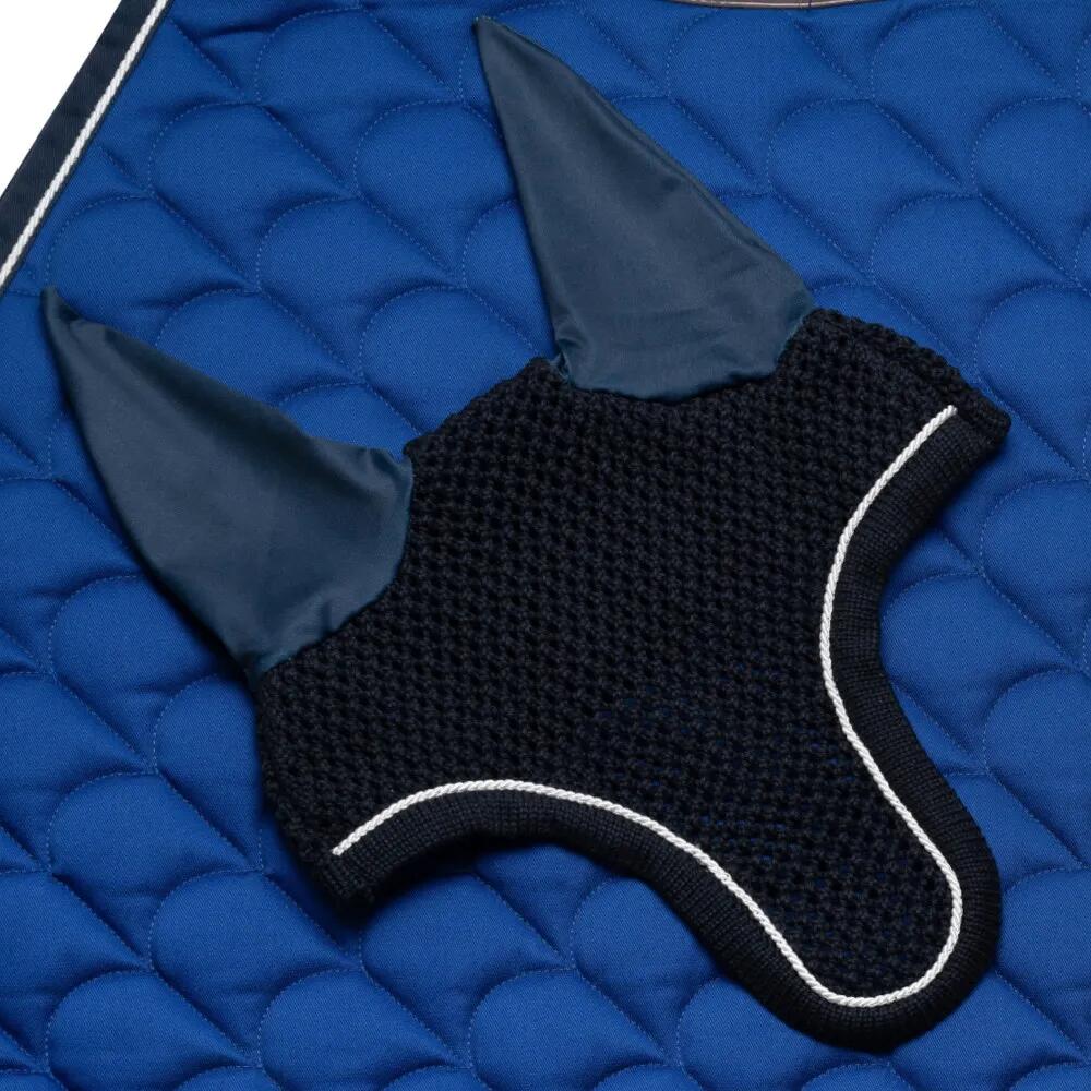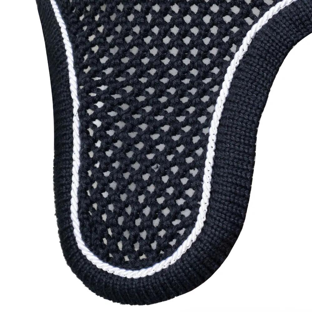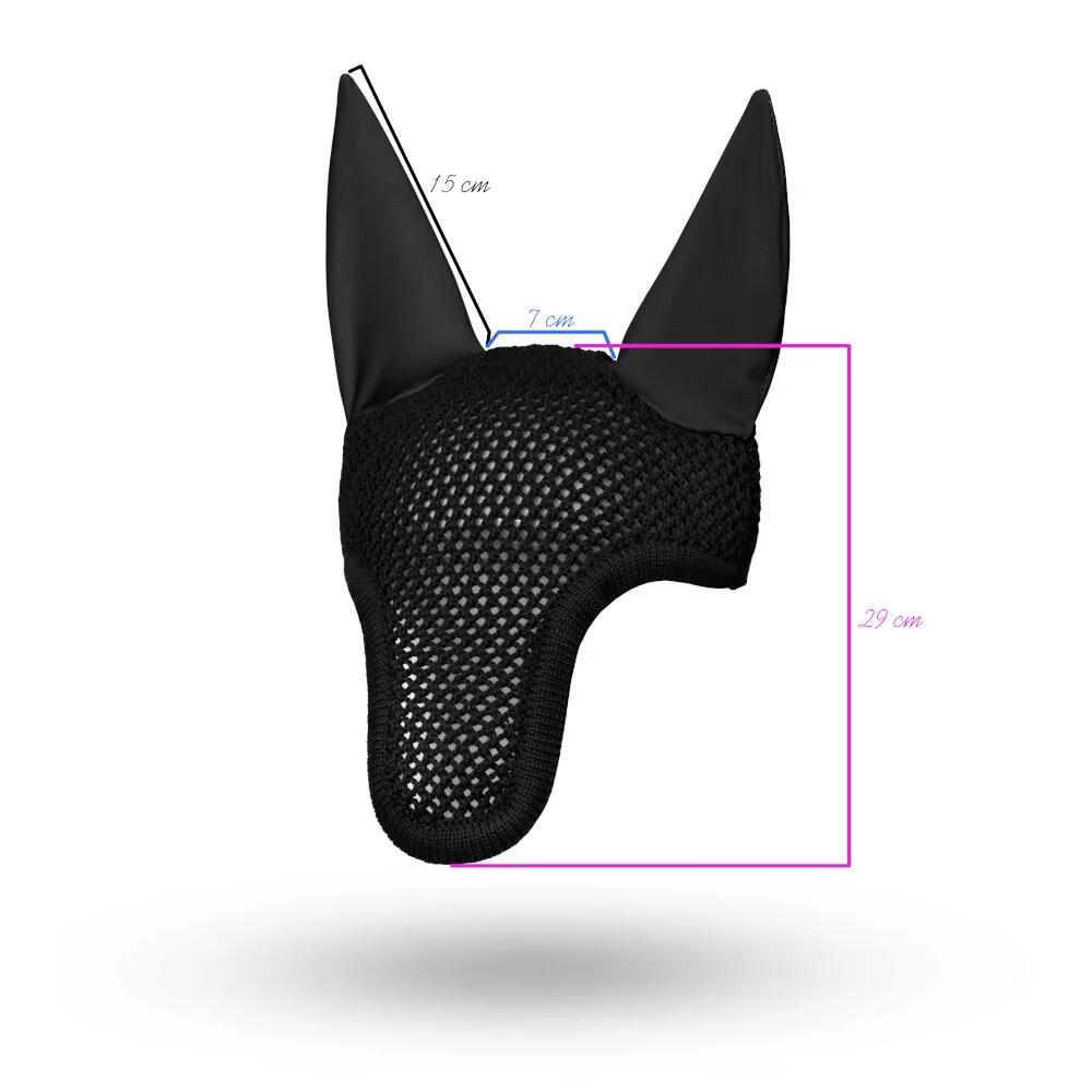Breathable crocheted ear bonnet with soft ear panels, insect and noise protection, and bold style—made in the EU for everyday rides and training.