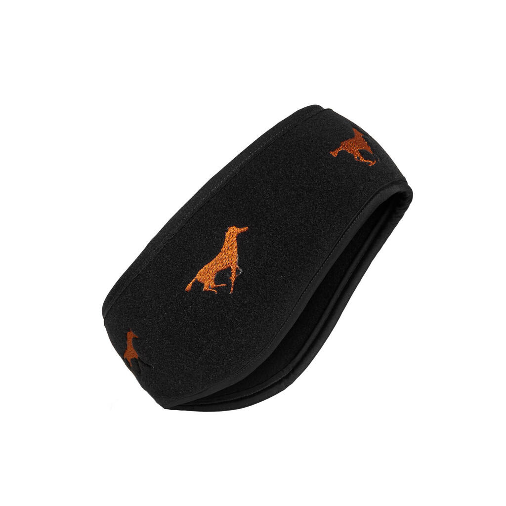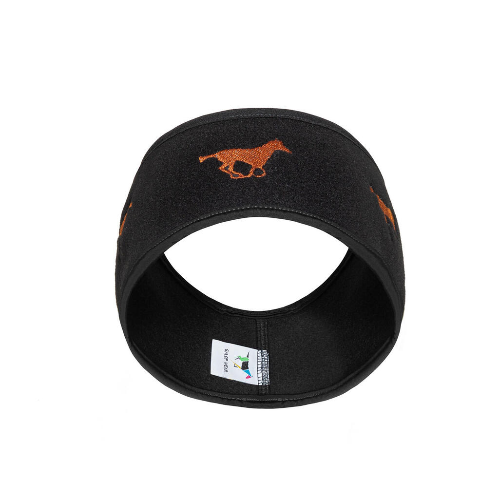 Warm EU-made fleece headband with embroidered galloping horses, perfect under a riding helmet for cold-weather training.