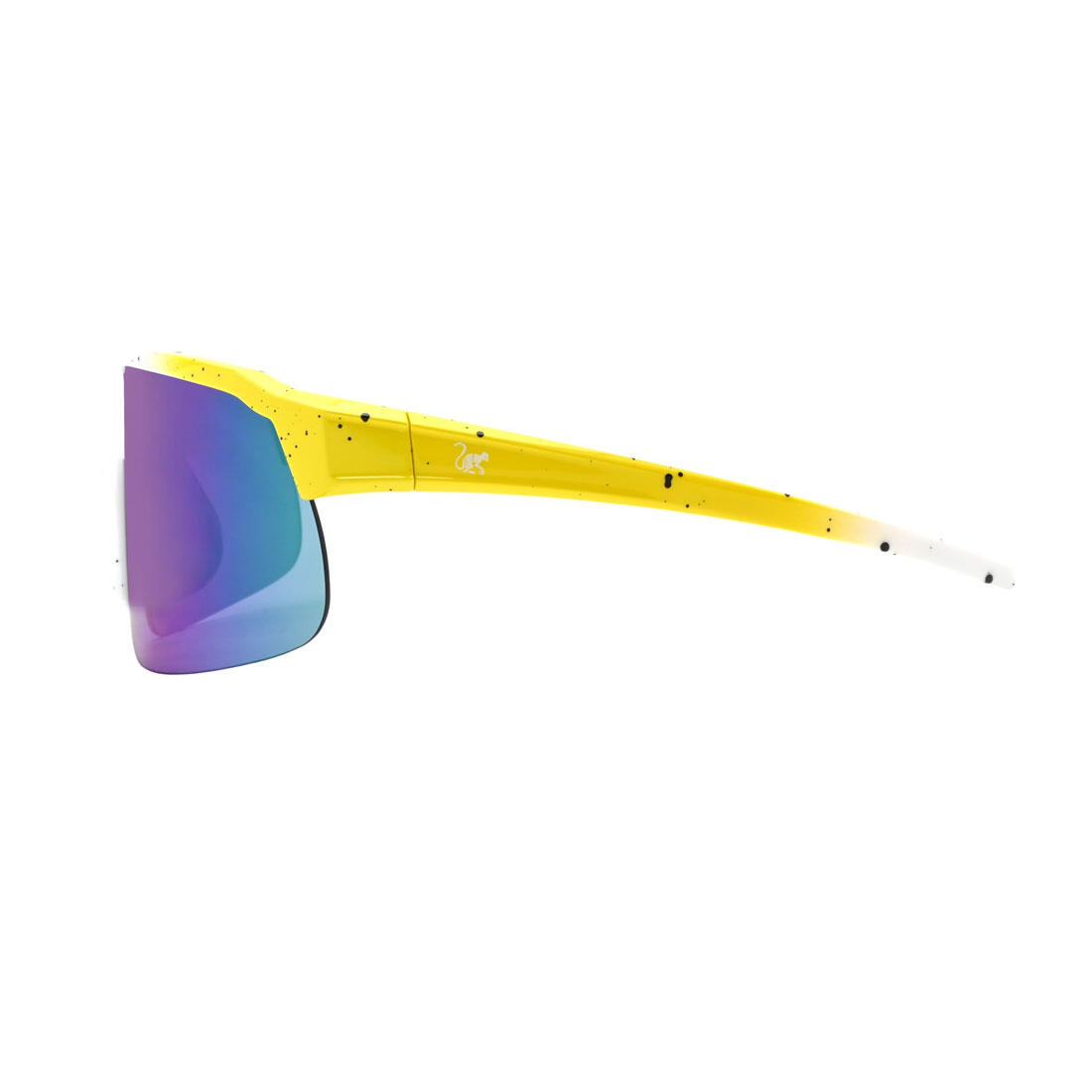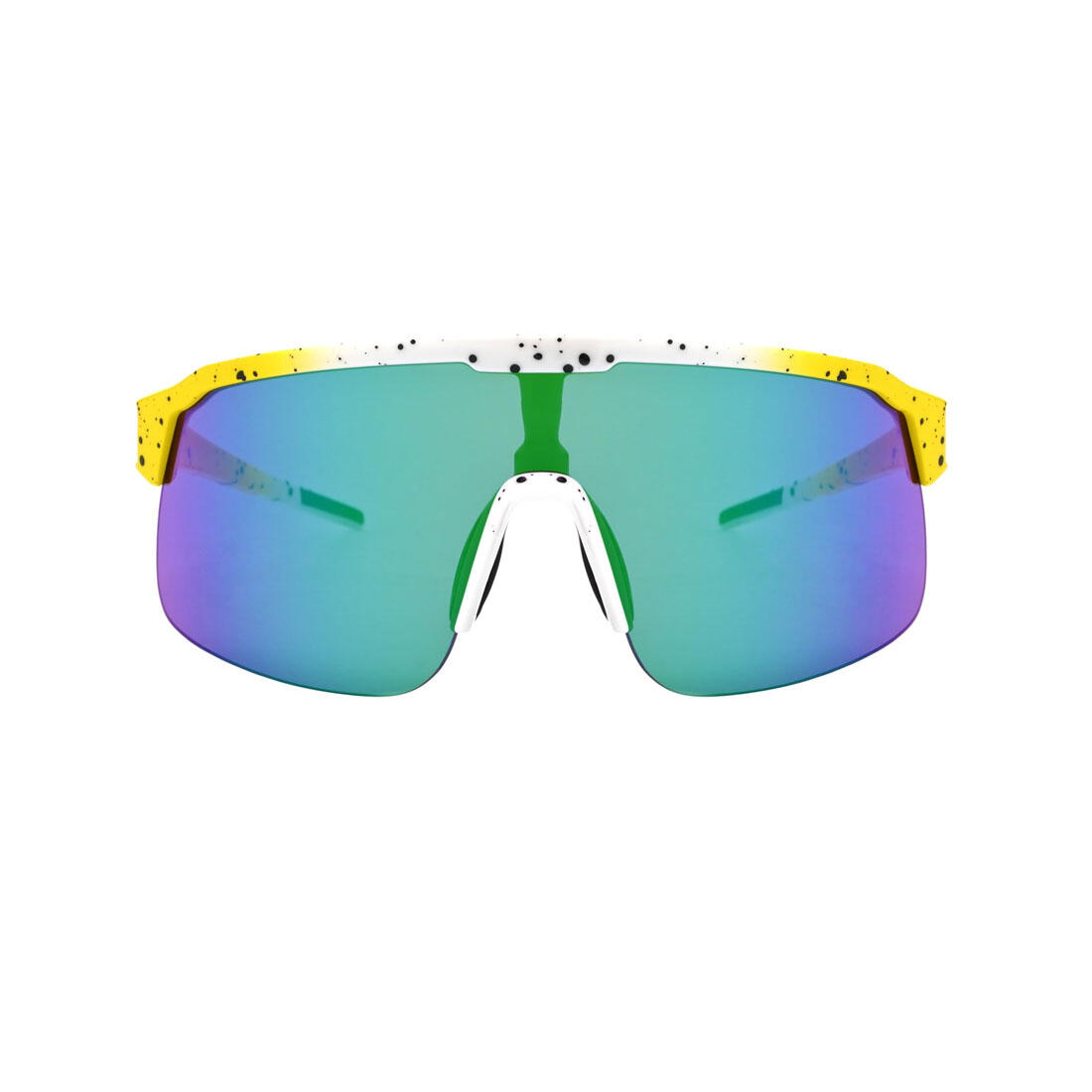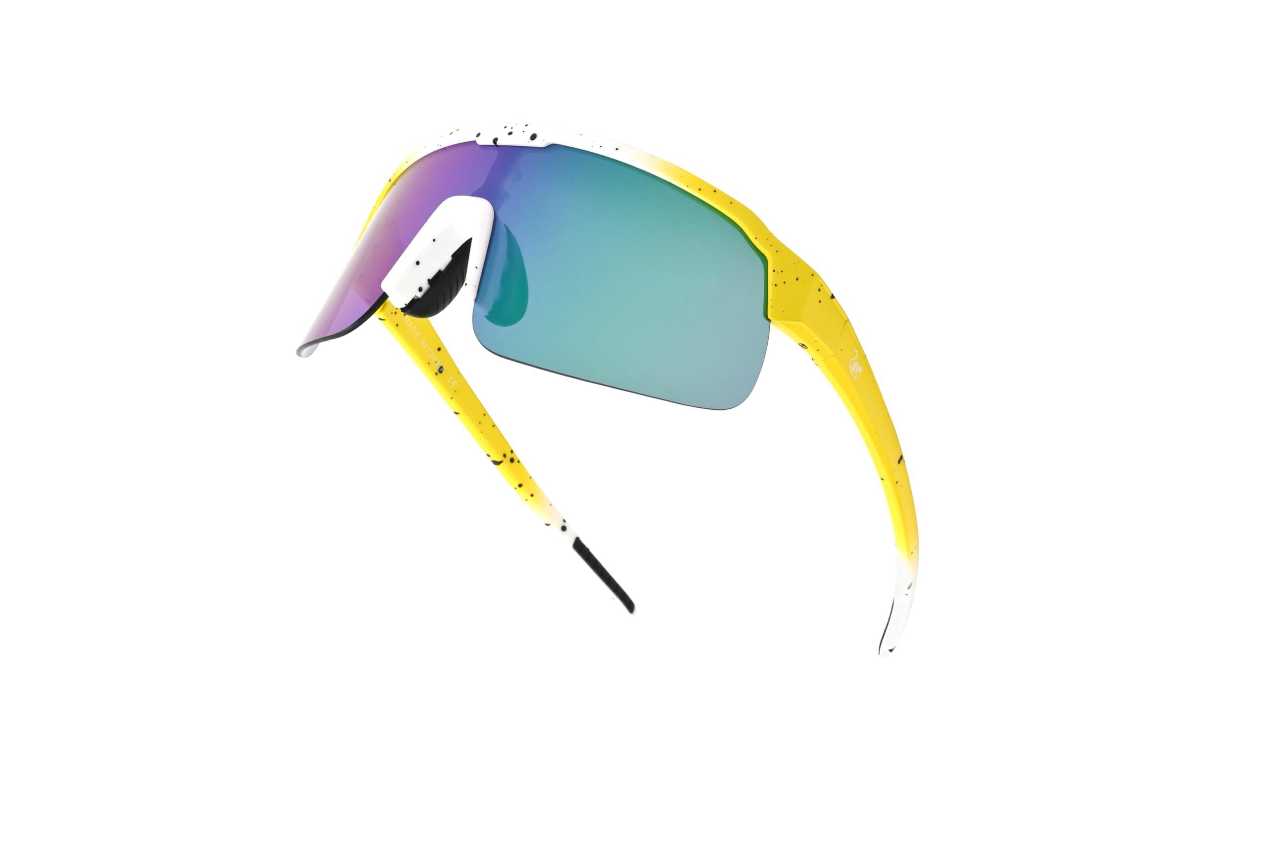 Ultra-light, flexible, and durable TR90 sunglasses. UV400 lenses block UV rays. Sporty design for cycling and running. Includes a pouch. Measurements: 16 x 6 cm, temples: 14 cm.