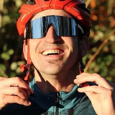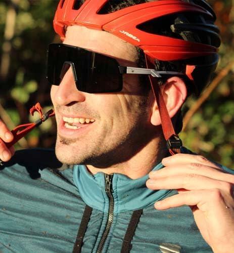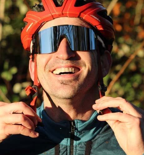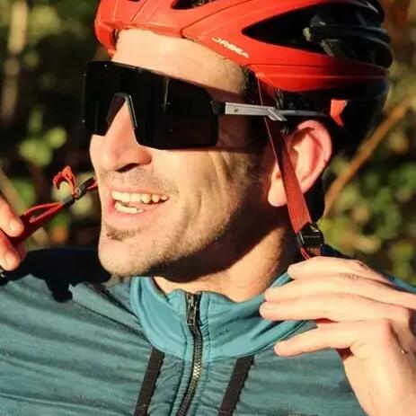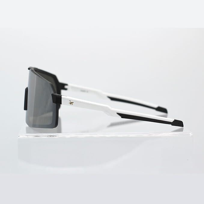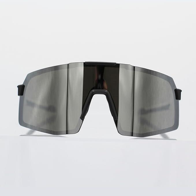 TR90 sunglasses with 3 interchangeable polarized UV400 lenses. Lightweight and durable, ideal for cycling and running. Includes case, pouch, and 3 lenses. Measurements: 14.5x6 cm, temples 13 cm.